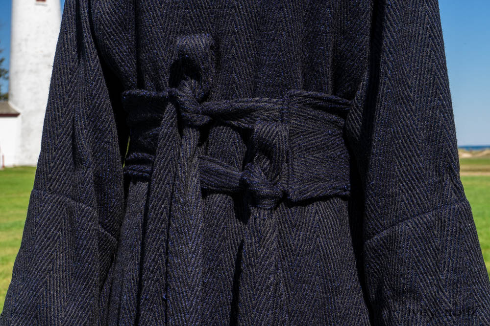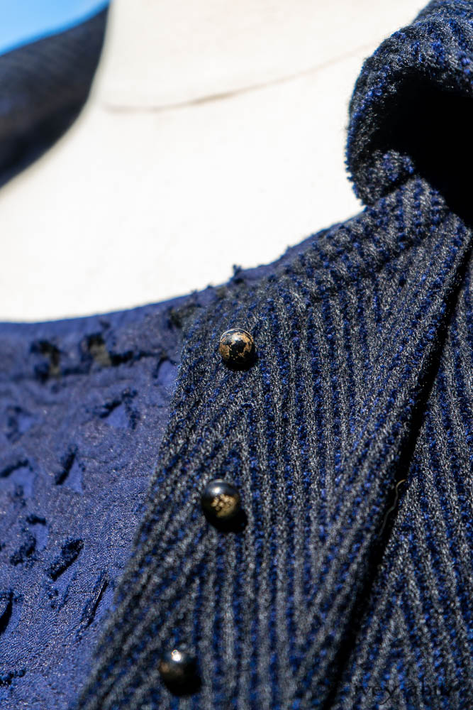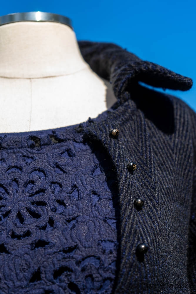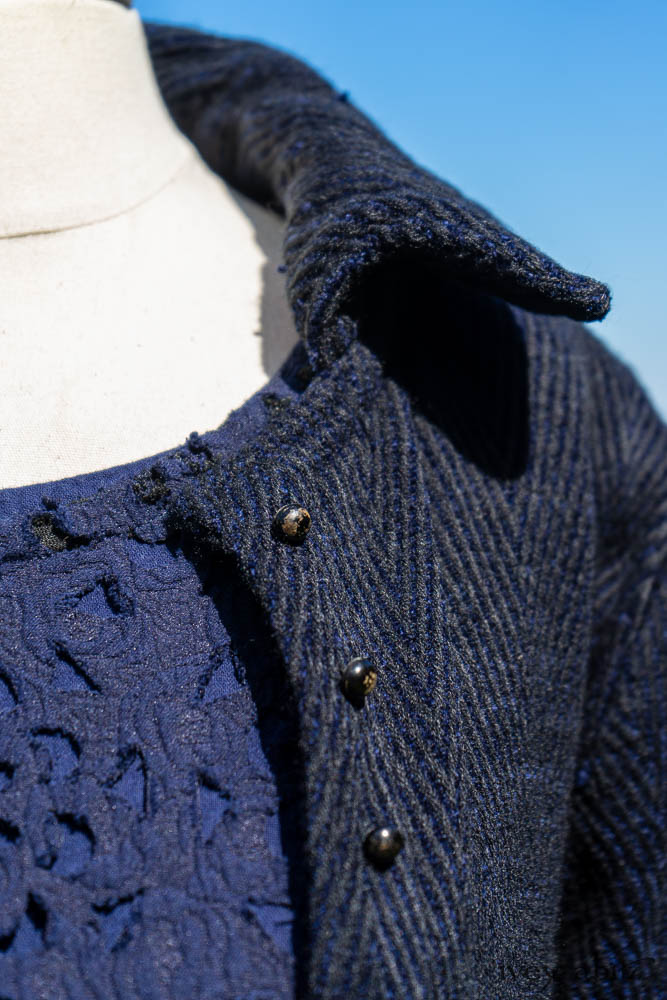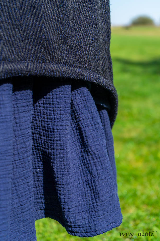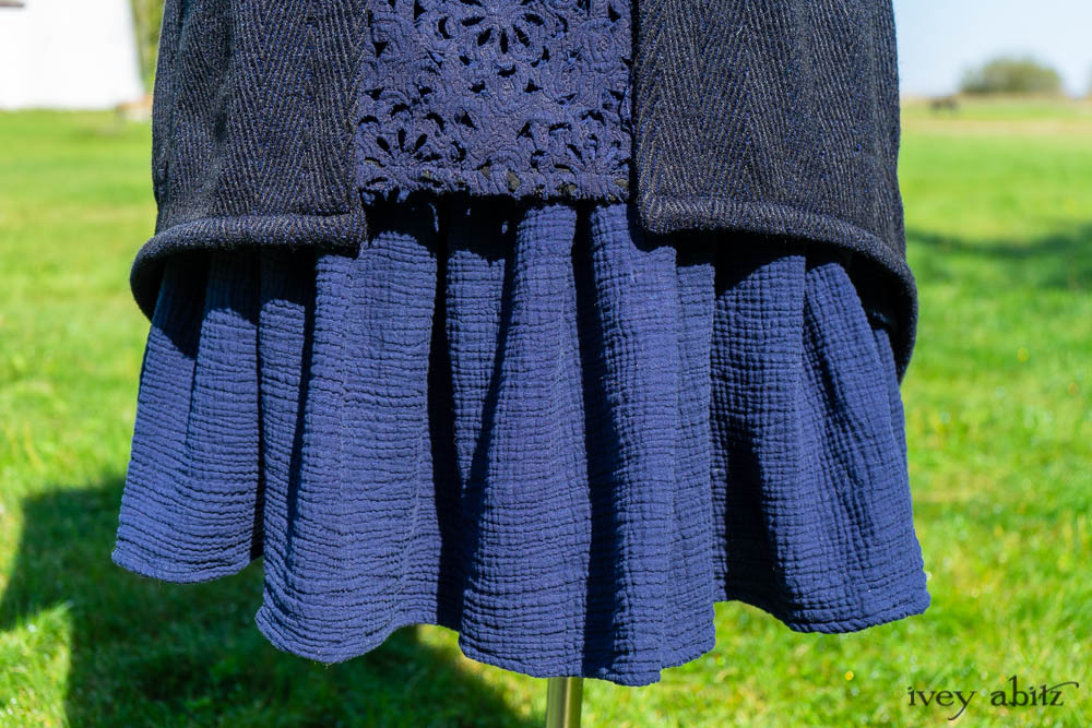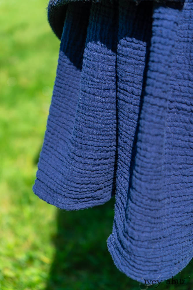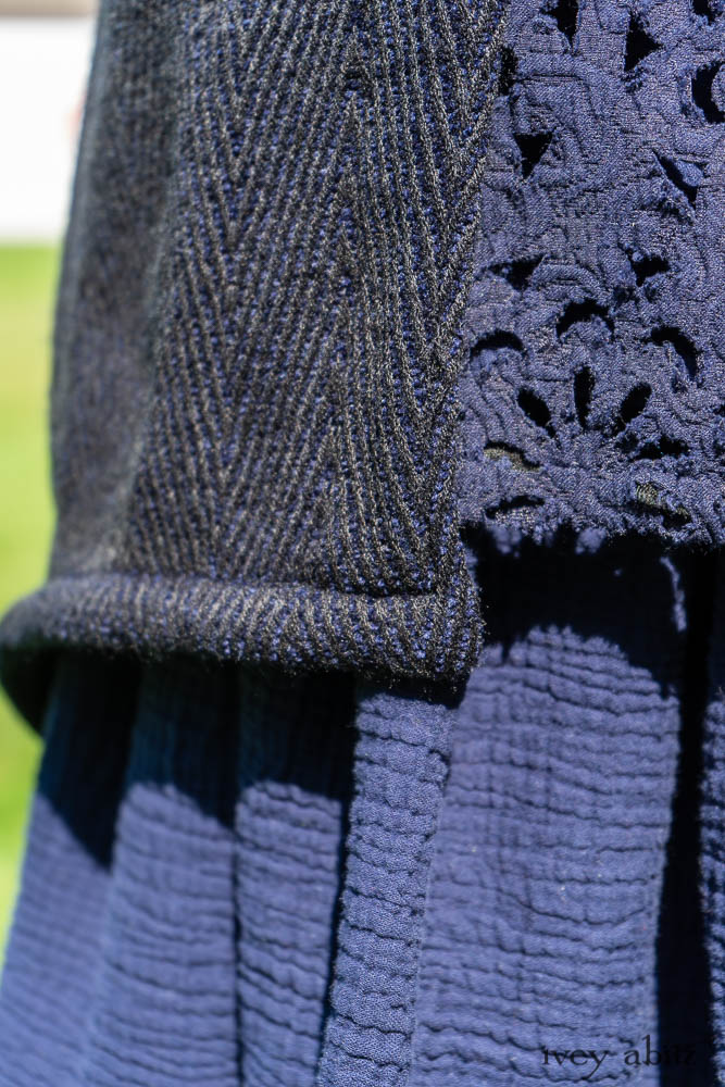 Elsie Duster Coat in Ocean Steamer Herringbone Chenille; Wildefield Frock in Ocean Steamer Cut Floral Knit; Blanchefleur Frock in Ocean Steamer Double Crinkled Gauze.
