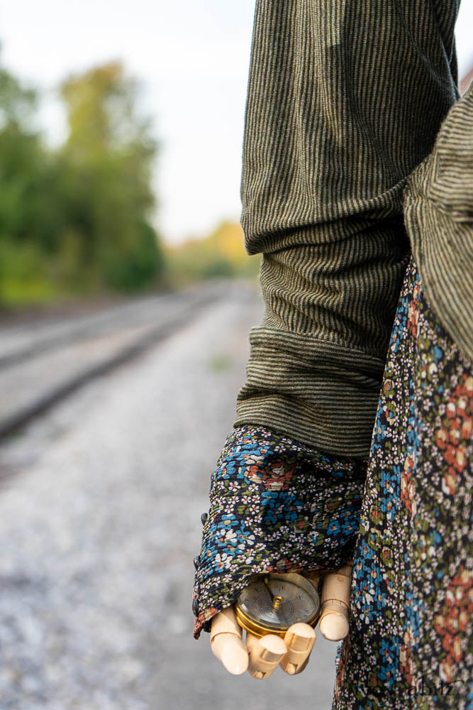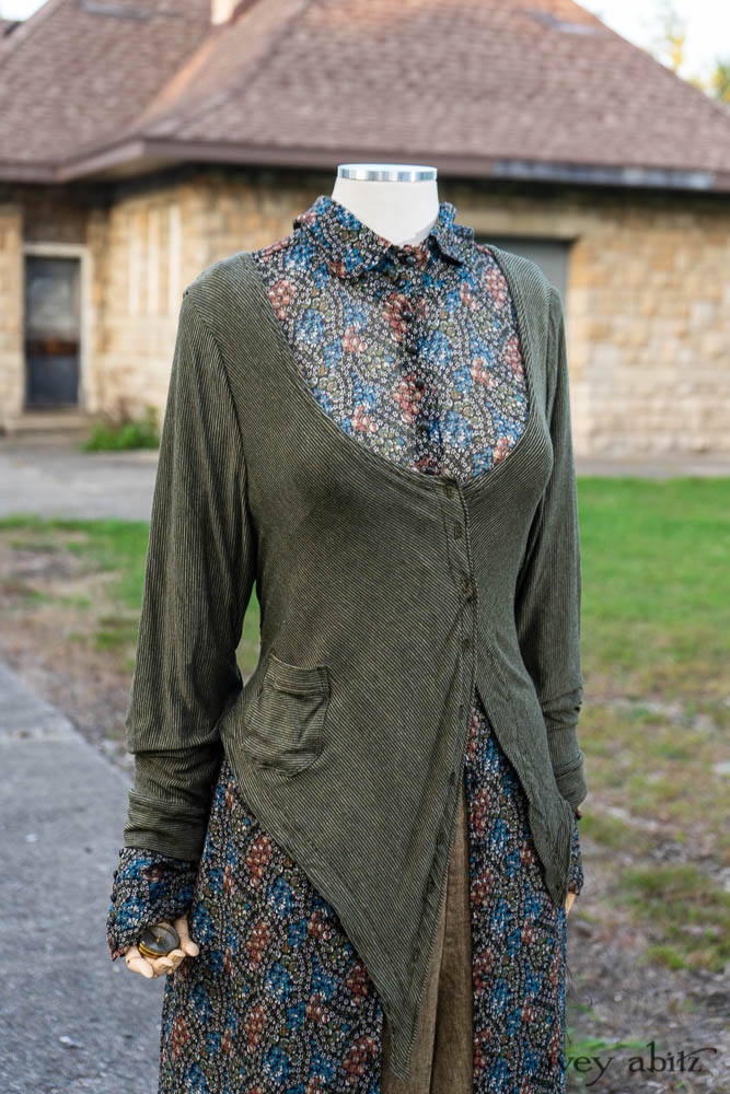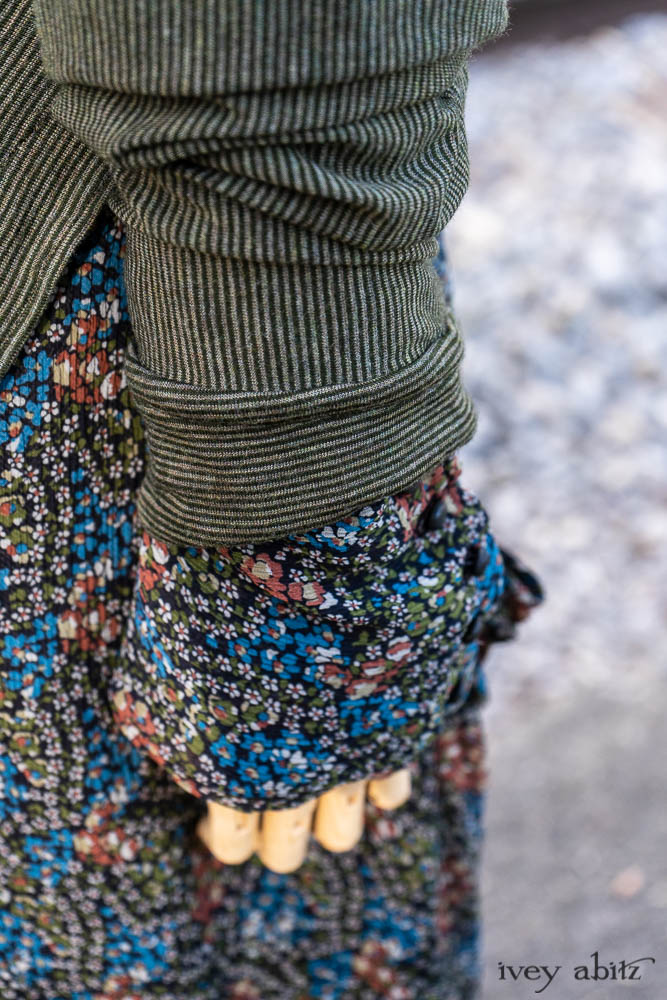 Limited Edition Gilbert Cardigan in Woodland Trail Softest Stripe Knit; Coulson Coat Dress in Woodland Trail Floral Silk Chiffon; Cilla Camisole in Saddle Melange Knit; Chevallier Trousers in Saddle Herringbone Linen.