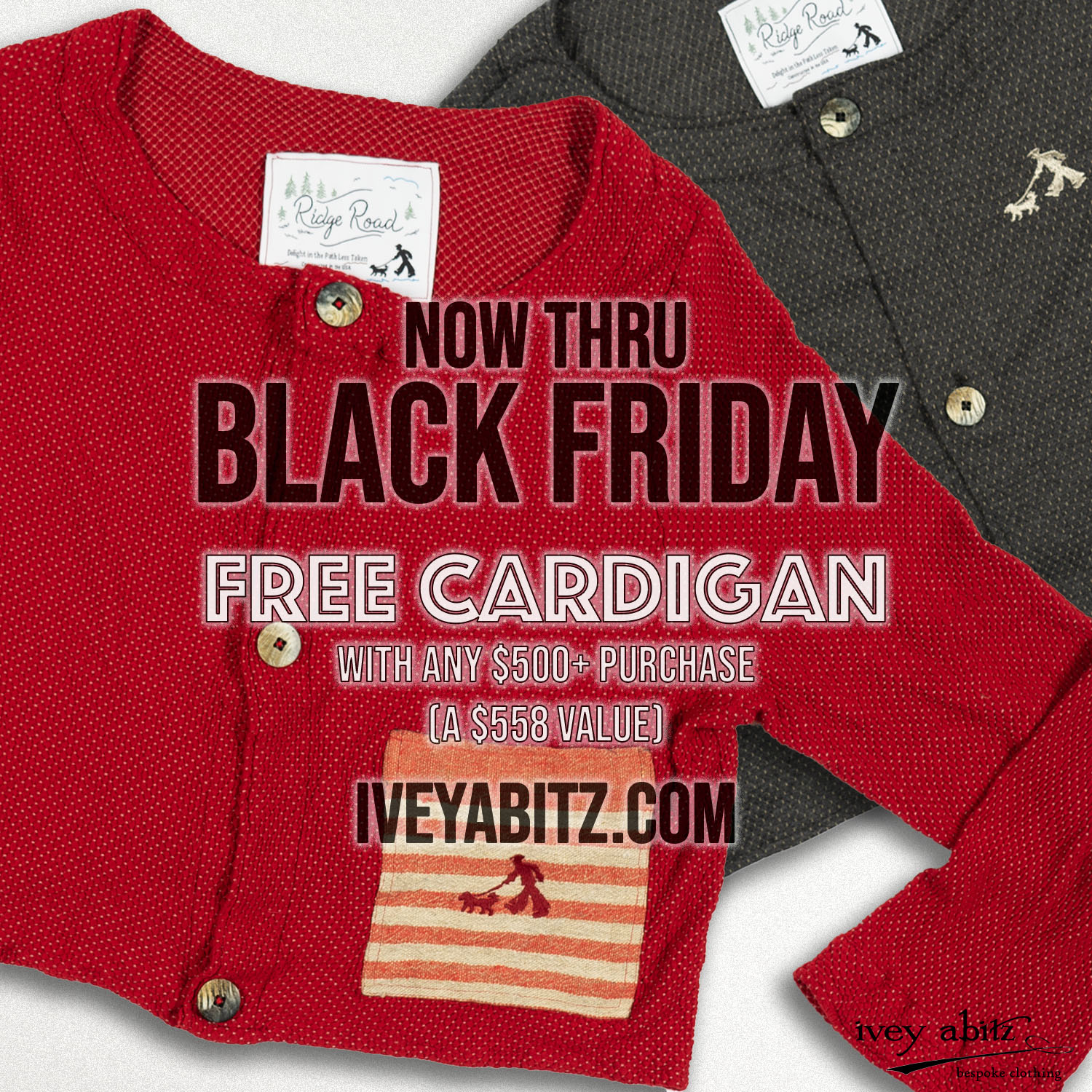 Purchase $500 or more from any collection on iveyabitz.com and receive a complimentary cardigan from the Ridge Road Collection. A value of $558.