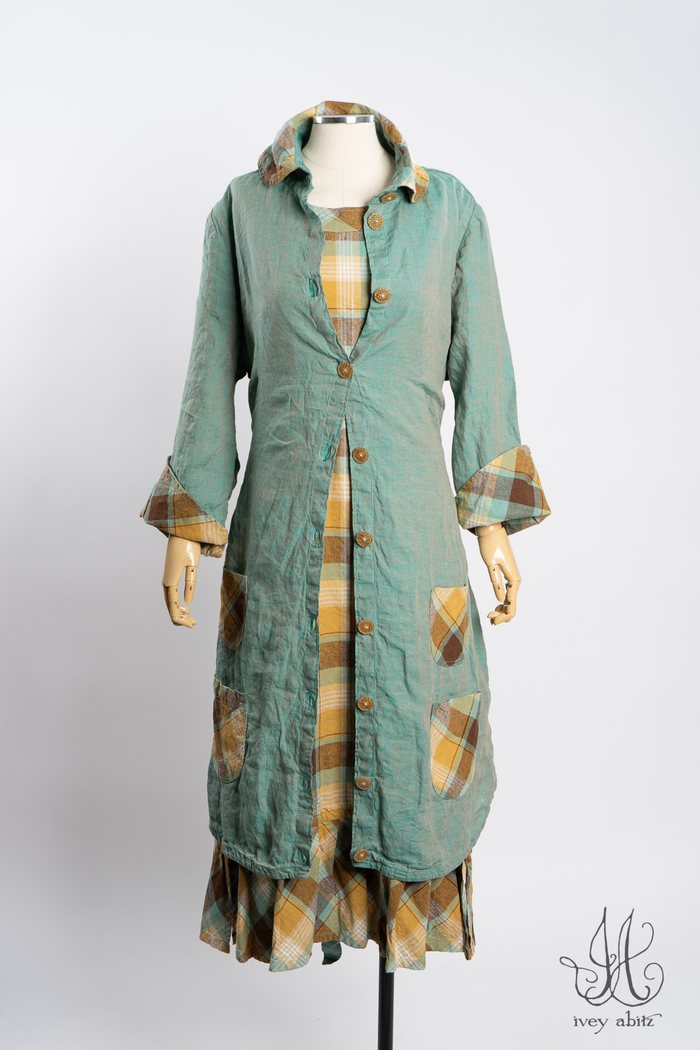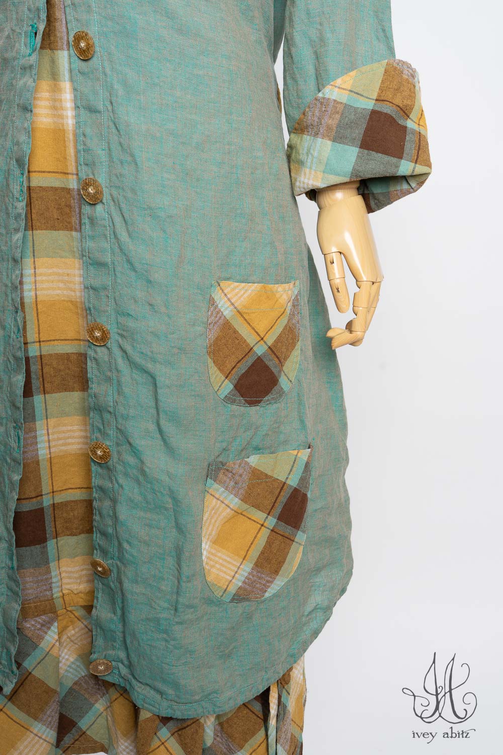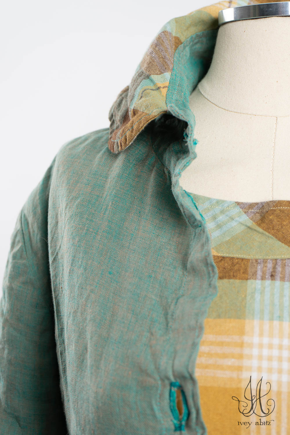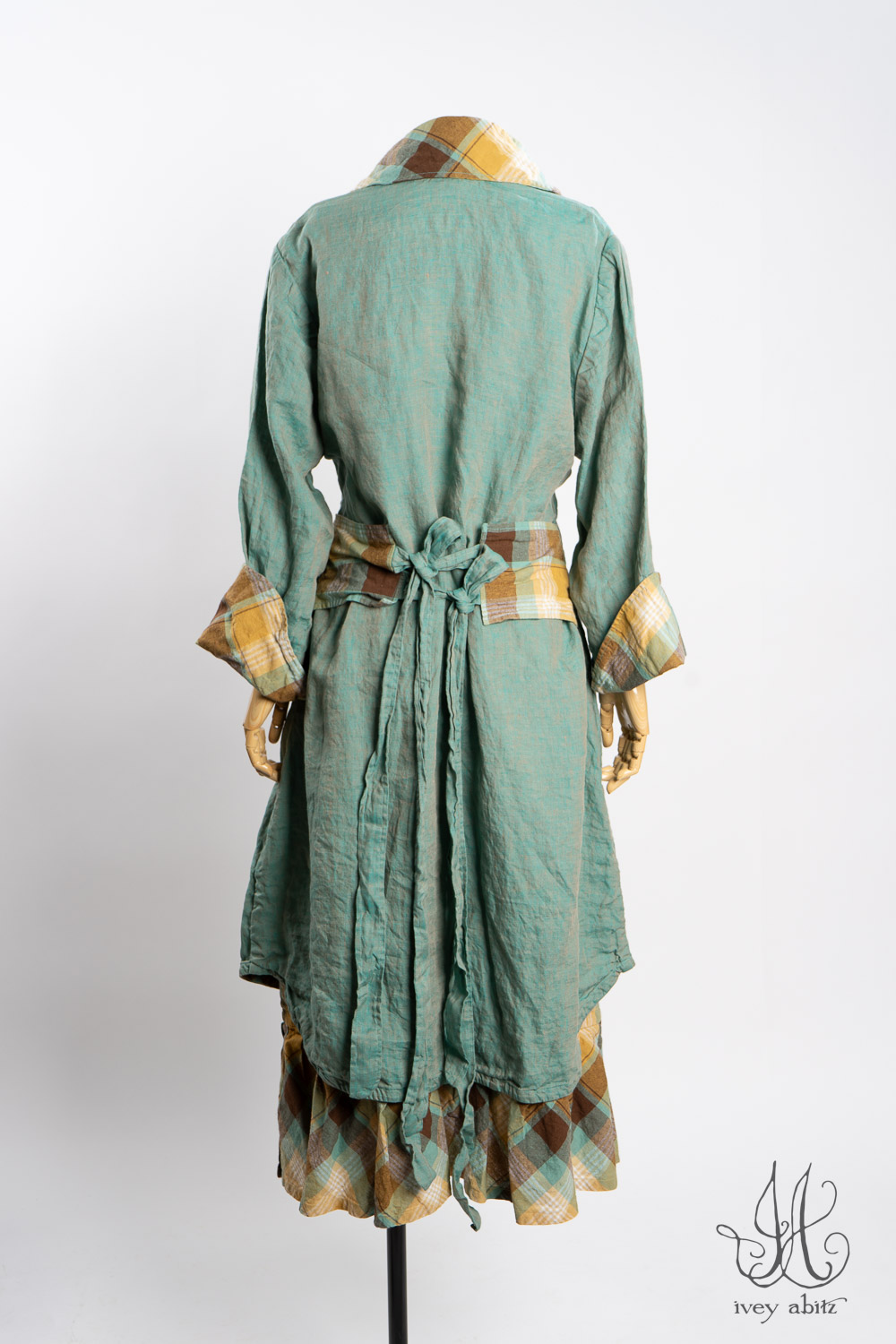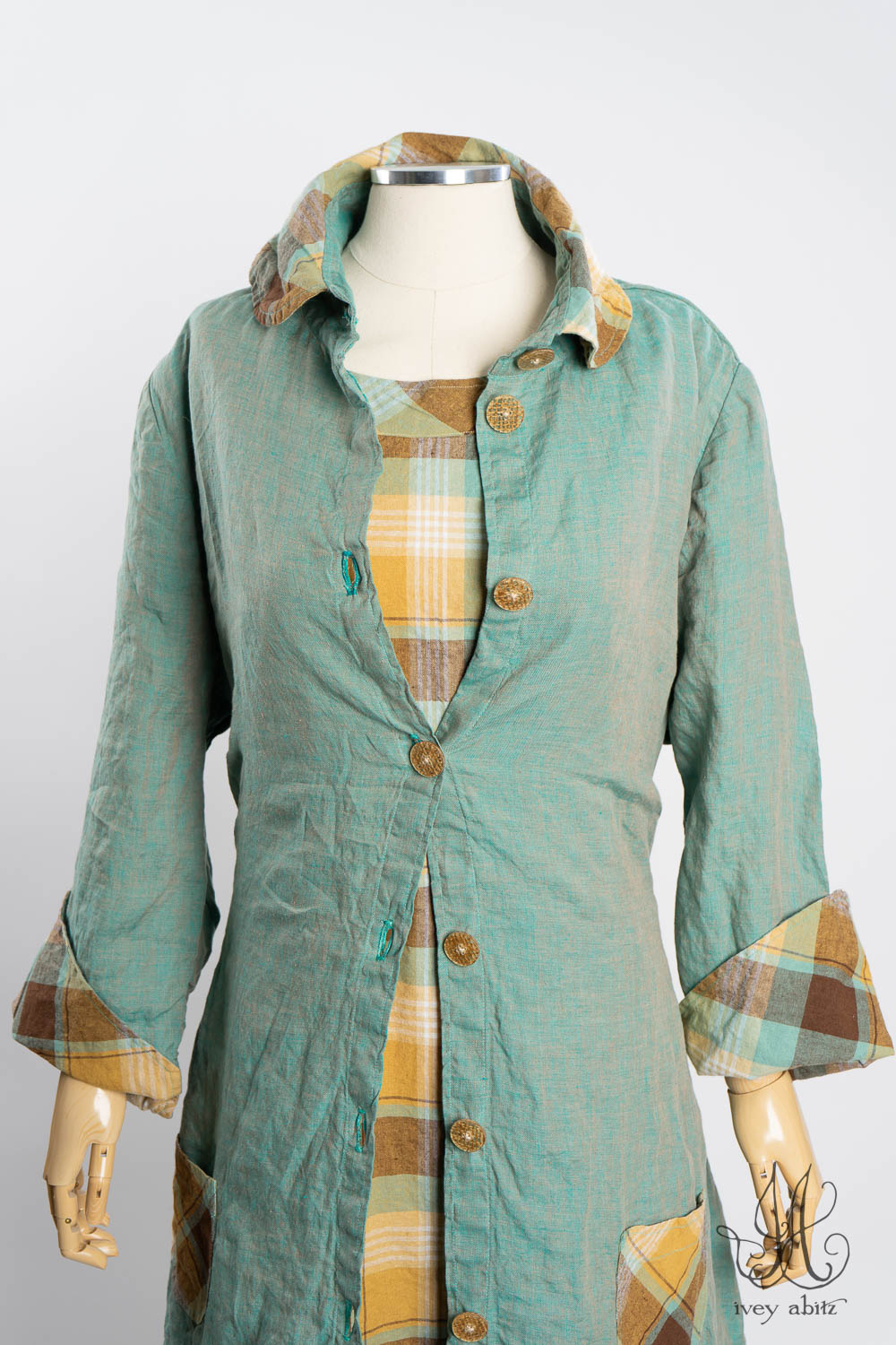 - Rosemarie Duster Coat in Sea Foam Washed Weave with Plaid Detail