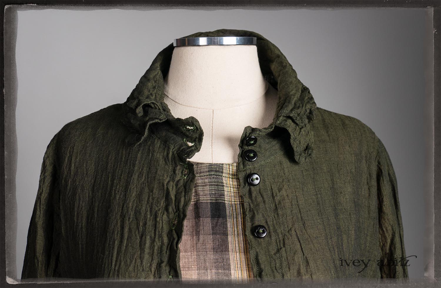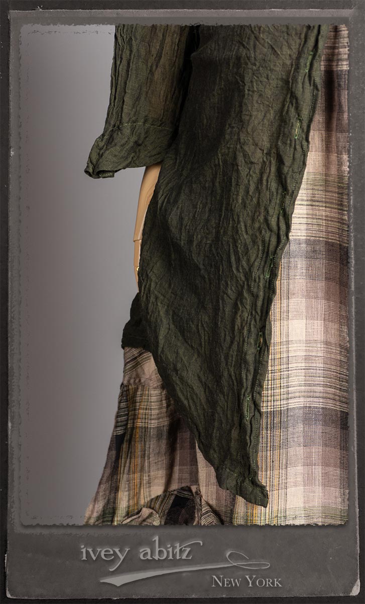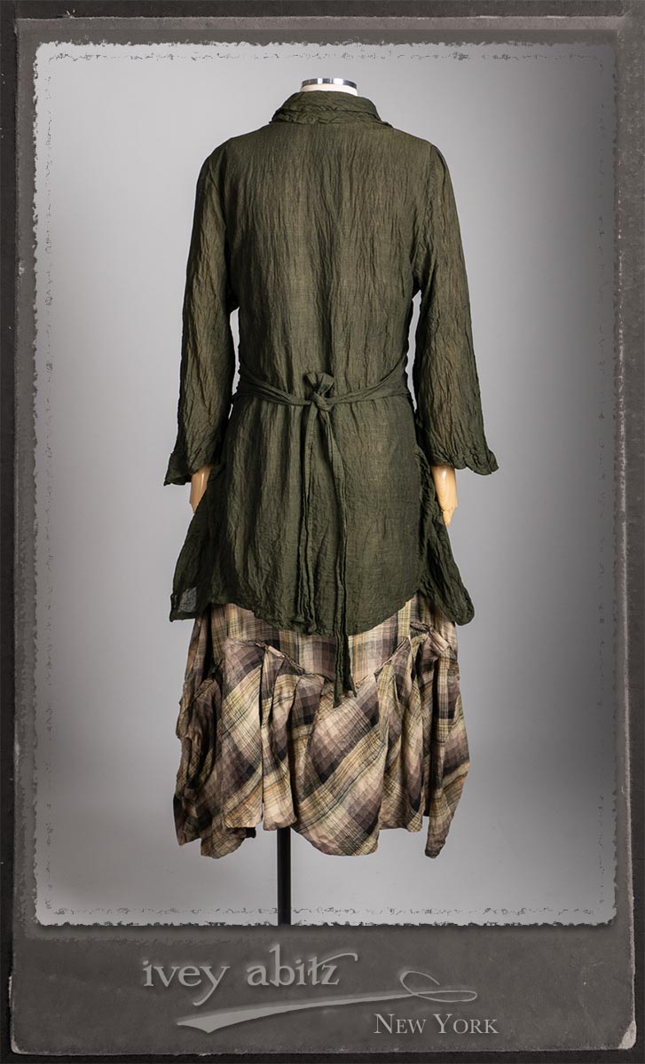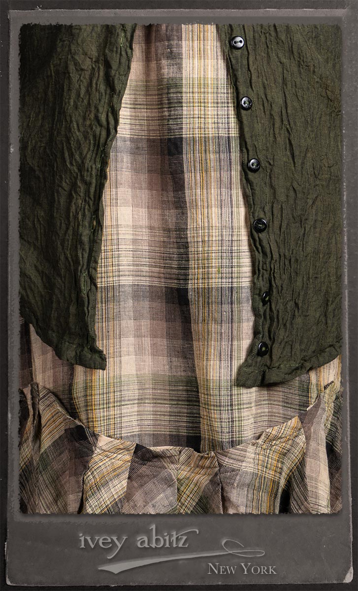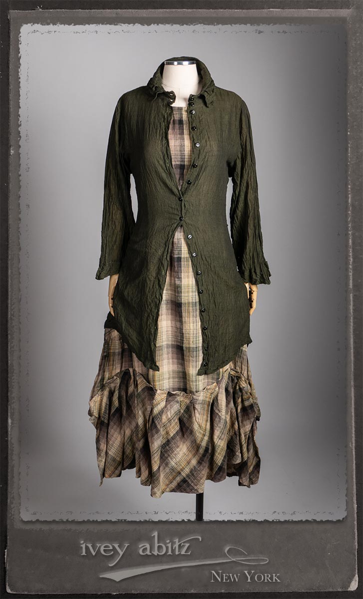 Inglenook Shirt Jacket in Signature Arthurian Green Washed Voile; Fairholme Frock in Garden Plaid Linen.