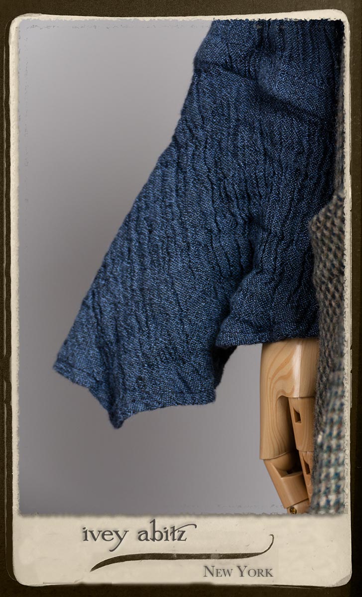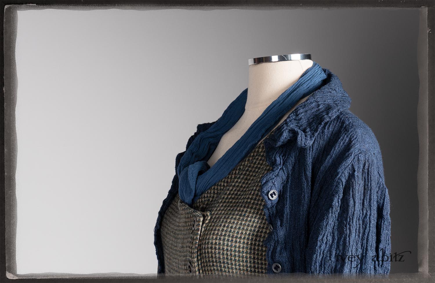 Crest Jacket in Hudson Blue Washed Crinkled Linen; Clotaire Sash in Express Line Crinkled Weave; Solomon Bag in Slate Petite Check Coating; Camille Frock in Woodland Trail Houndstooth Wool; Everett Frock in Uptown Raised Stripe Weave.