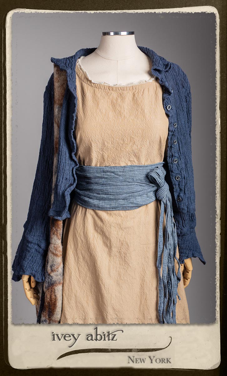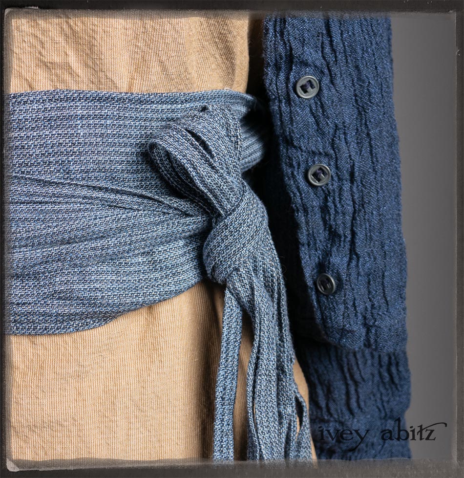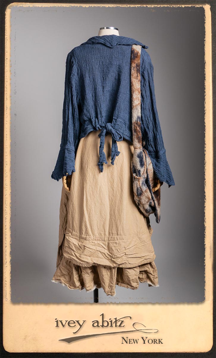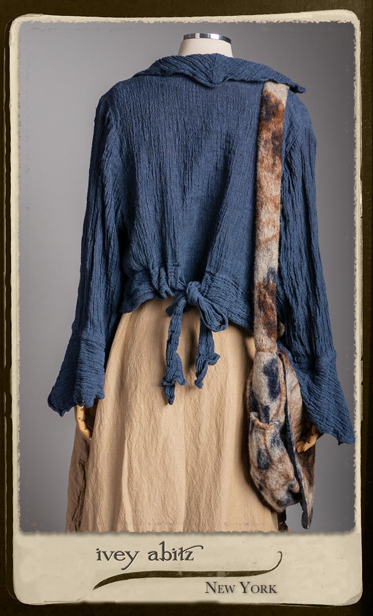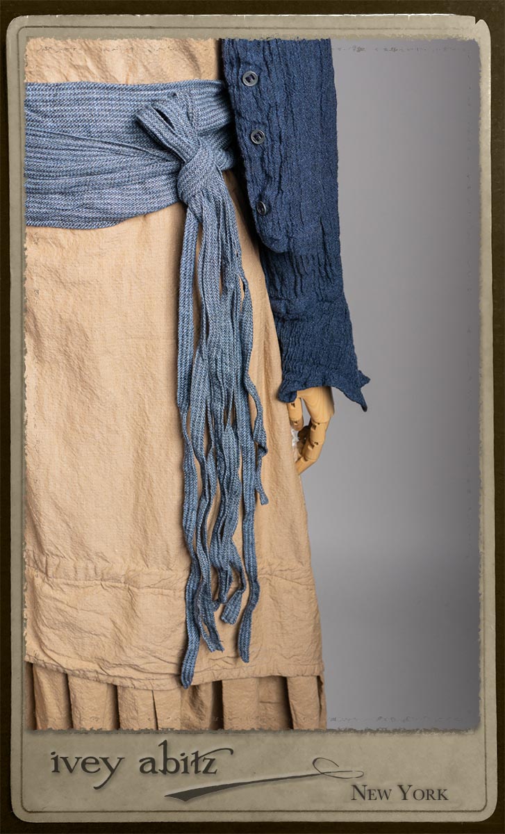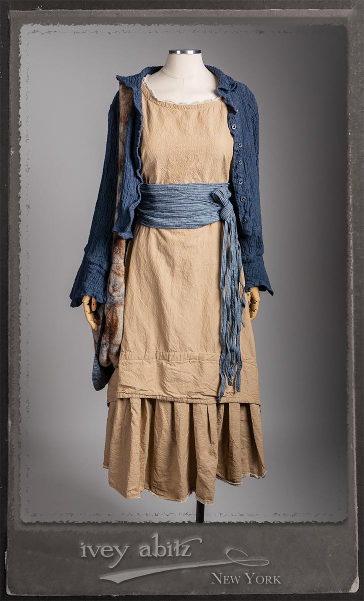 Crest Jacket in Hudson Blue Washed Crinkled Linen; Blanchefleur Frock in Sun and Sand Washed Stripe; Porte Cochere Sash in Estuary Herringbone Weave; Solomon Bag in Carriage Blanket Wool.