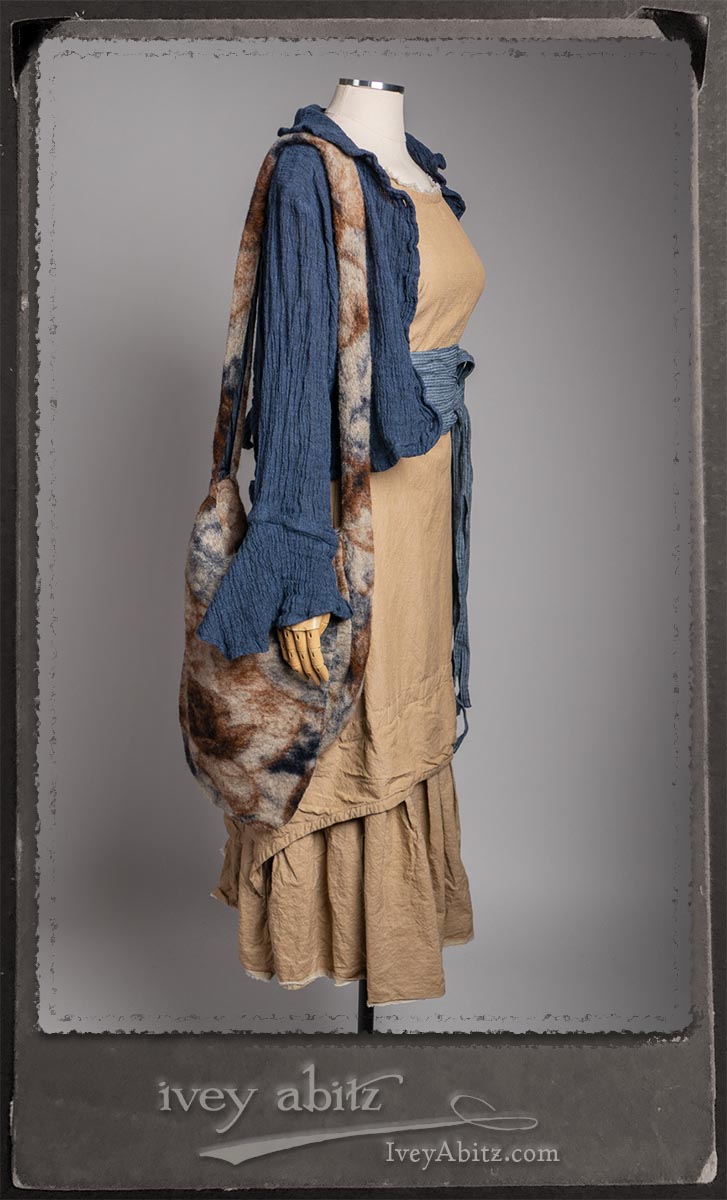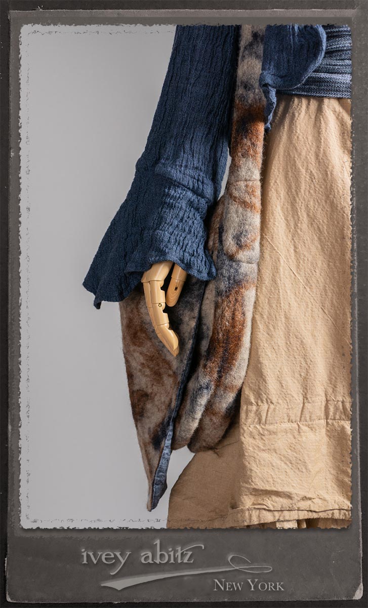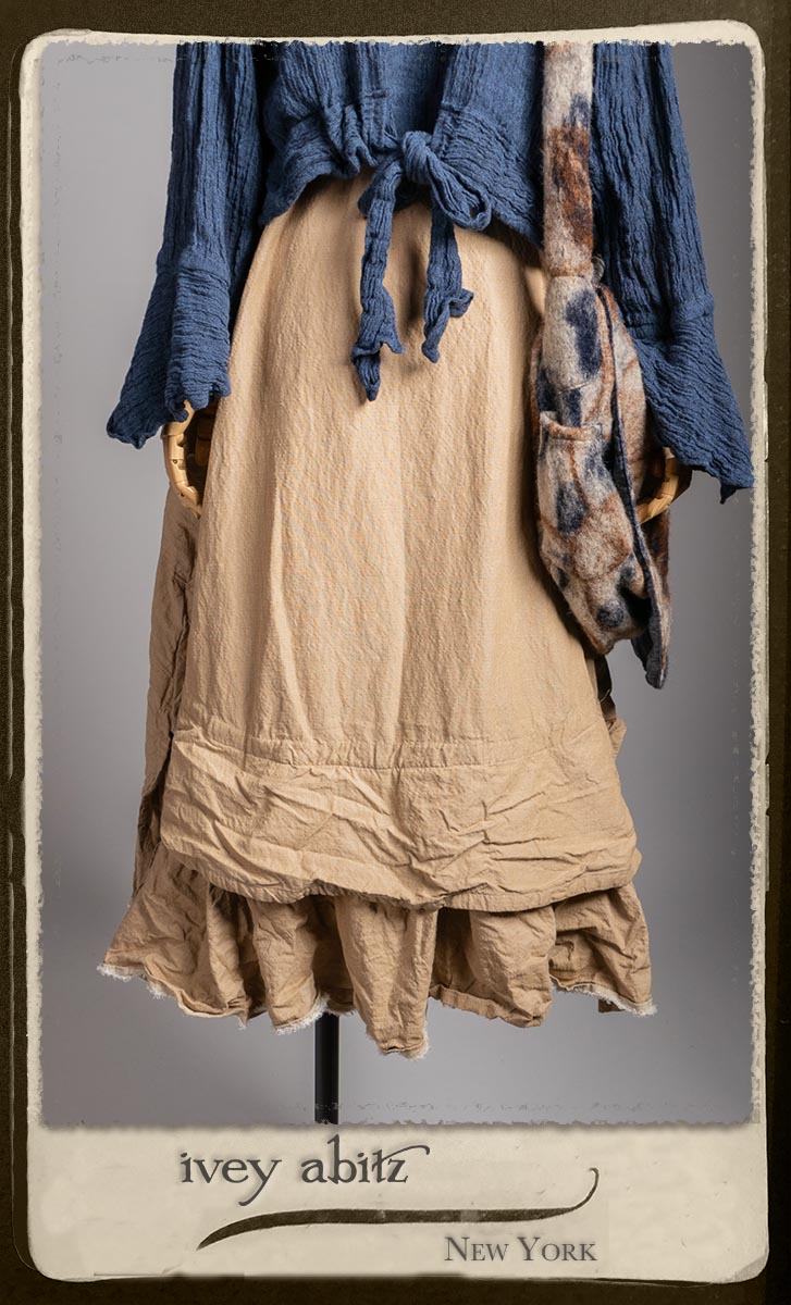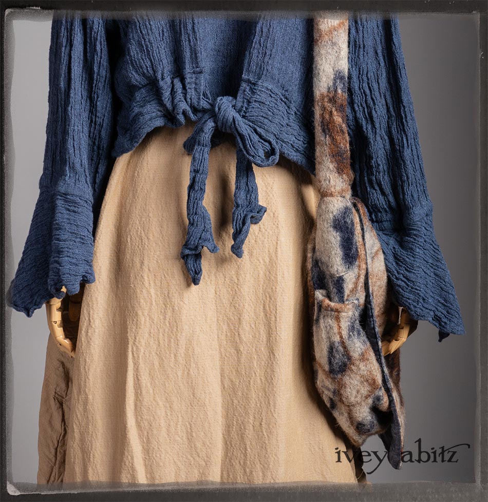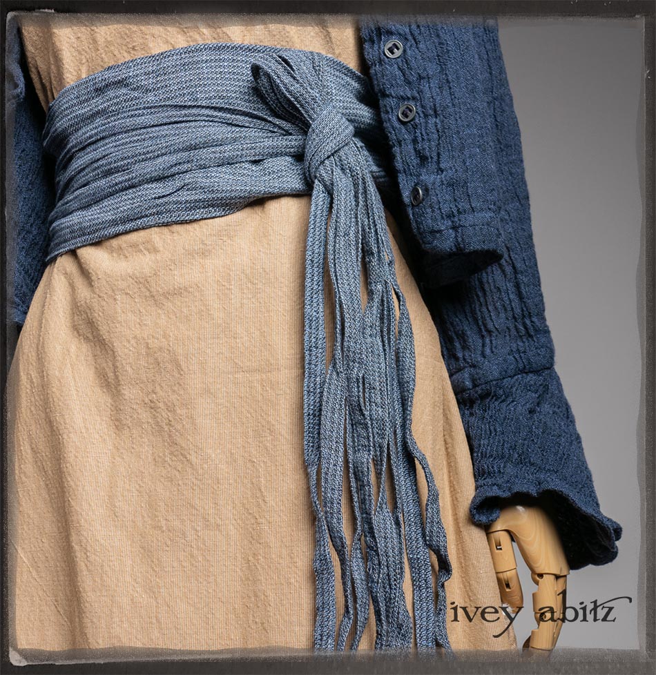 Crest Jacket in Hudson Blue Washed Crinkled Linen; Blanchefleur Frock in Sun and Sand Washed Stripe; Porte Cochere Sash in Estuary Herringbone Weave; Solomon Bag in Carriage Blanket Wool.