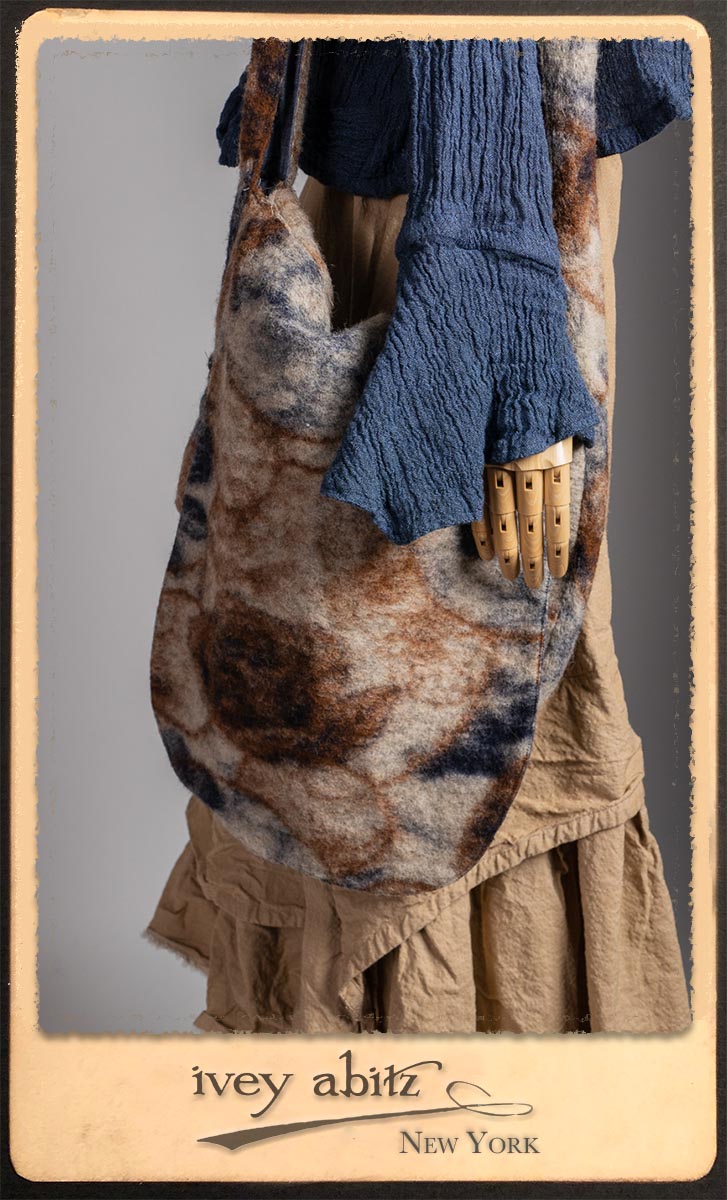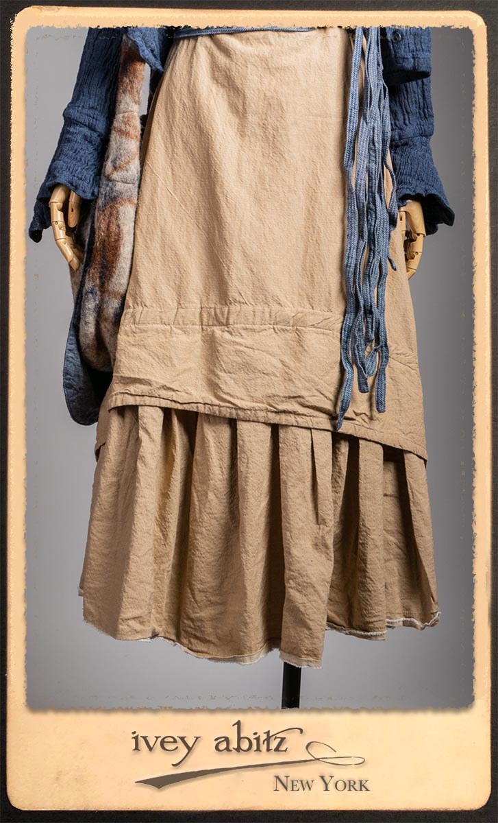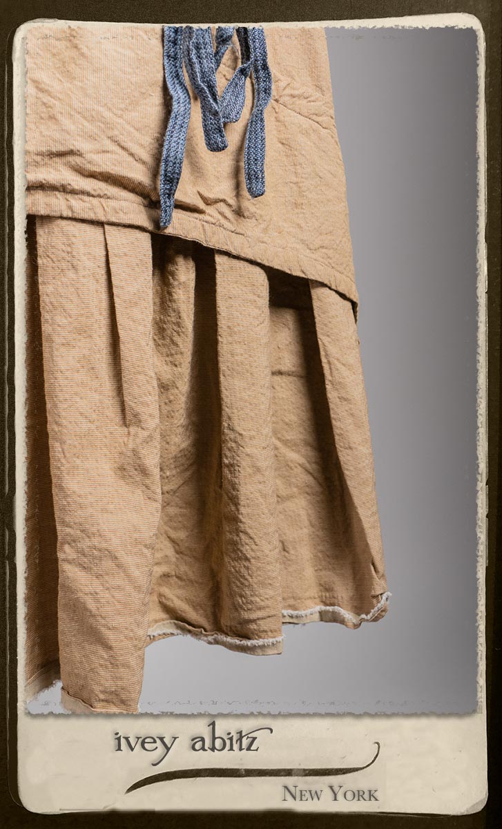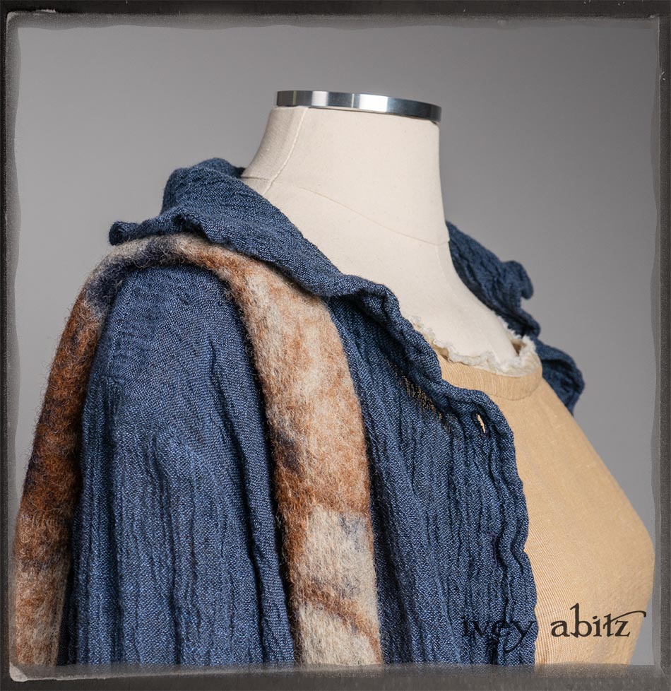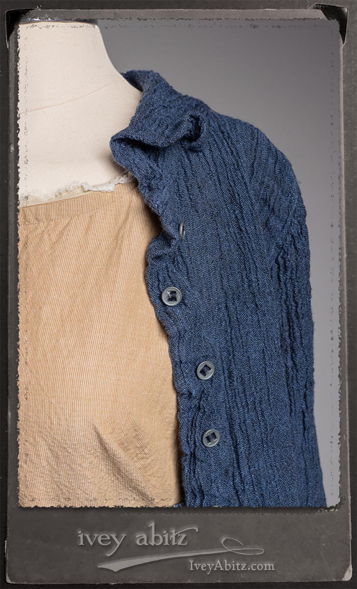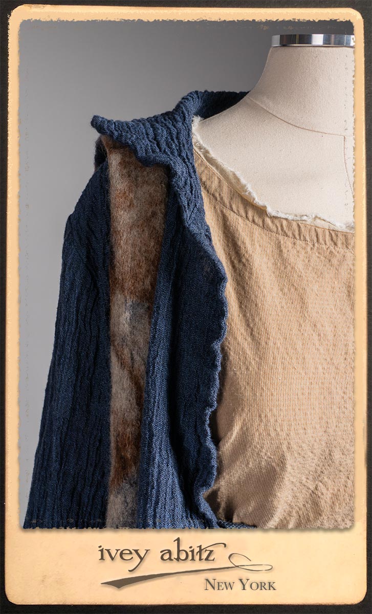 Crest Jacket in Hudson Blue Washed Crinkled Linen; Blanchefleur Frock in Sun and Sand Washed Stripe; Porte Cochere Sash in Estuary Herringbone Weave; Solomon Bag in Carriage Blanket Wool.