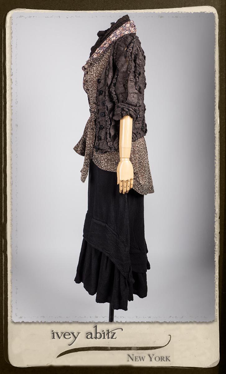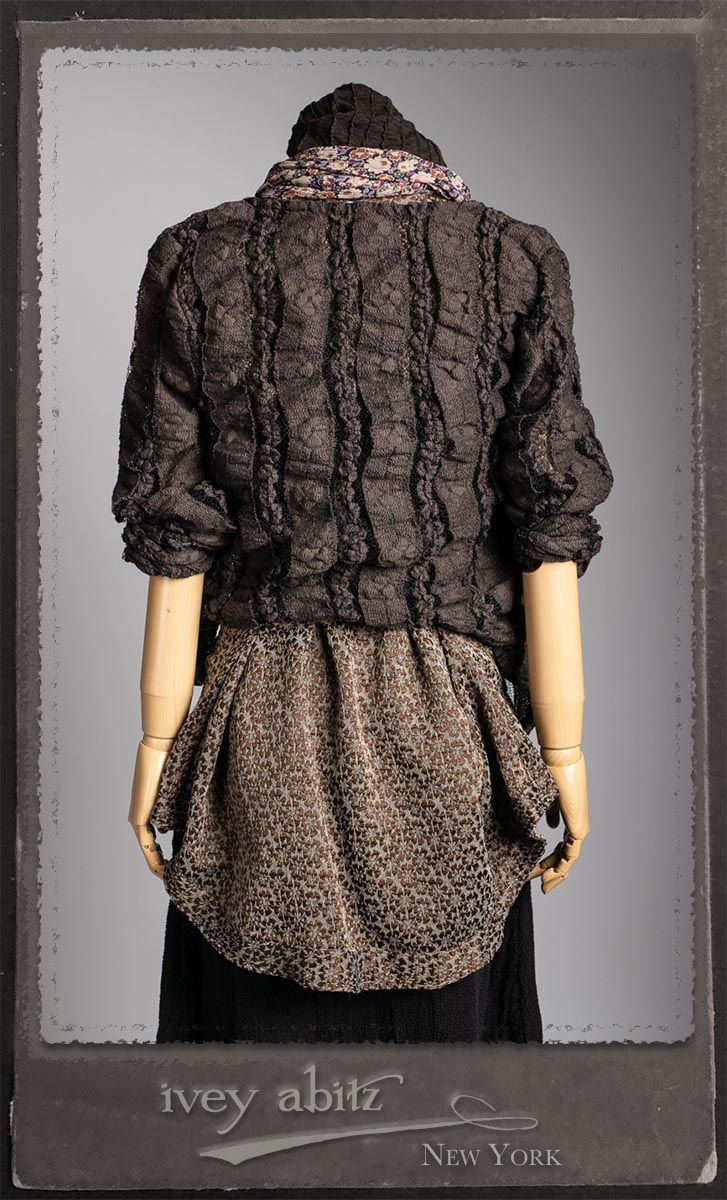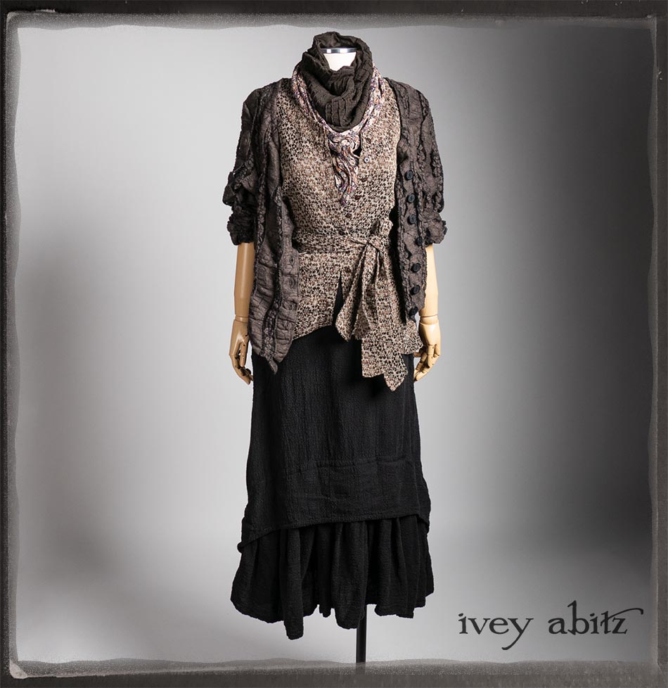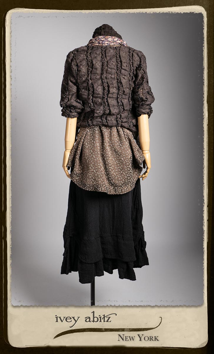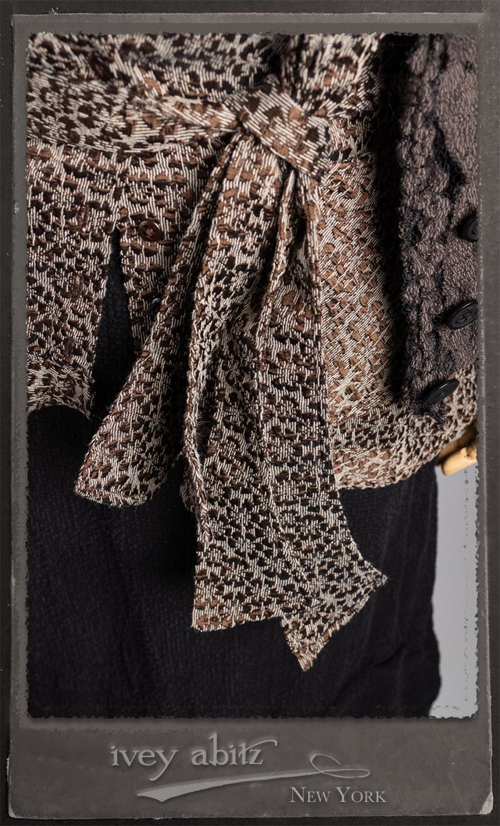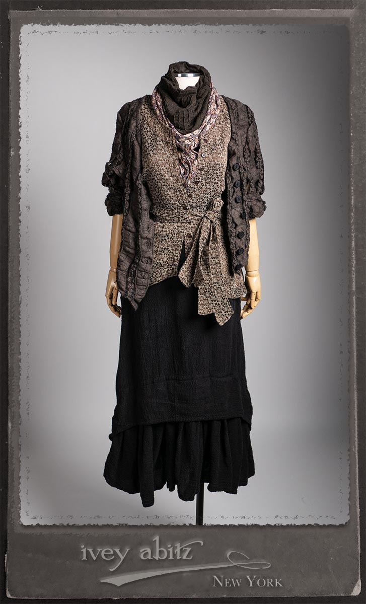 Elliot Jacket in Earthen Floral Wavy Stripe Knit; Lydia Neck Wrap in Arthur Brown and Wolfie Grey Stripe Knit; Blanchefleur Sash in Riverboat Floral Silk Chiffon; Truitt Vest in Saddle Floral Puckered Weave; Blanchefleur Frock in Black Puckered Check Weave.
