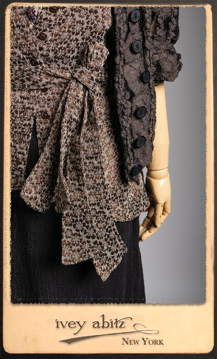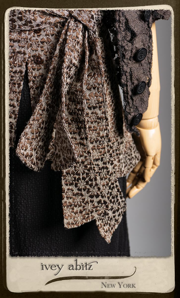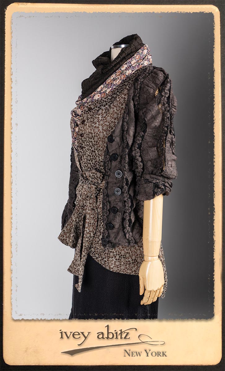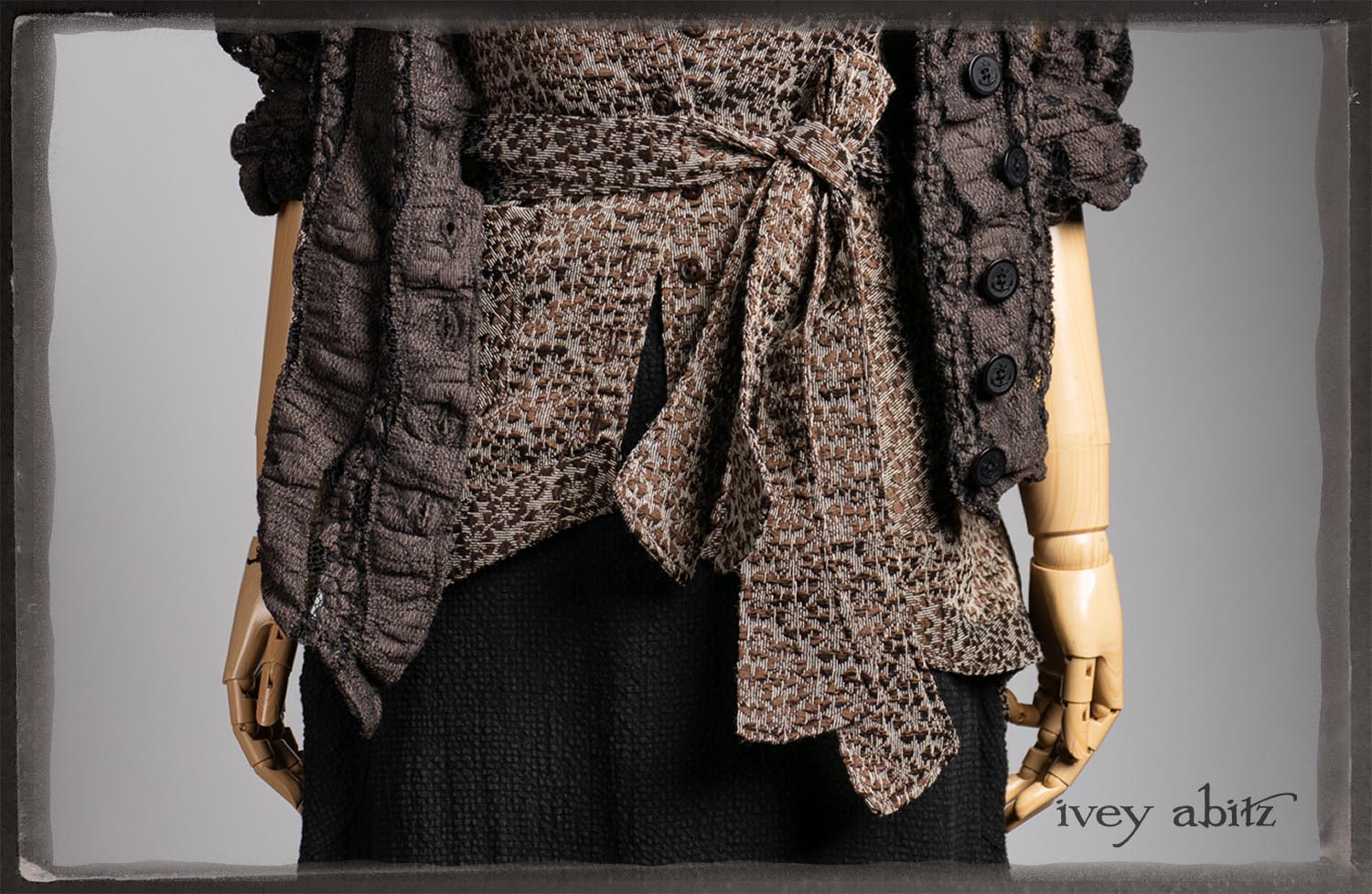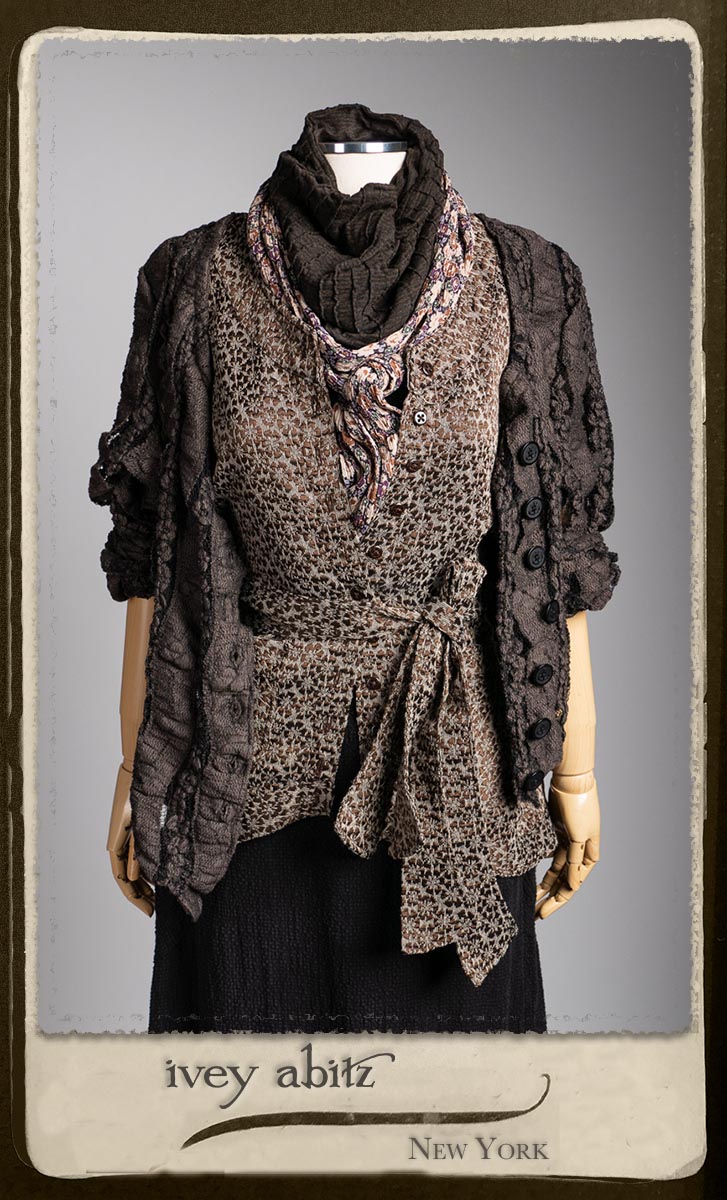 Elliot Jacket in Earthen Floral Wavy Stripe Knit; Lydia Neck Wrap in Arthur Brown and Wolfie Grey Stripe Knit; Blanchefleur Sash in Riverboat Floral Silk Chiffon; Truitt Vest in Saddle Floral Puckered Weave; Blanchefleur Frock in Black Puckered Check Weave.
