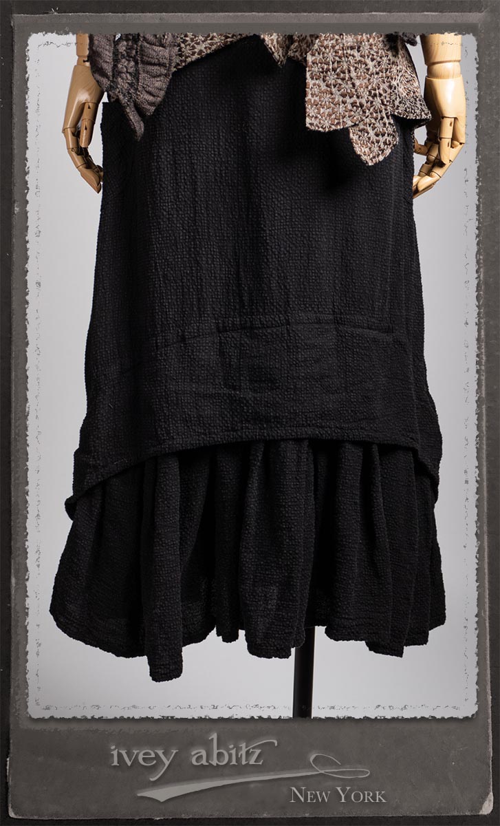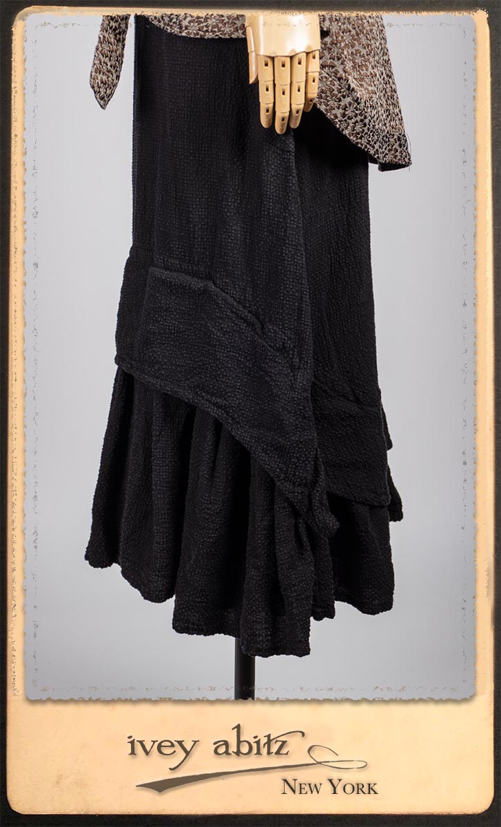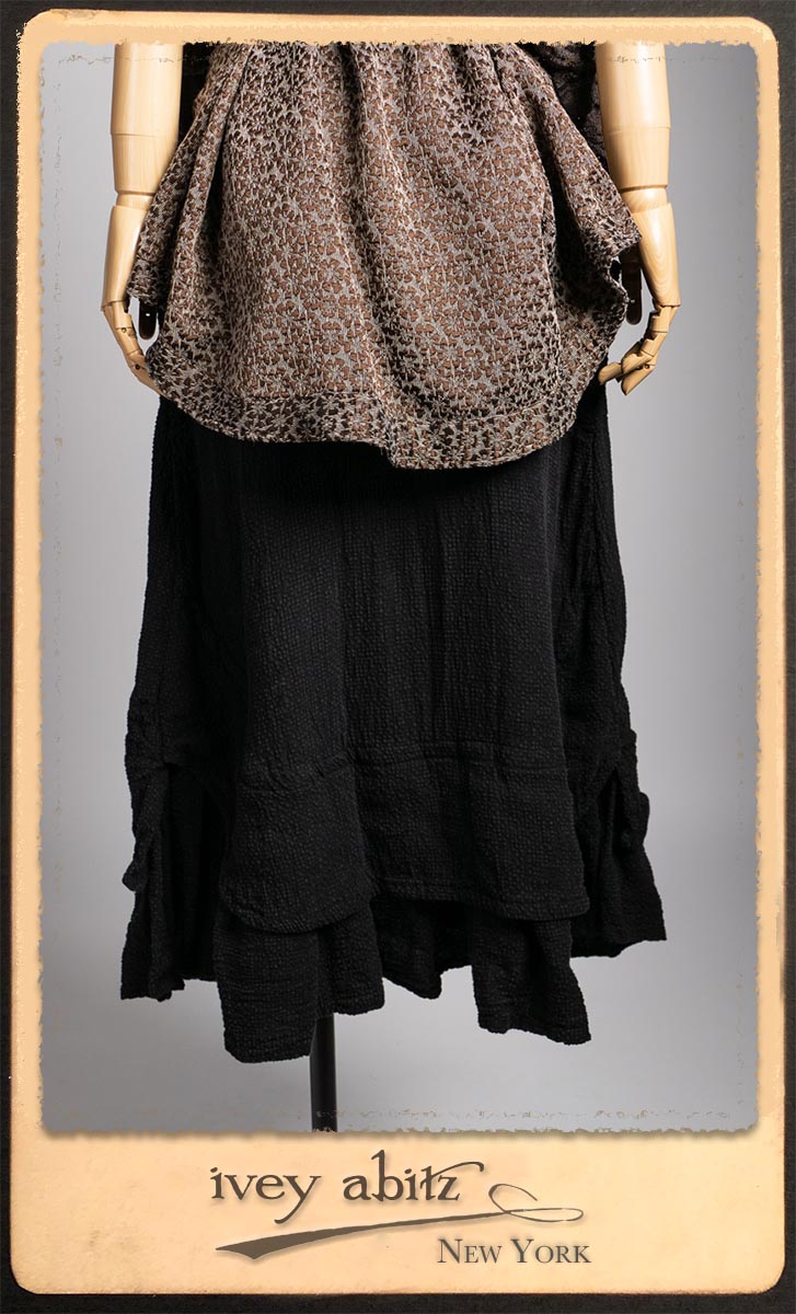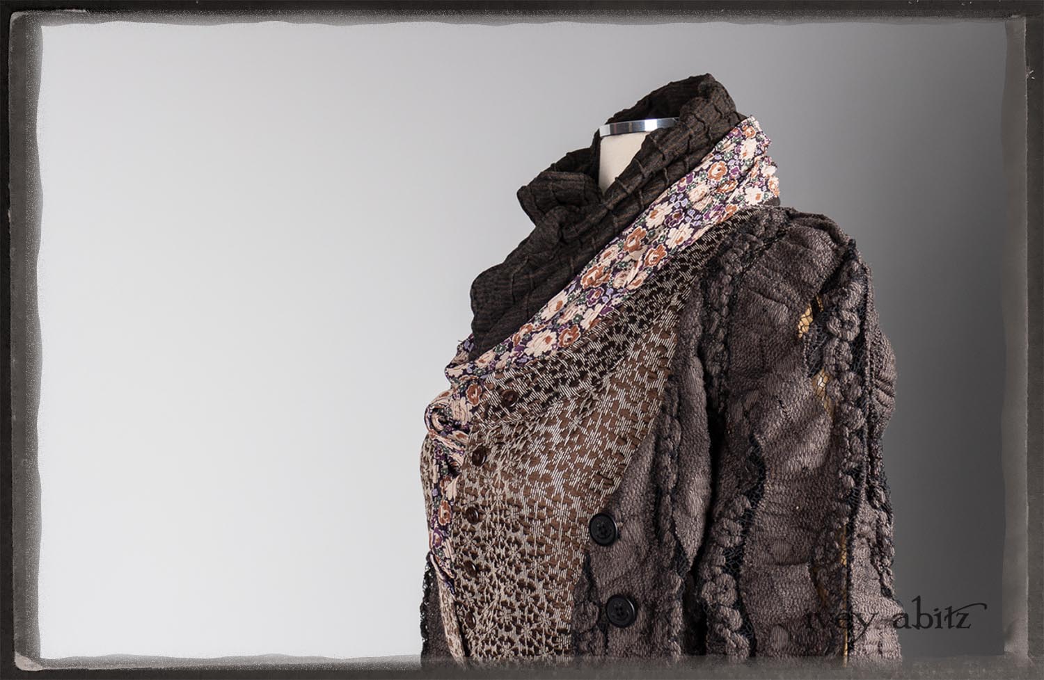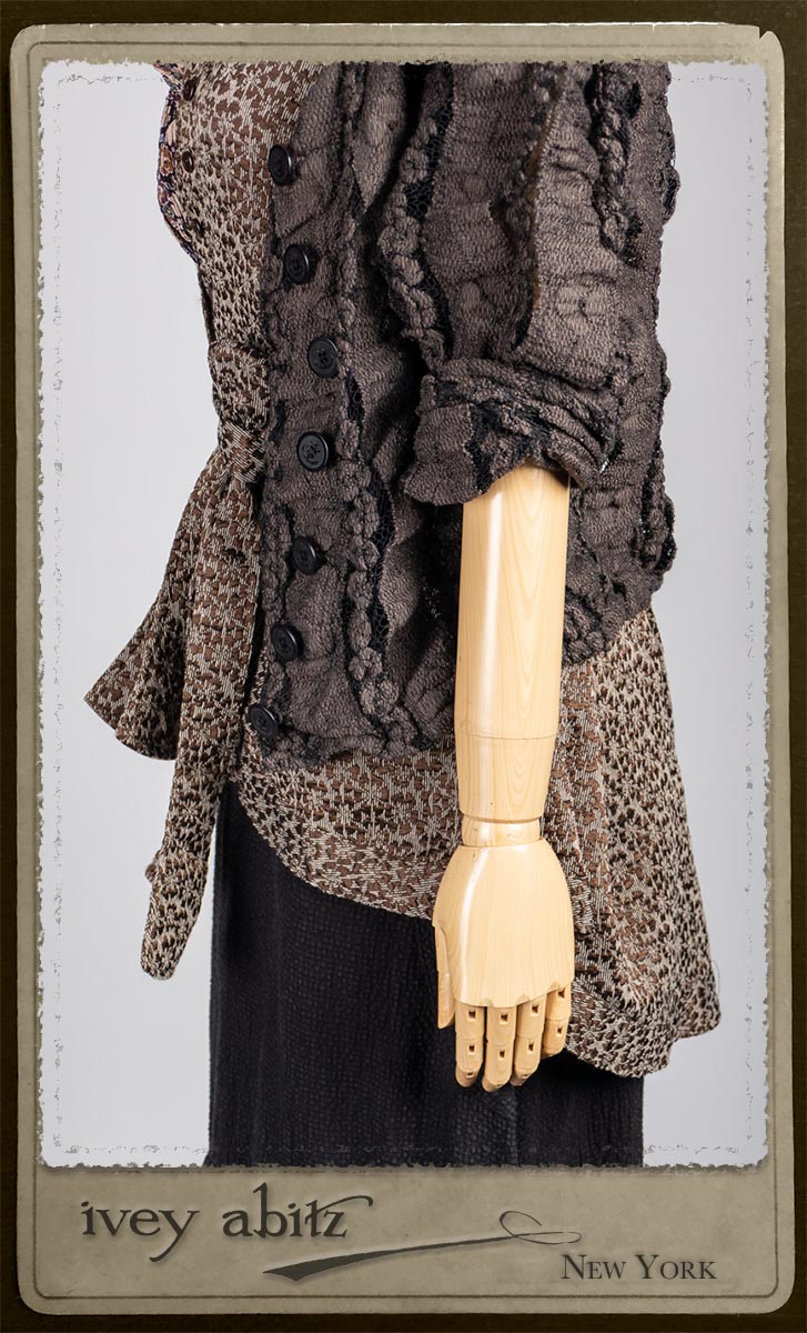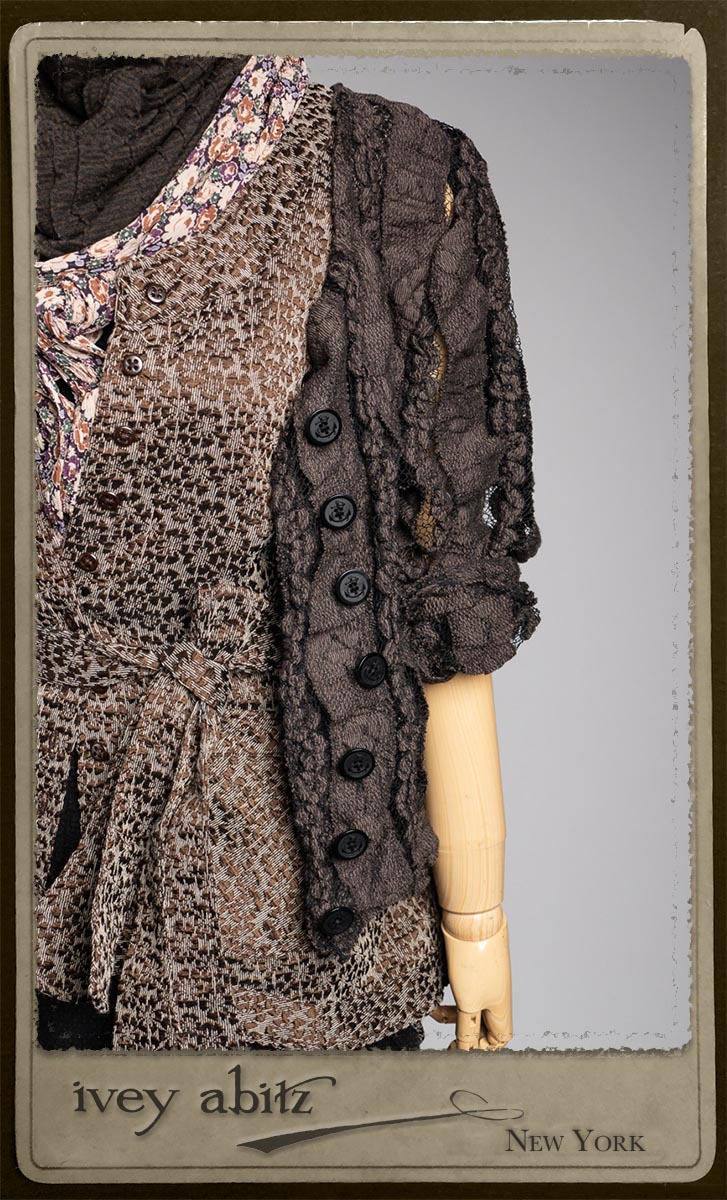 Elliot Jacket in Earthen Floral Wavy Stripe Knit; Lydia Neck Wrap in Arthur Brown and Wolfie Grey Stripe Knit; Blanchefleur Sash in Riverboat Floral Silk Chiffon; Truitt Vest in Saddle Floral Puckered Weave; Blanchefleur Frock in Black Puckered Check Weave.