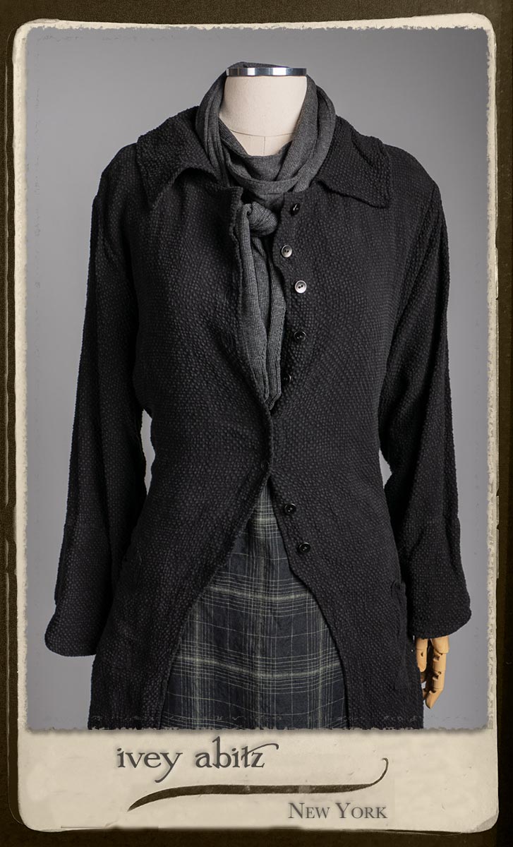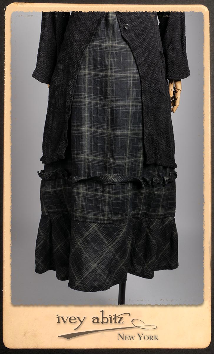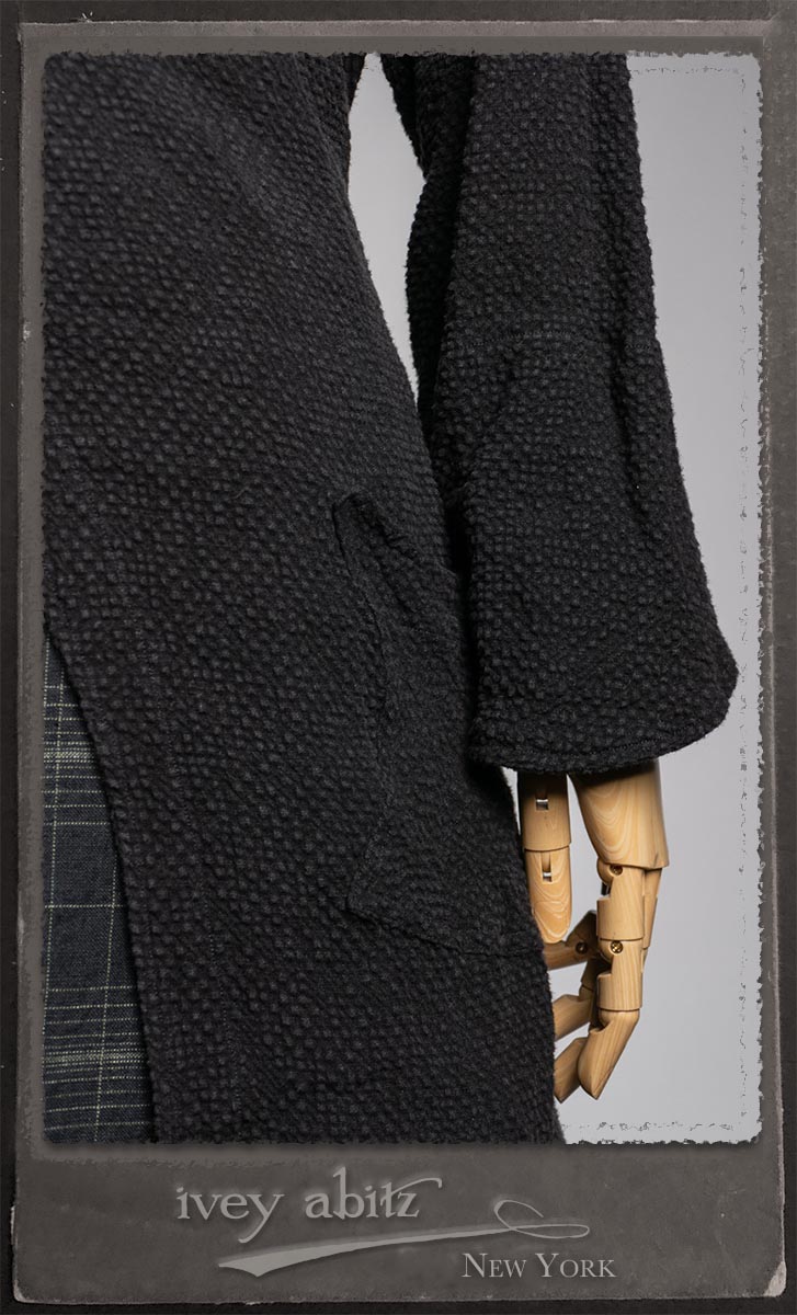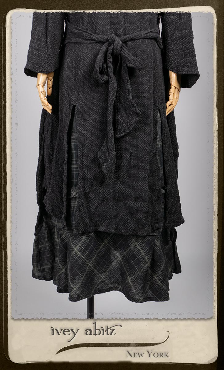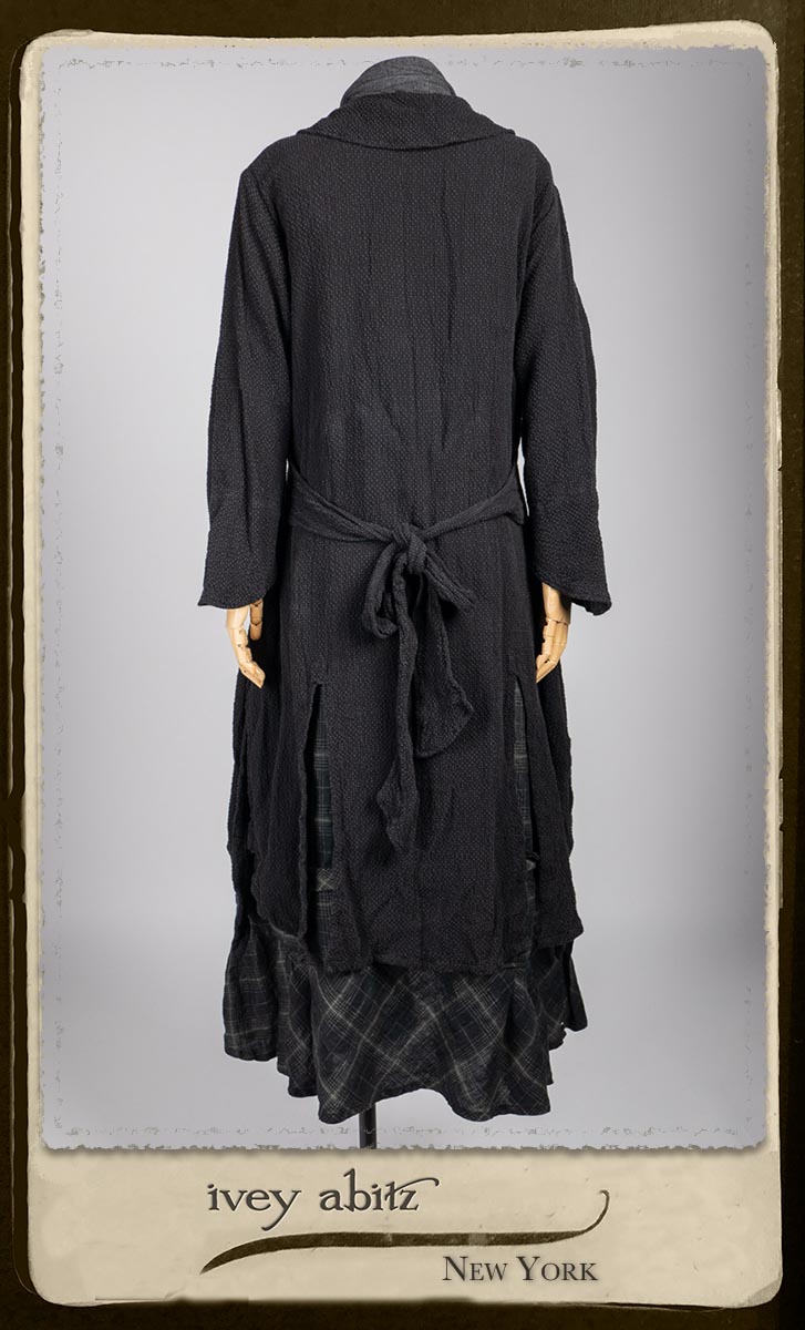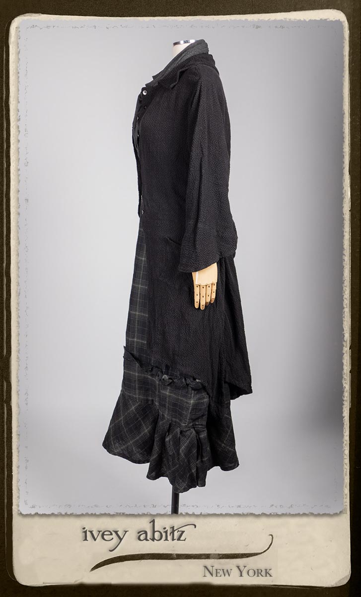 Elsie Duster Coat in Black Puckered Check Weave; Saint Ans Sash in Wolfie Grey Soft Ribbed Knit; Hudson Frock in Unity Plaid Linen.