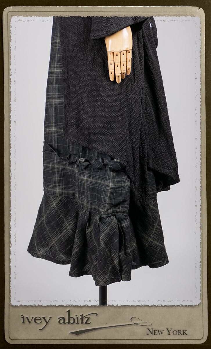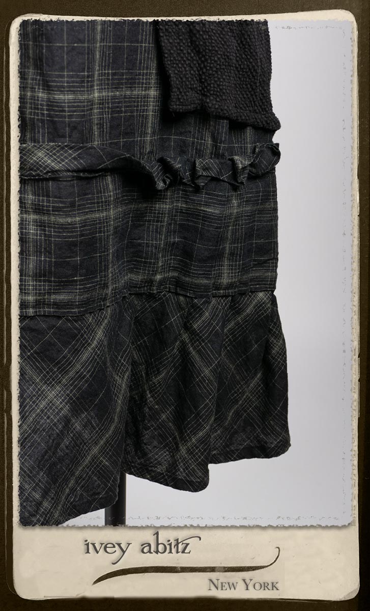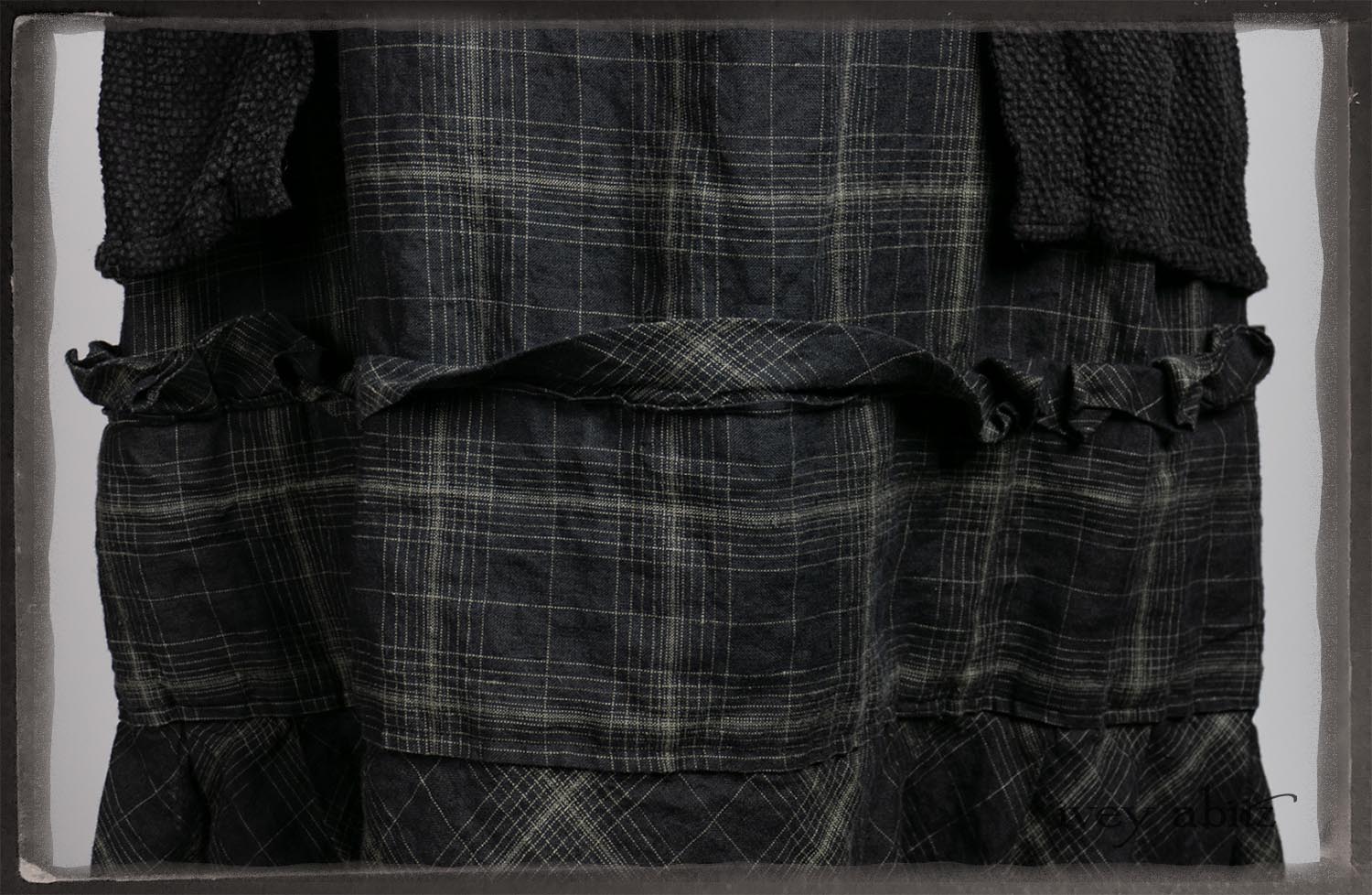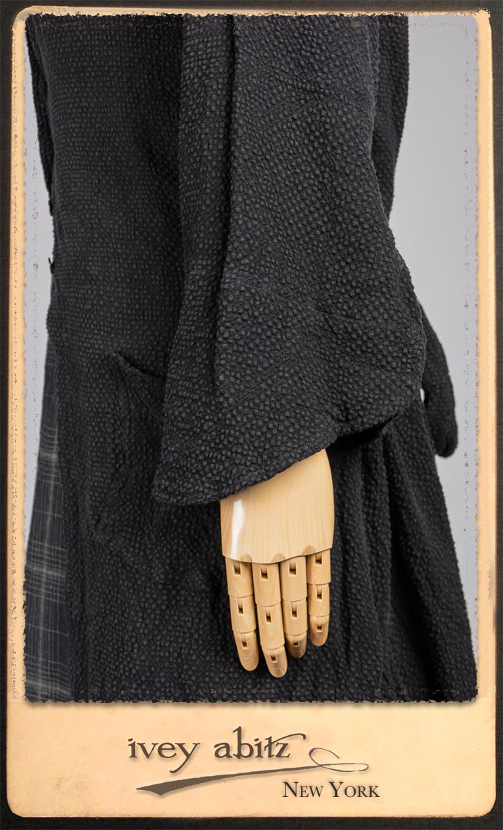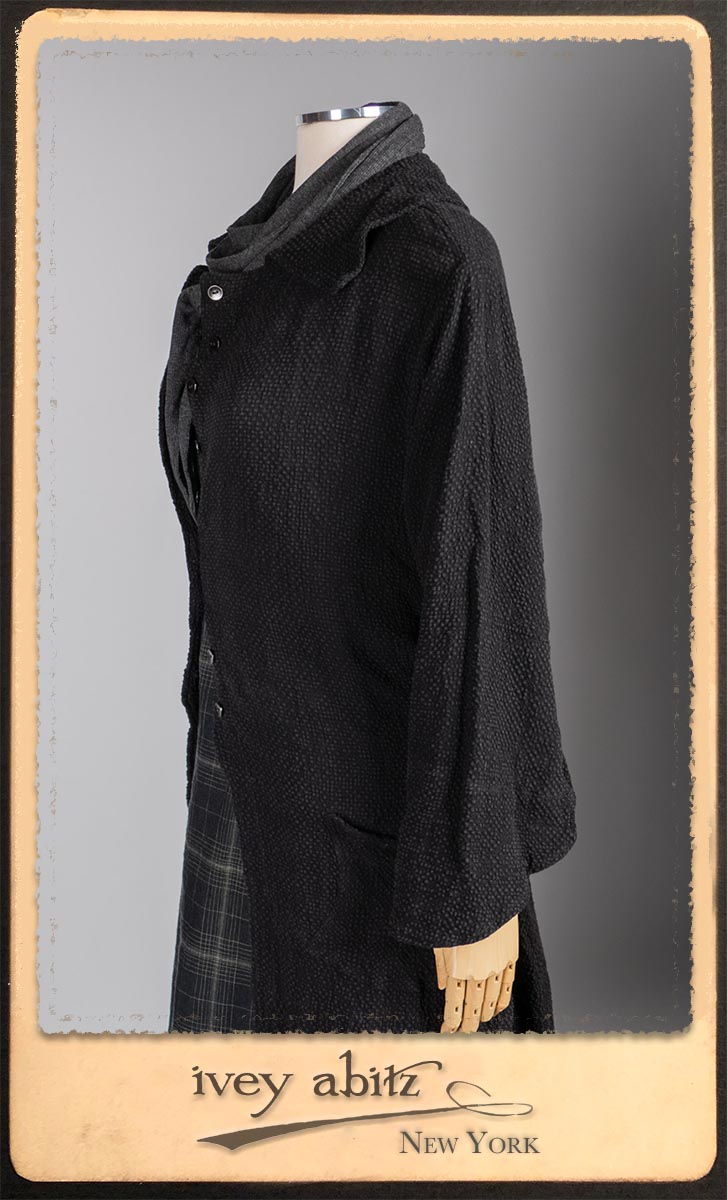 Elsie Duster Coat in Black Puckered Check Weave; Saint Ans Sash in Wolfie Grey Soft Ribbed Knit; Hudson Frock in Unity Plaid Linen.