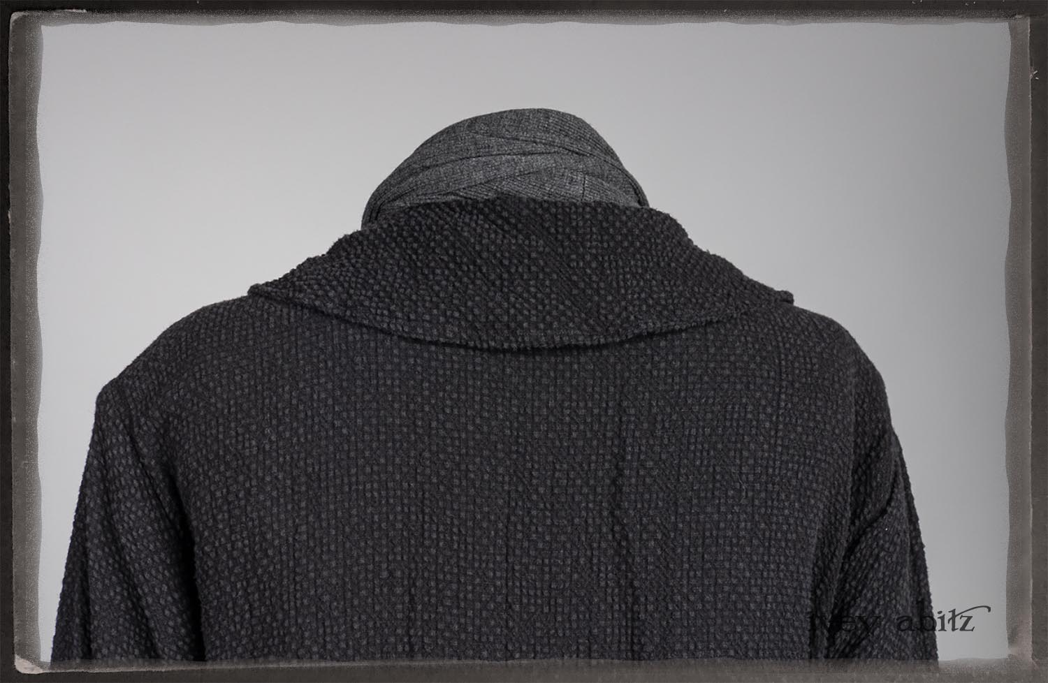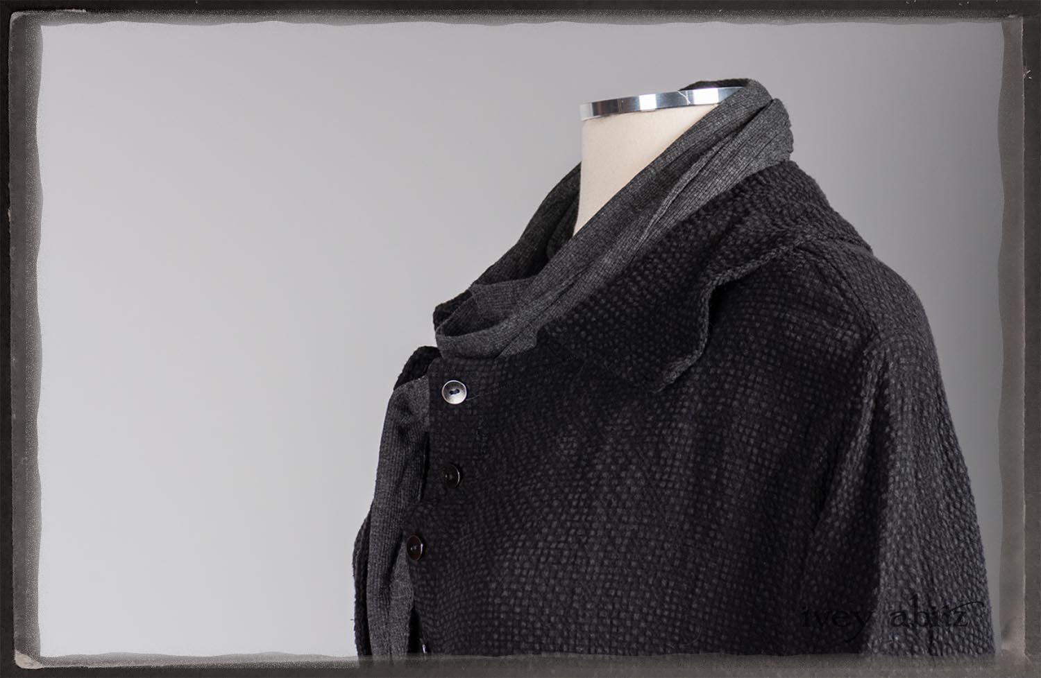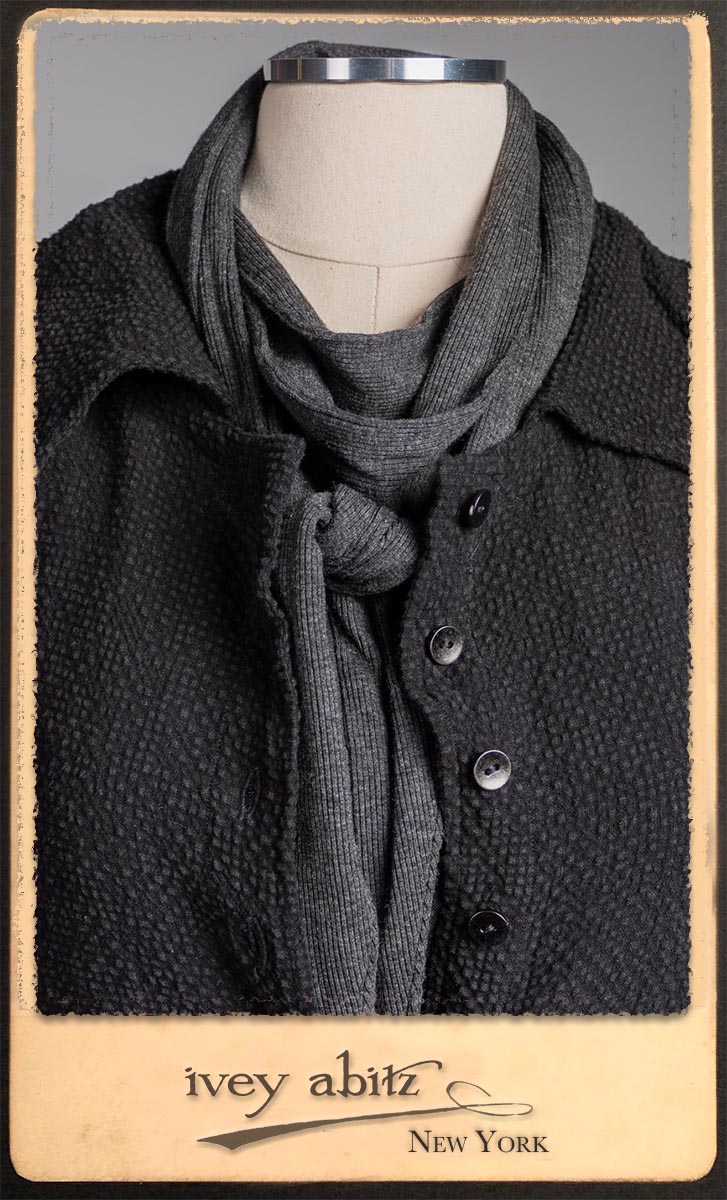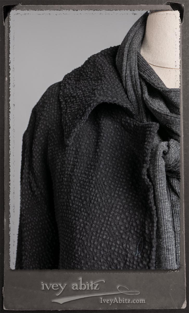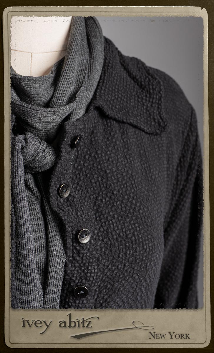 Elsie Duster Coat in Black Puckered Check Weave; Saint Ans Sash in Wolfie Grey Soft Ribbed Knit; Hudson Frock in Unity Plaid Linen.