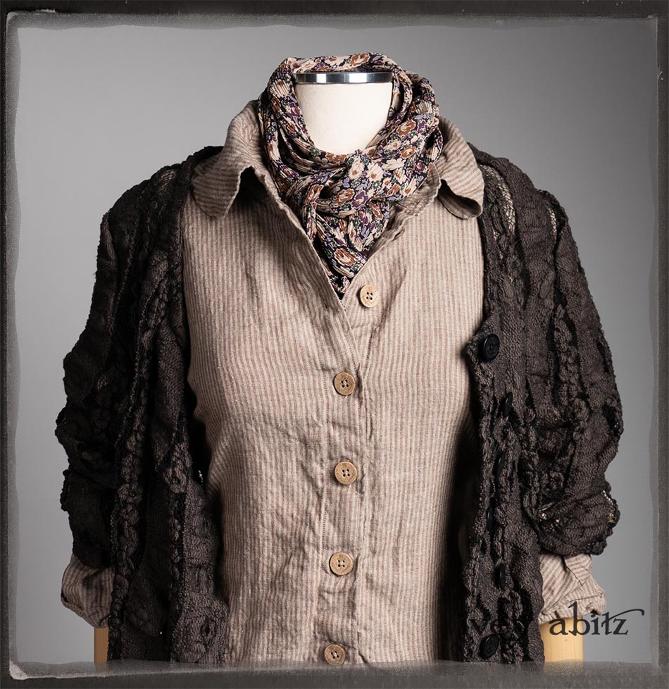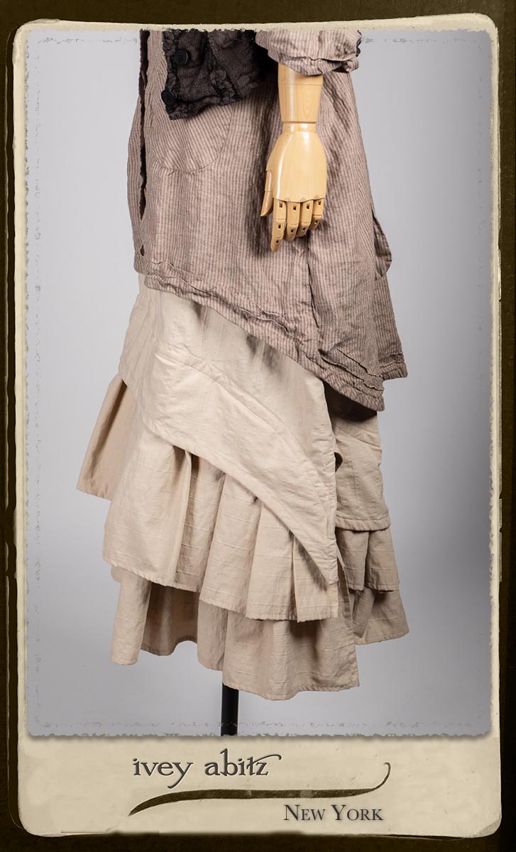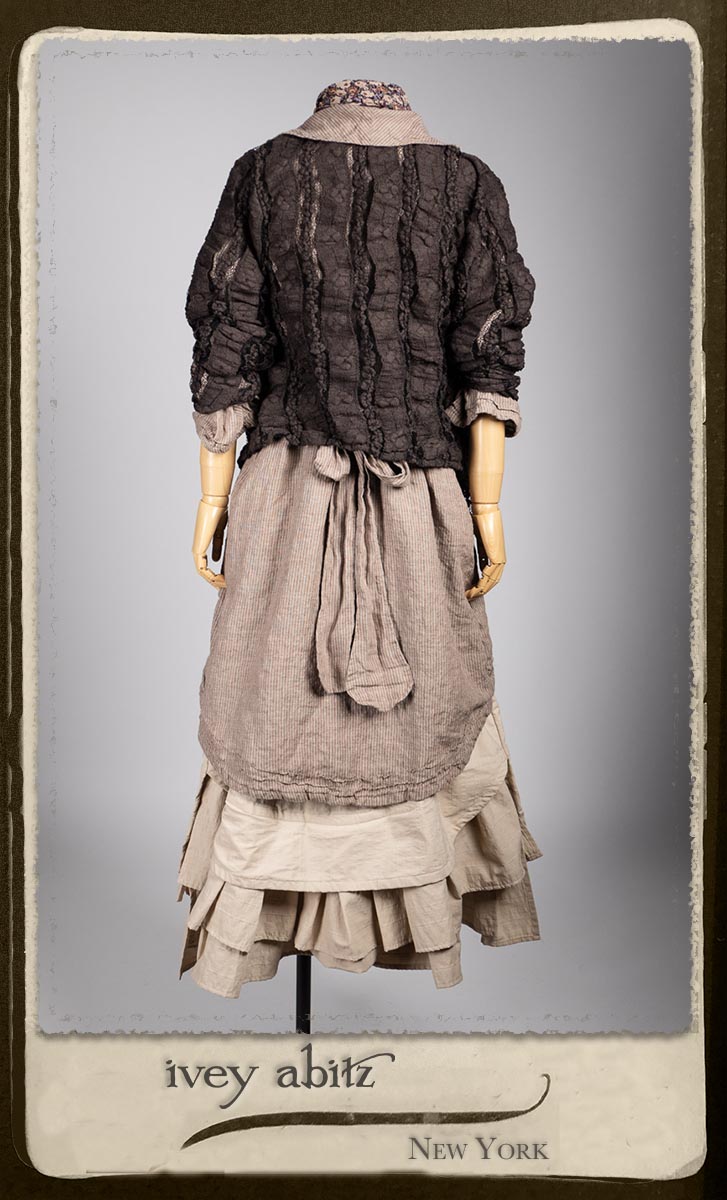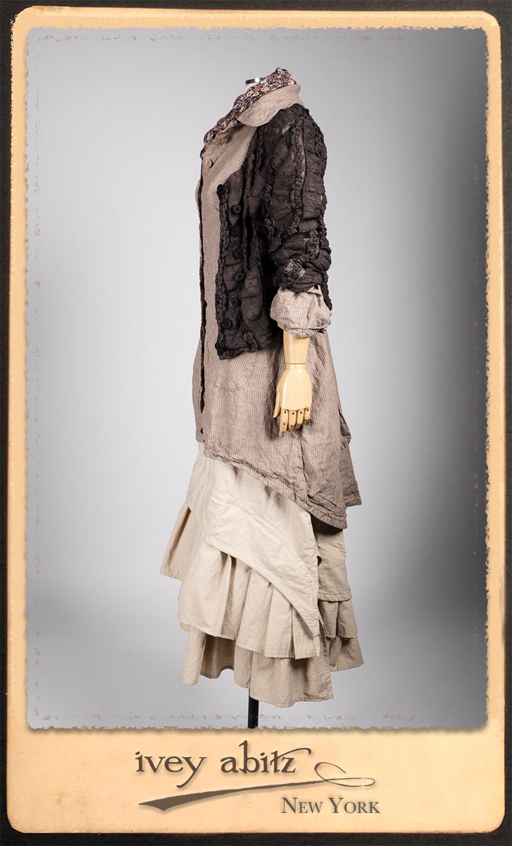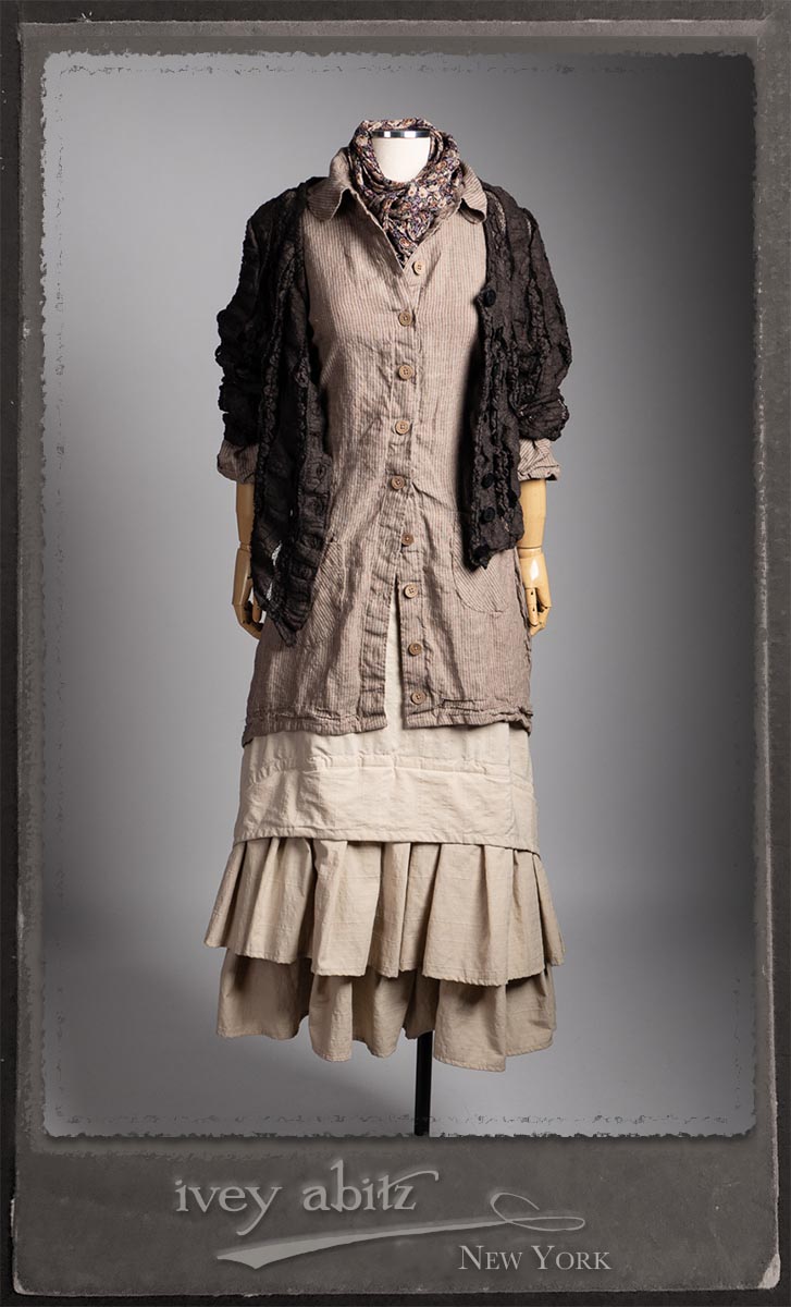Amorette Shirt Jacket in Earthen Washed Stripe Linen; Everett Skirt in Uptown Raised Stripe Weave; Elliot Jacket in Earthen Floral Wavy Stripe Knit; Blanchefleur Sash in Riverboat Floral Silk Chiffon.