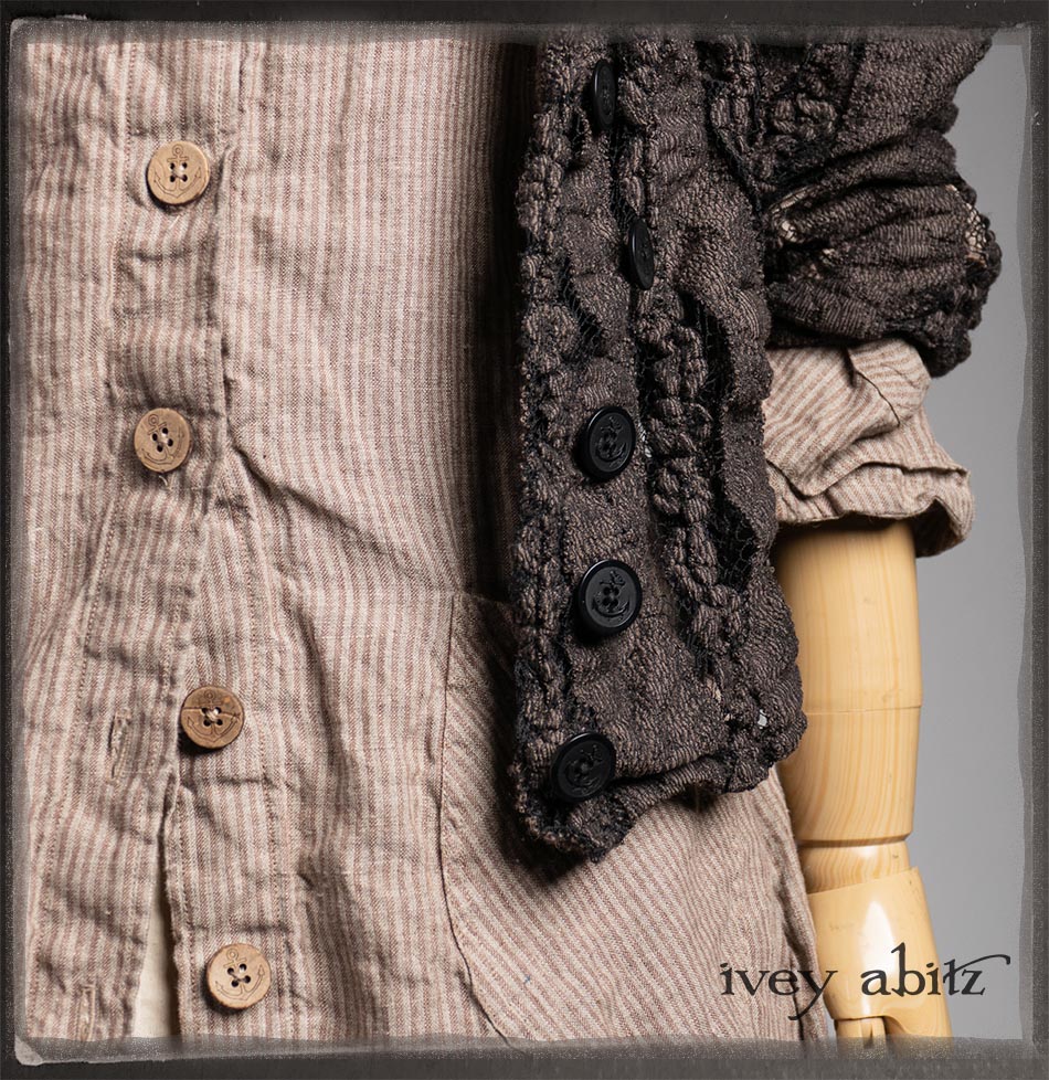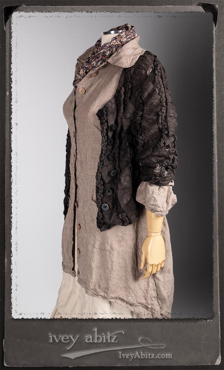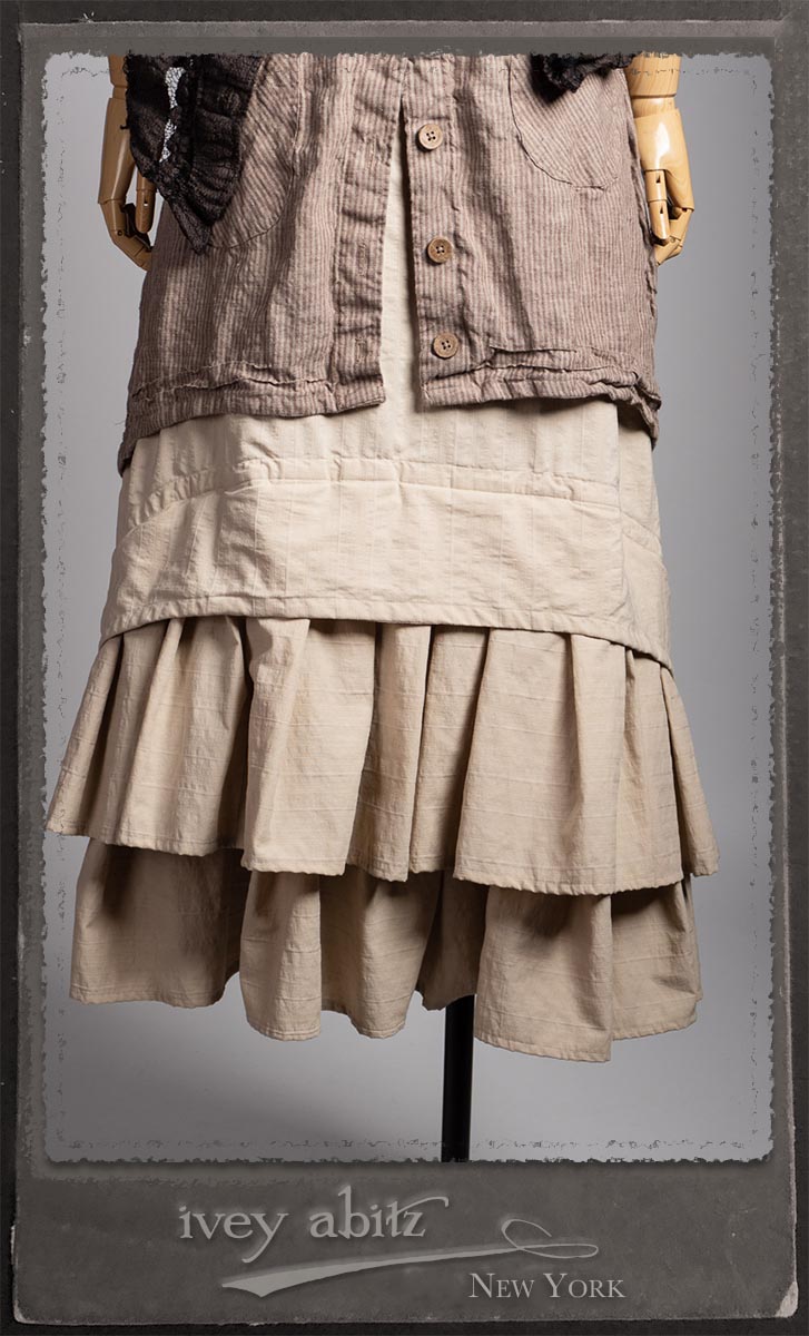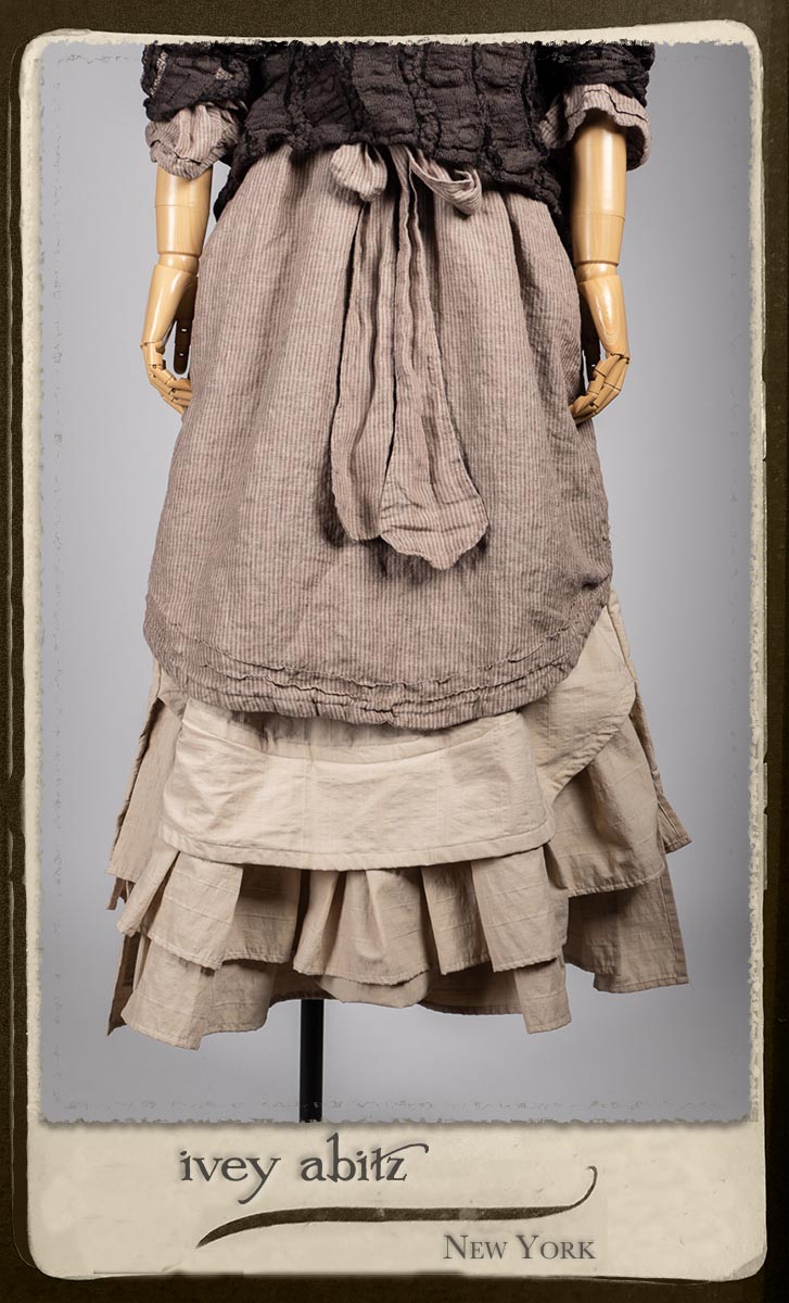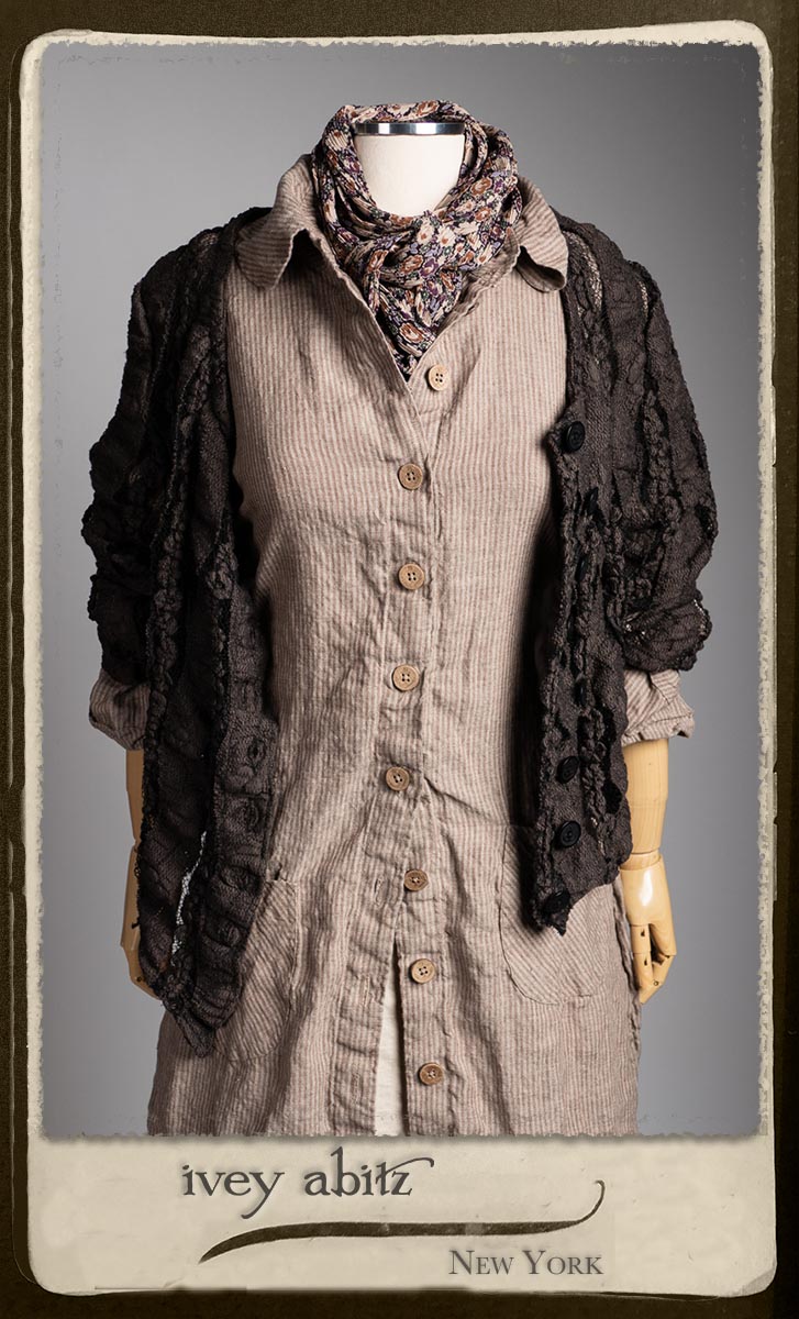 Amorette Shirt Jacket in Earthen Washed Stripe Linen; Everett Skirt in Uptown Raised Stripe Weave; Elliot Jacket in Earthen Floral Wavy Stripe Knit; Blanchefleur Sash in Riverboat Floral Silk Chiffon.