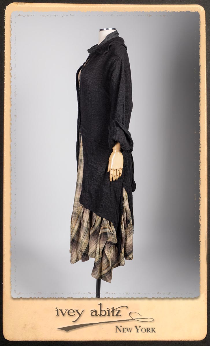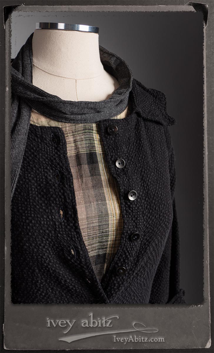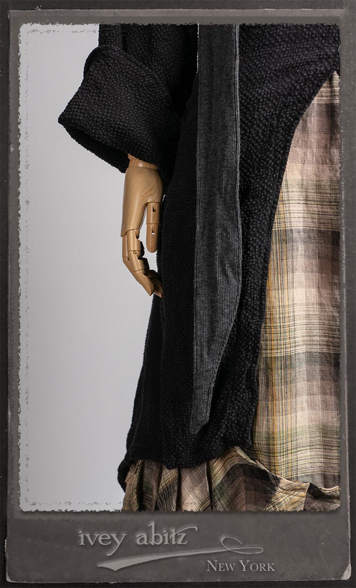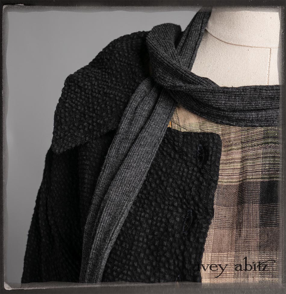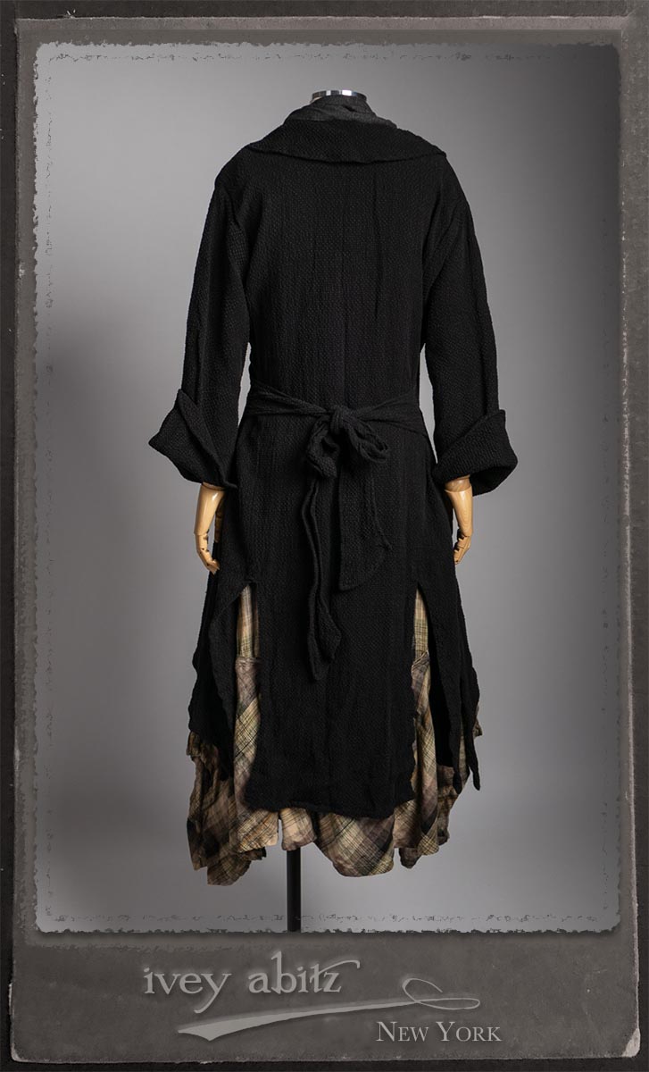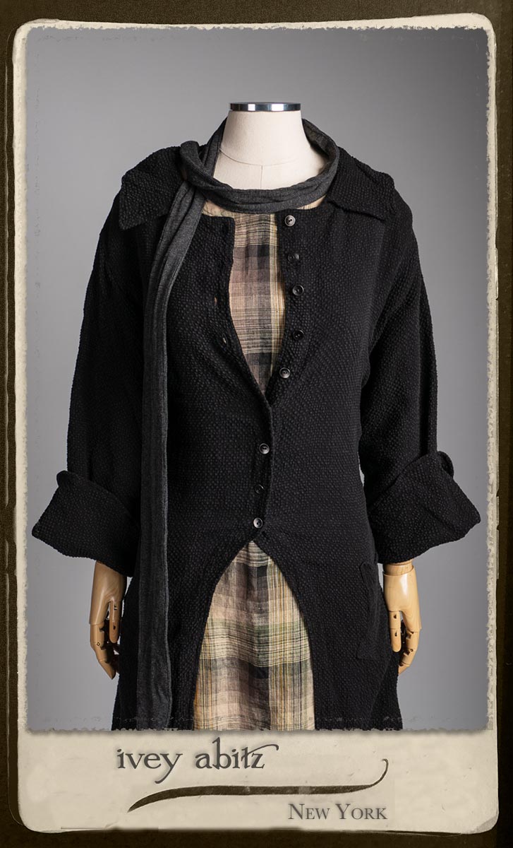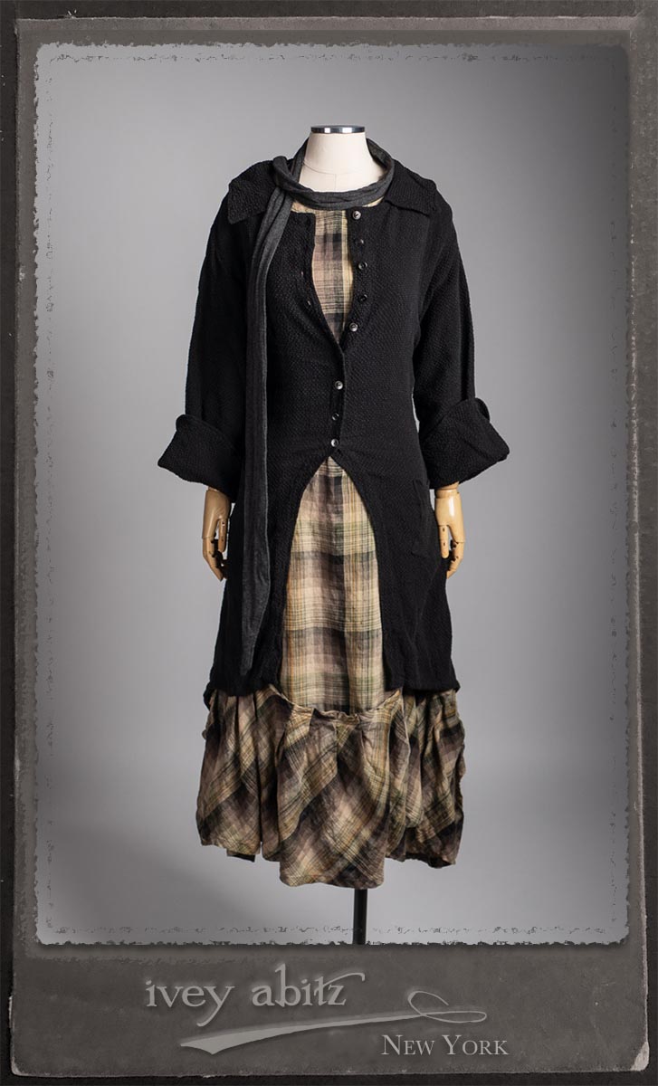 Elsie Duster Coat in Black Puckered Check Weave; Saint Ans Sash in Wolfie Grey Soft Ribbed Knit; Fairholme Frock in Garden Plaid Linen.
