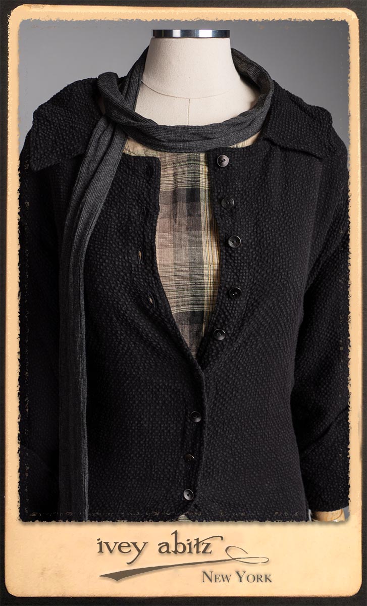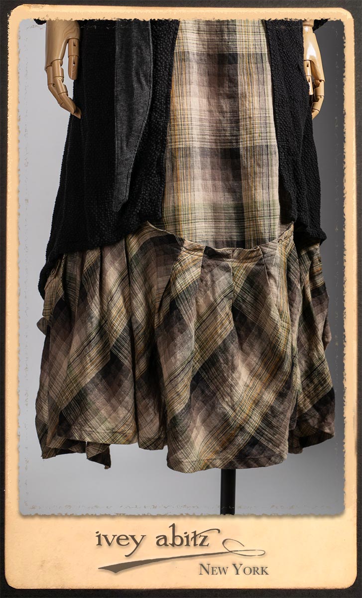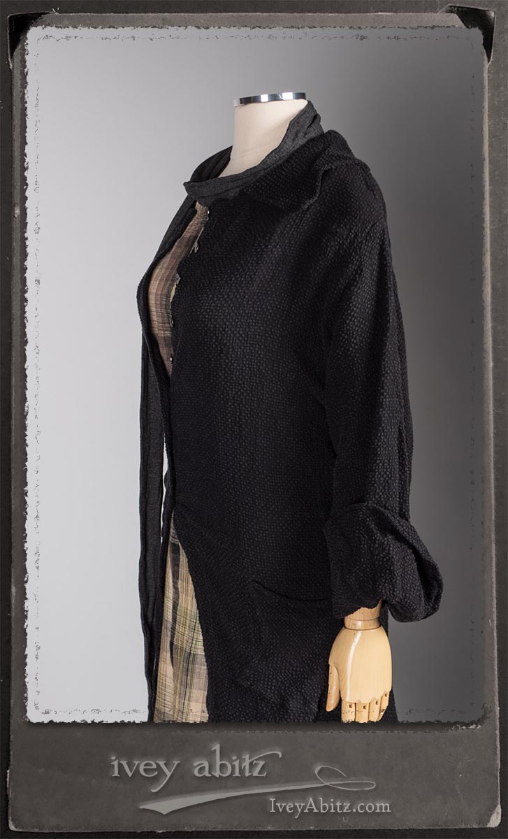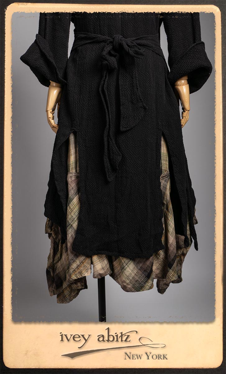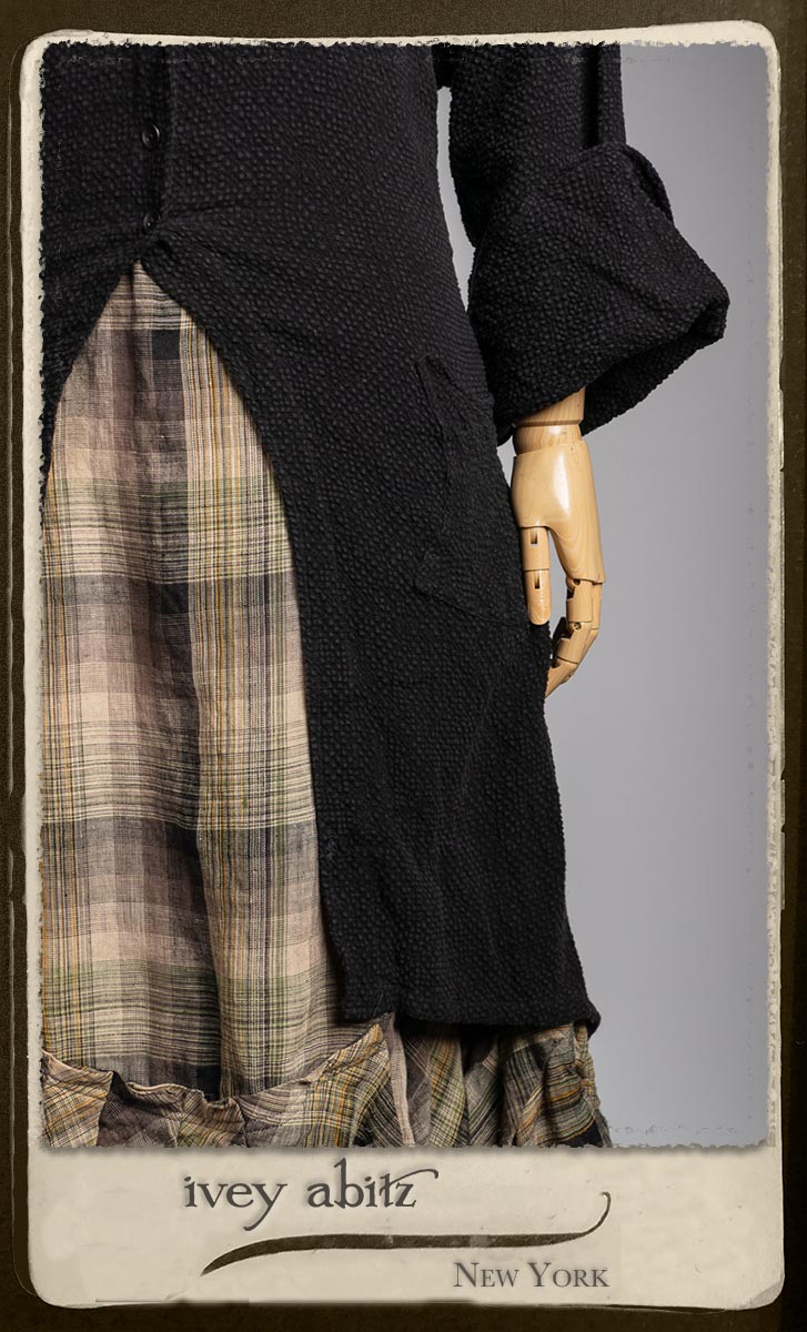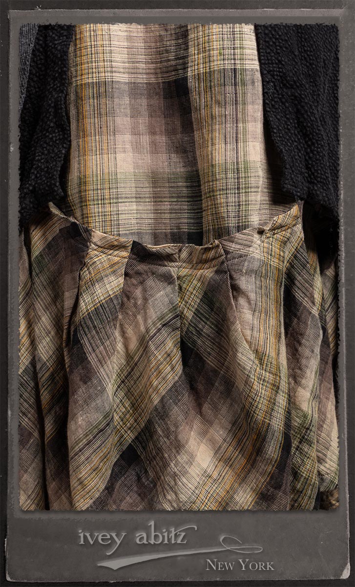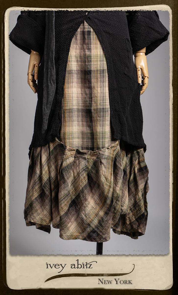 Elsie Duster Coat in Black Puckered Check Weave; Saint Ans Sash in Wolfie Grey Soft Ribbed Knit; Fairholme Frock in Garden Plaid Linen.