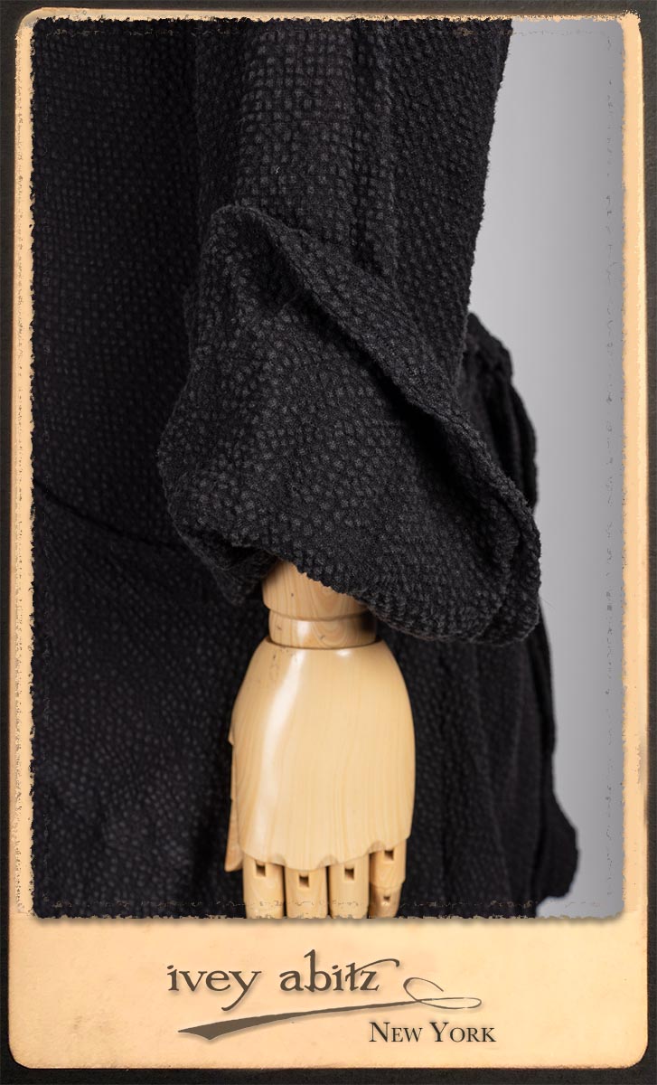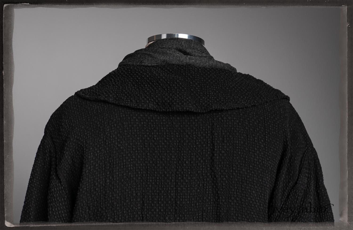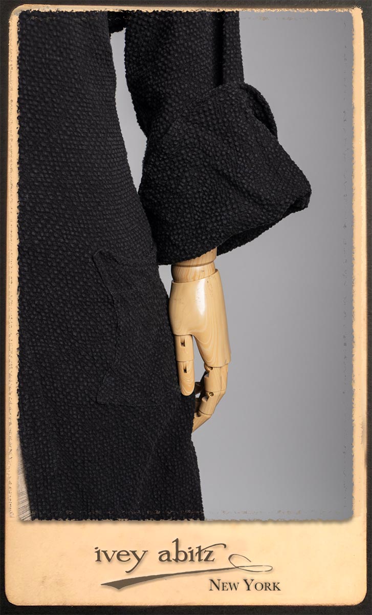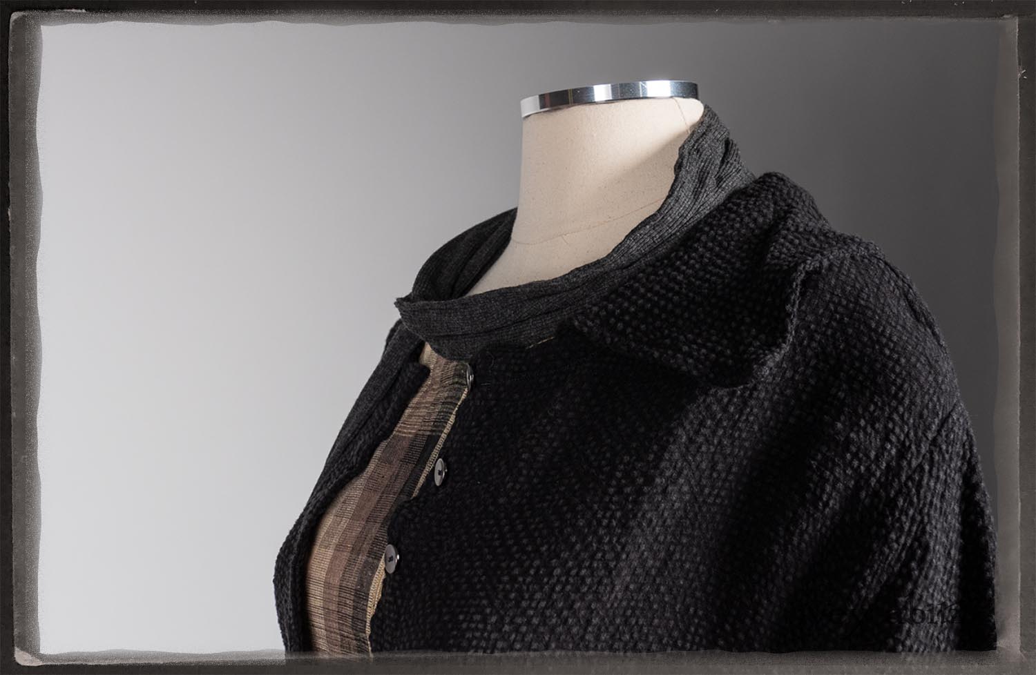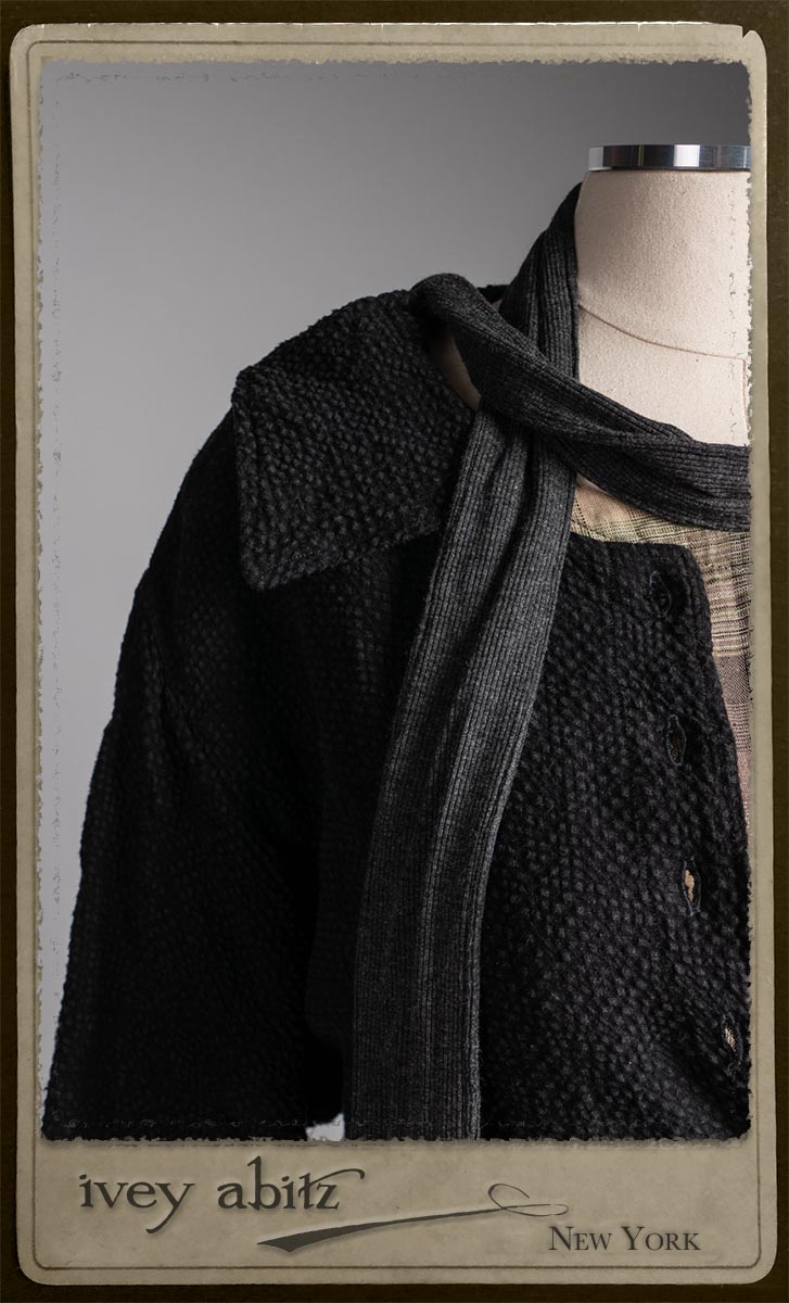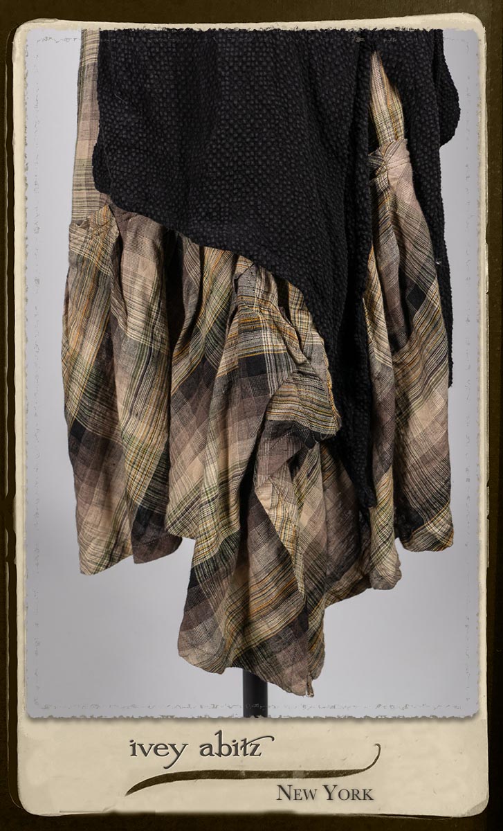 Elsie Duster Coat in Black Puckered Check Weave; Saint Ans Sash in Wolfie Grey Soft Ribbed Knit; Fairholme Frock in Garden Plaid Linen.