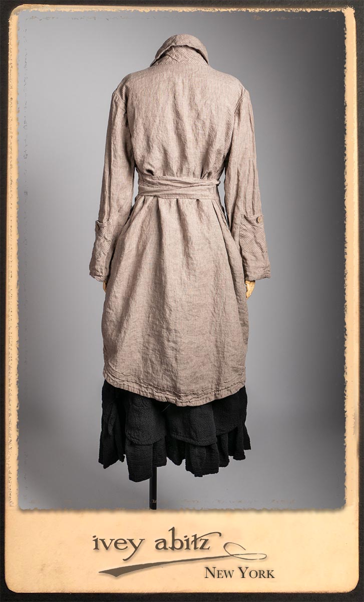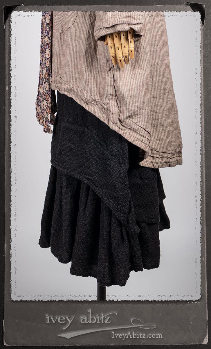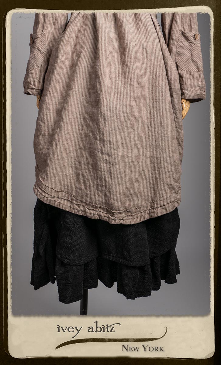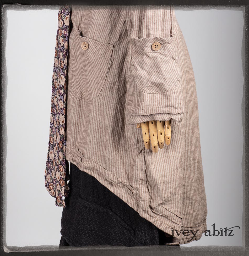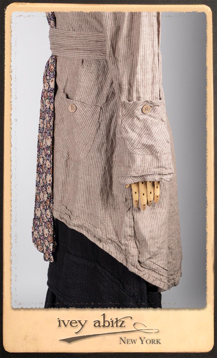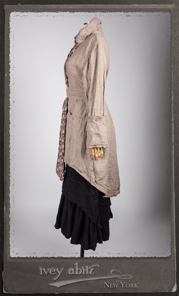 Amorette Shirt Jacket in Earthen Washed Stripe Linen; Blanchefleur Sash in Riverboat Floral Silk Chiffon; Blanchefleur Frock in Black Puckered Check Weave.