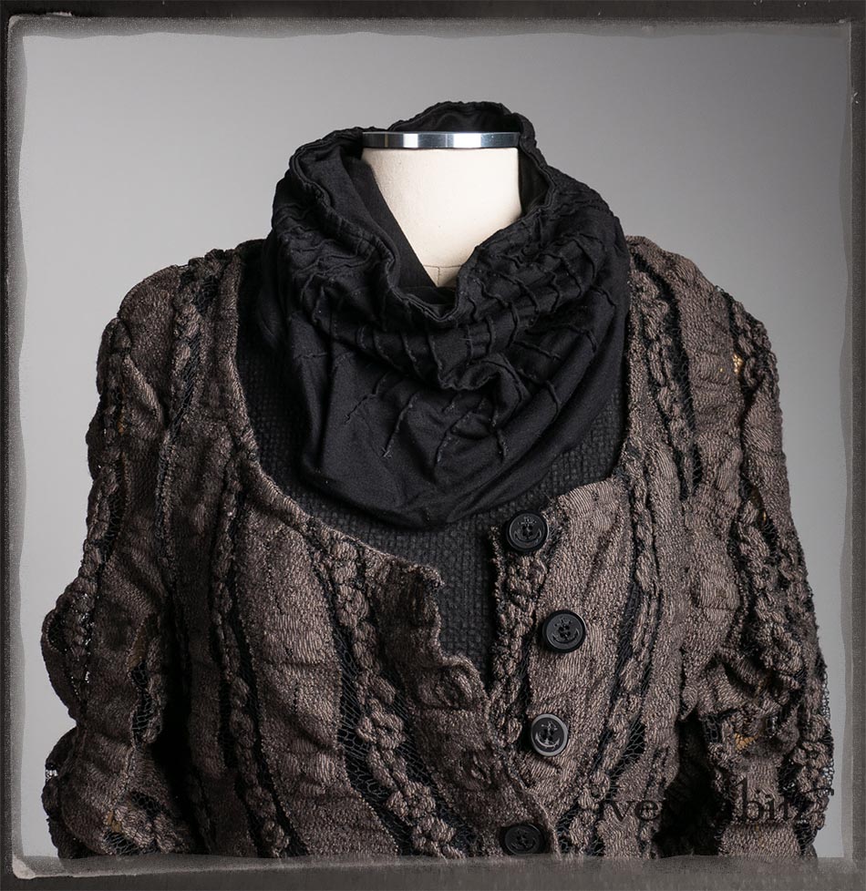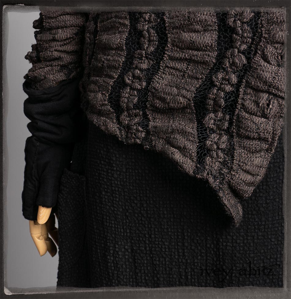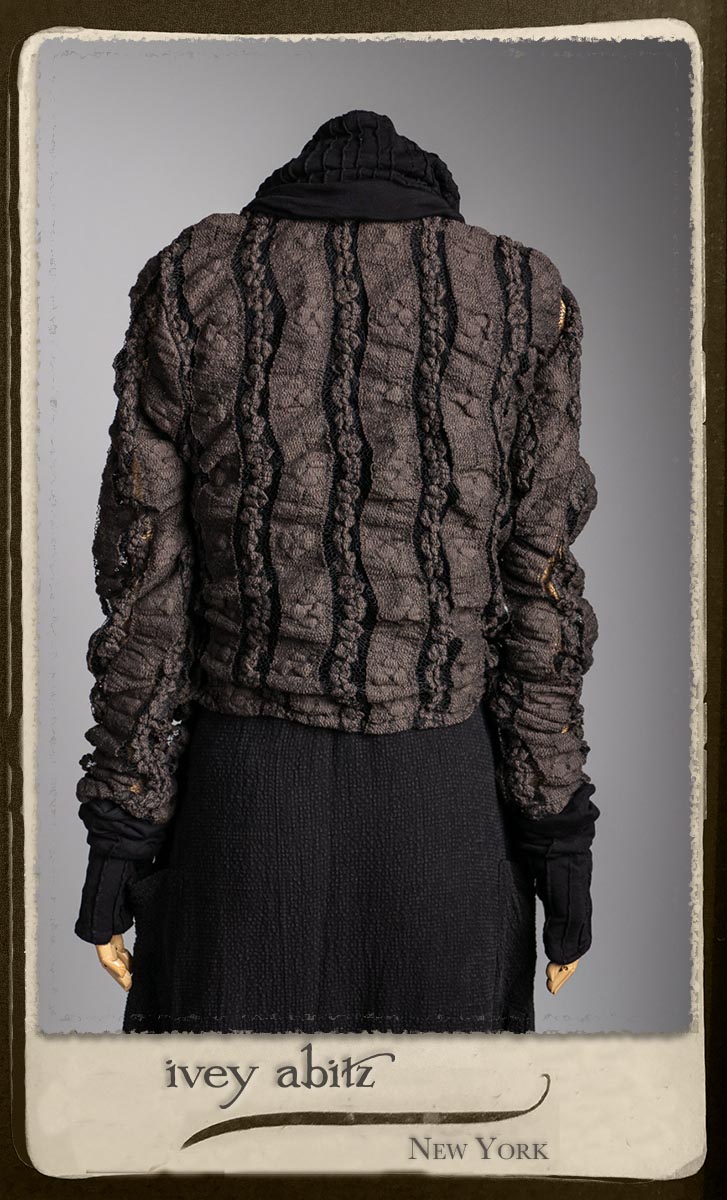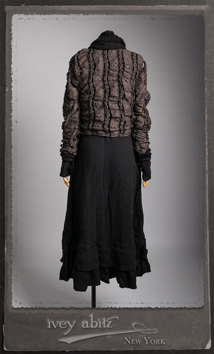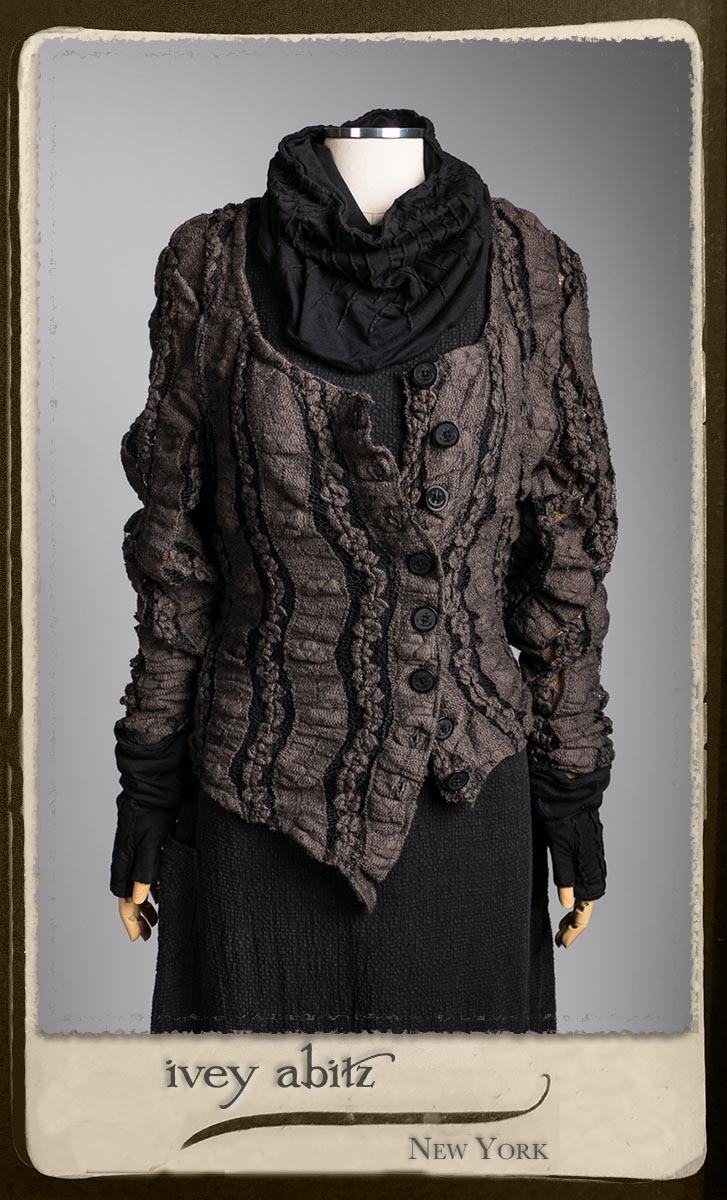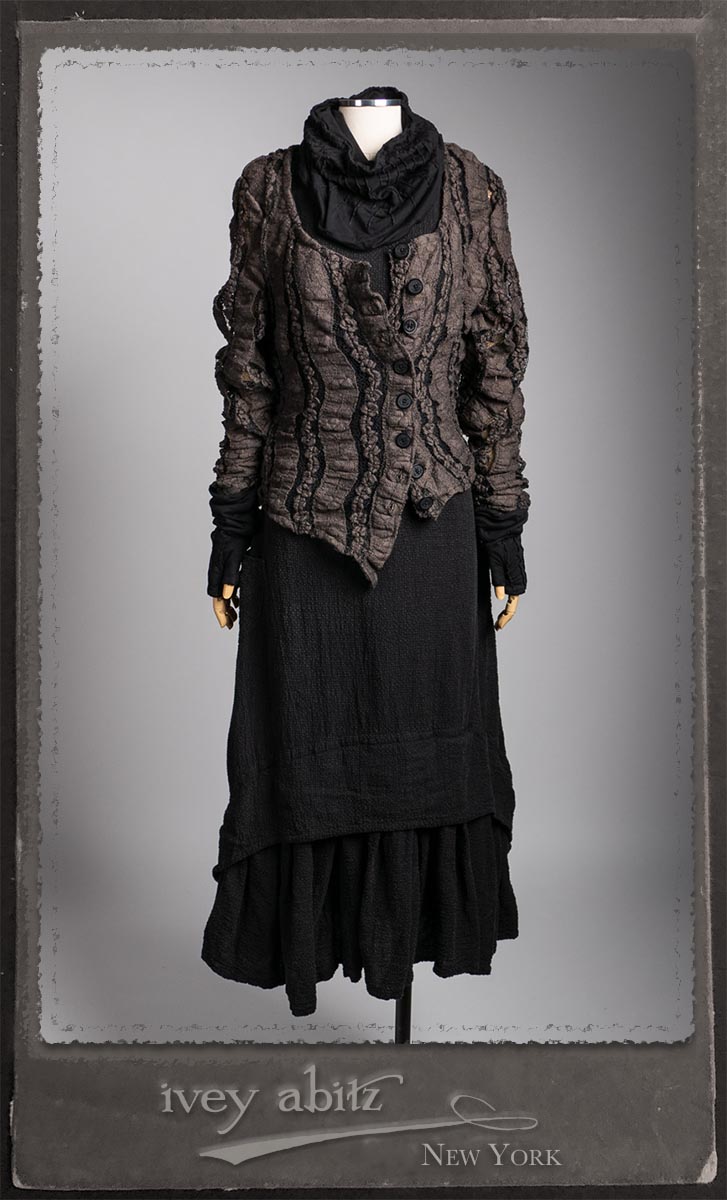 Elliot Jacket in Earthen Floral Wavy Stripe Knit; Lydia Neck Wrap and Gloves in Signature Black Washed Knit; Blanchefleur Frock in Black Puckered Check Weave.