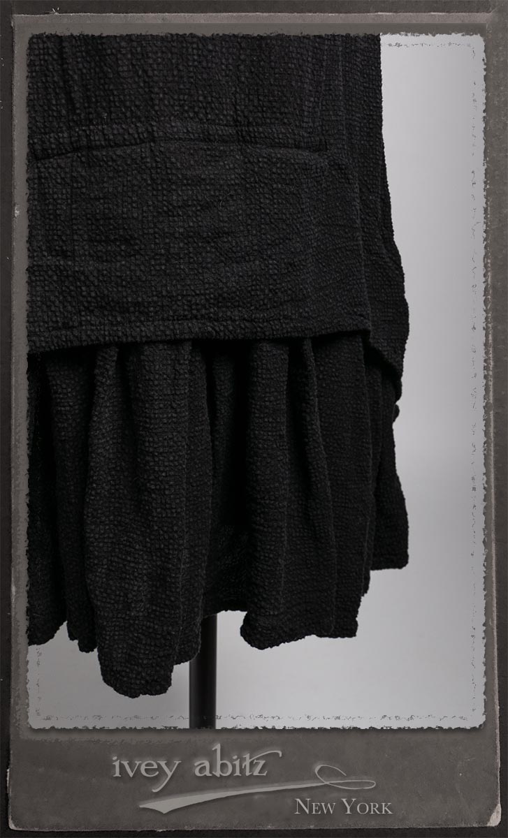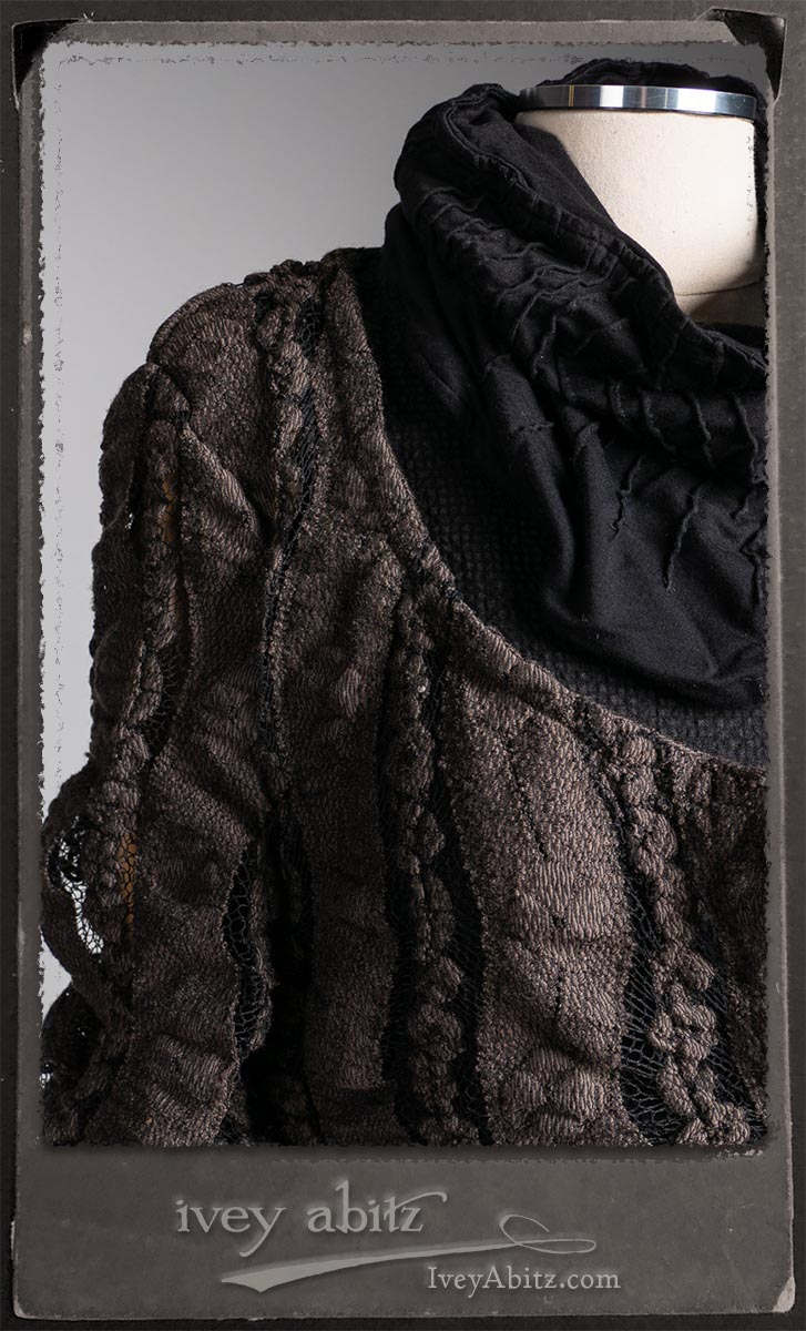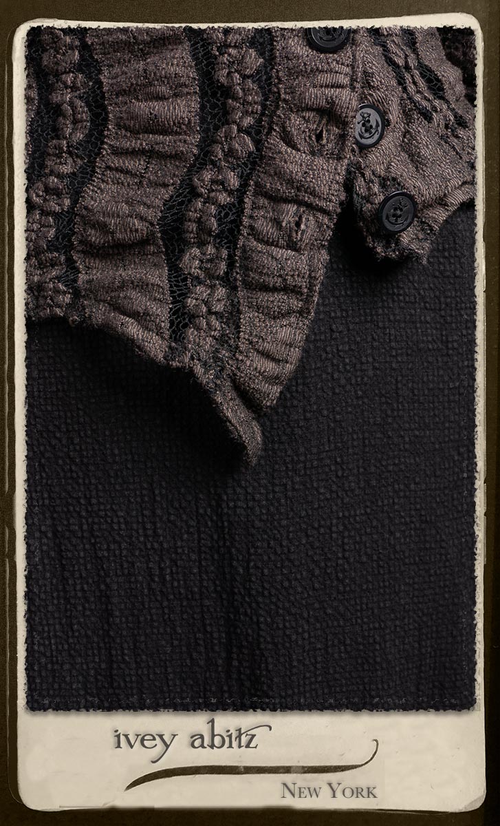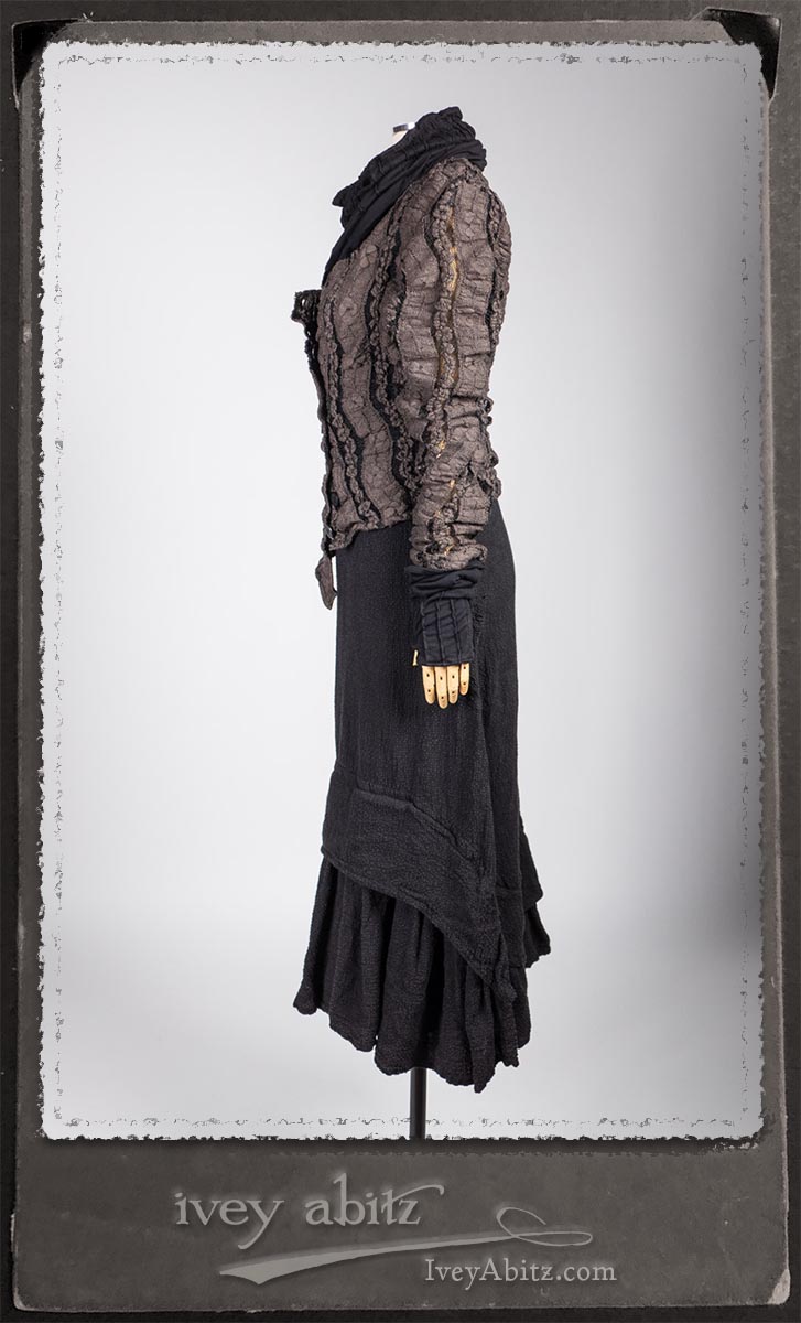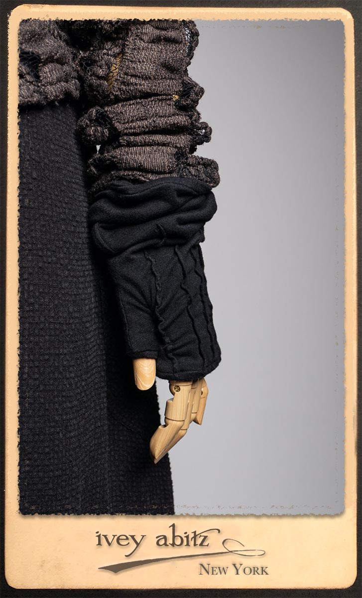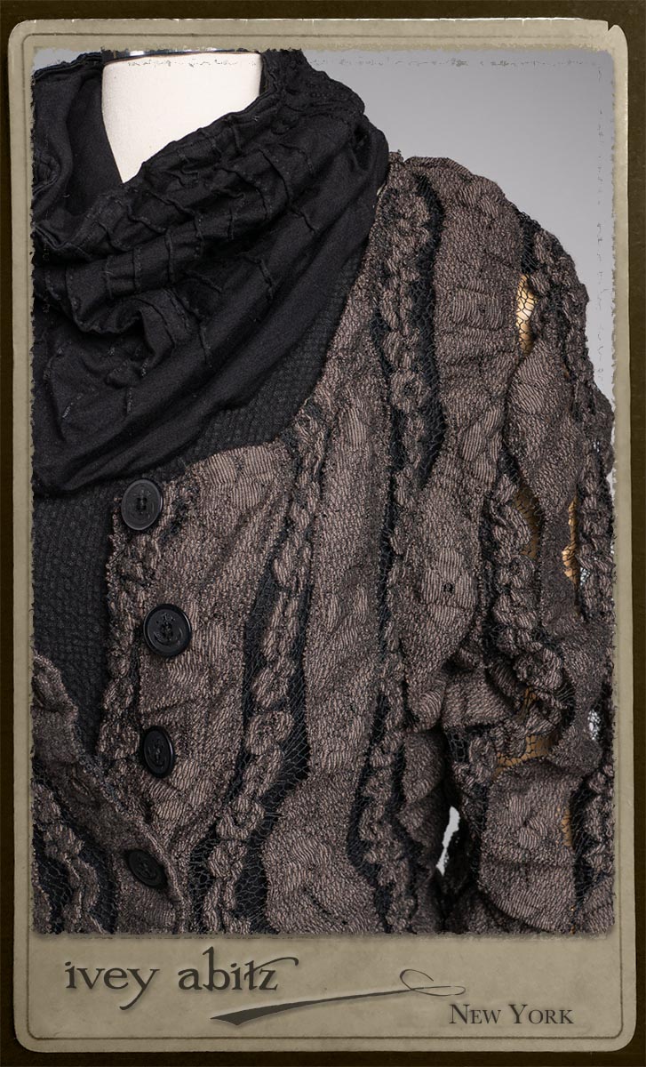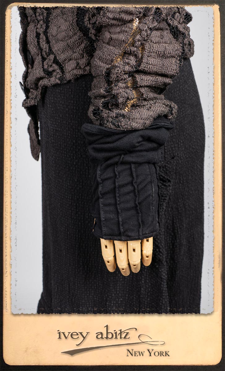 Elliot Jacket in Earthen Floral Wavy Stripe Knit; Lydia Neck Wrap and Gloves in Signature Black Washed Knit; Blanchefleur Frock in Black Puckered Check Weave.
