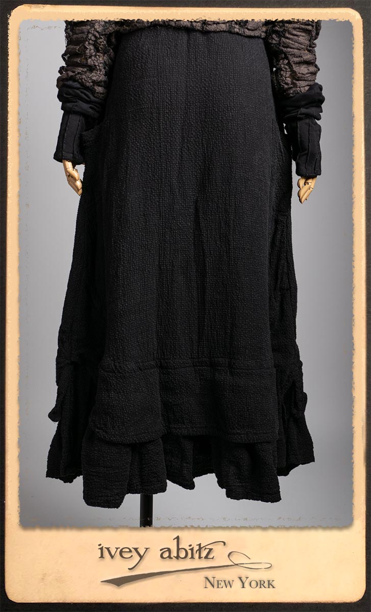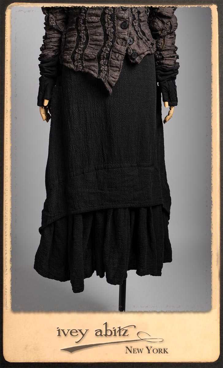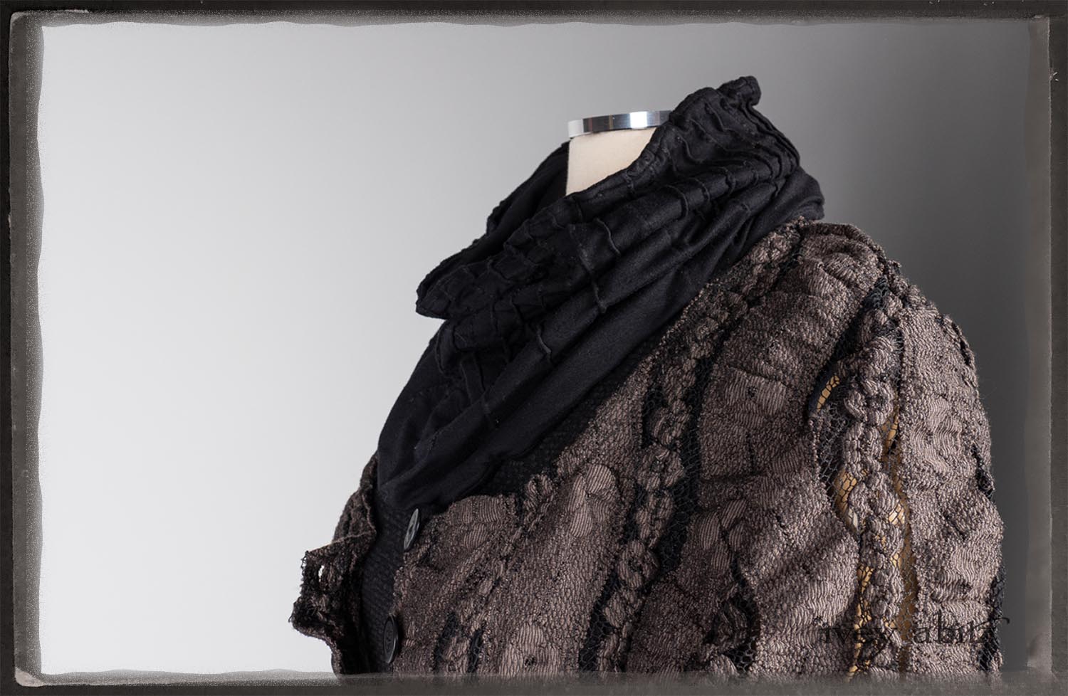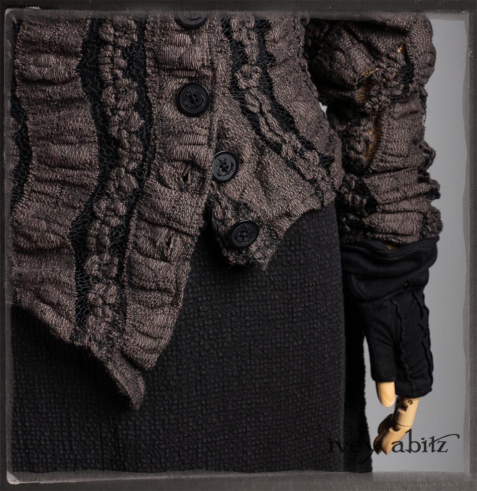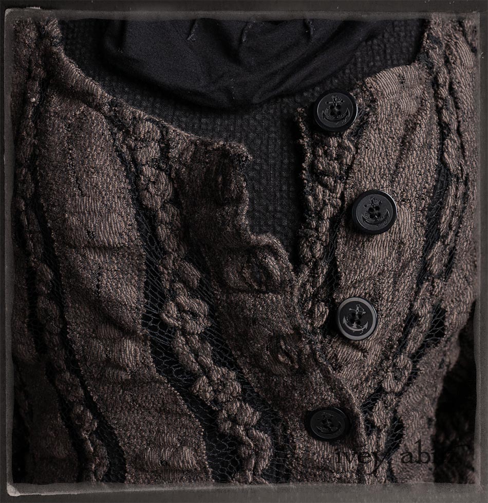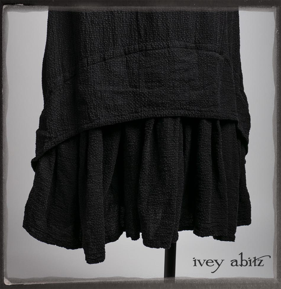 Elliot Jacket in Earthen Floral Wavy Stripe Knit; Lydia Neck Wrap and Gloves in Signature Black Washed Knit; Blanchefleur Frock in Black Puckered Check Weave.