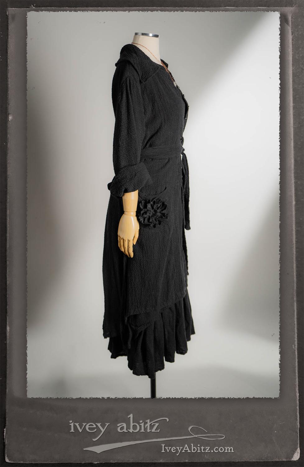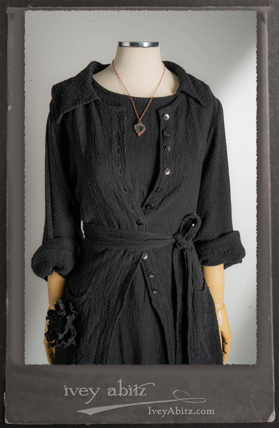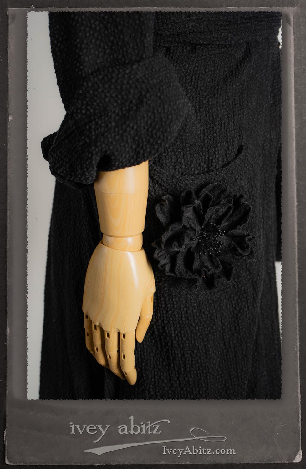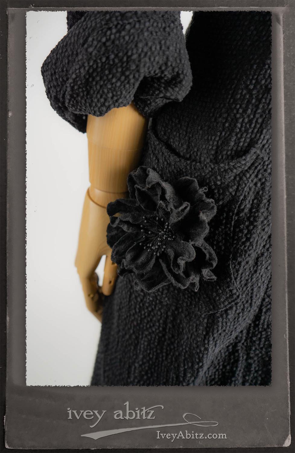Elsie Duster Coat in Black Puckered Check Weave; Blanchefleur Frock in Black Puckered Check Weave; Nouvelle Necklace; Bonheur Brooch in Black Sculpted Felt.