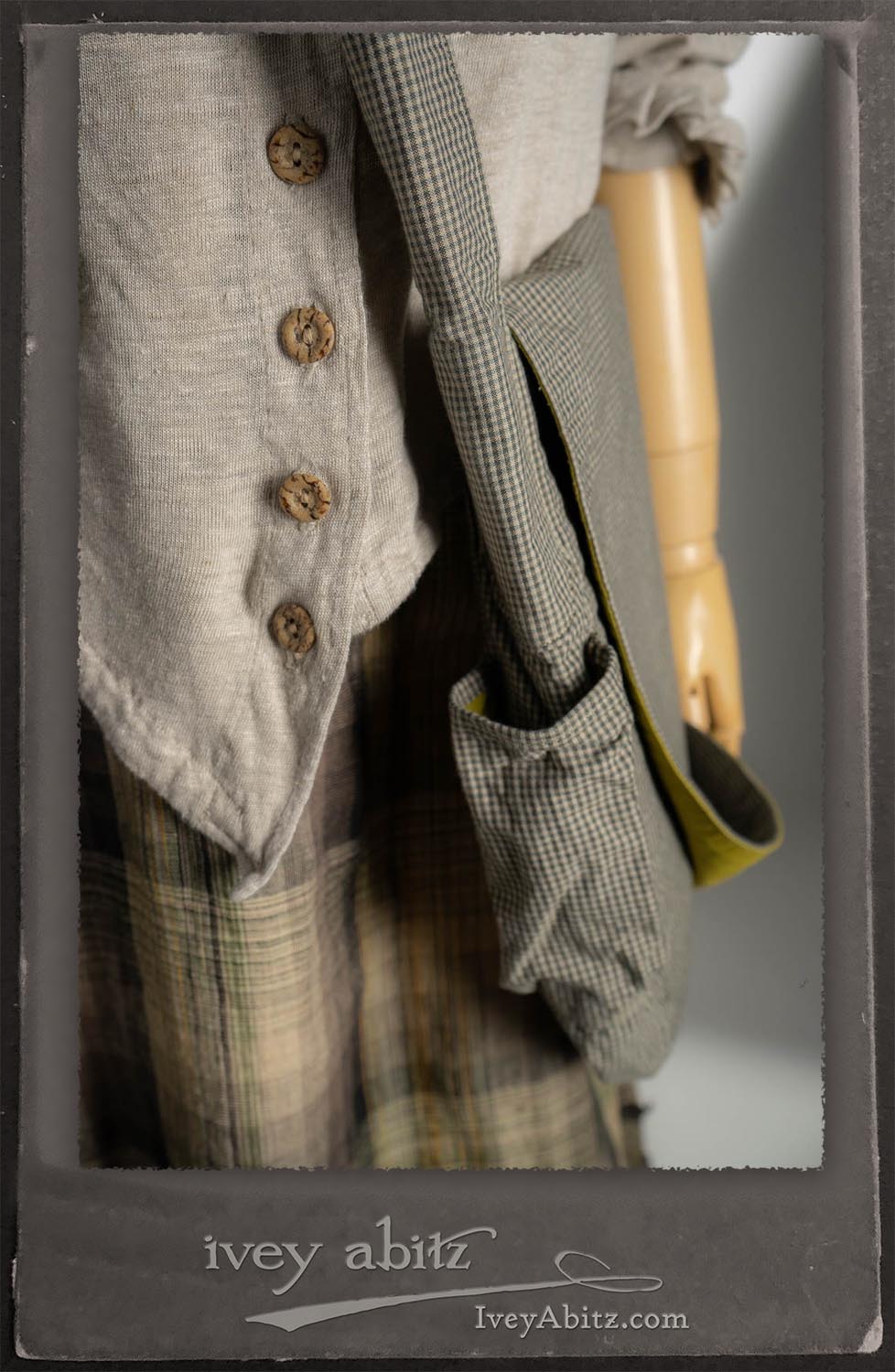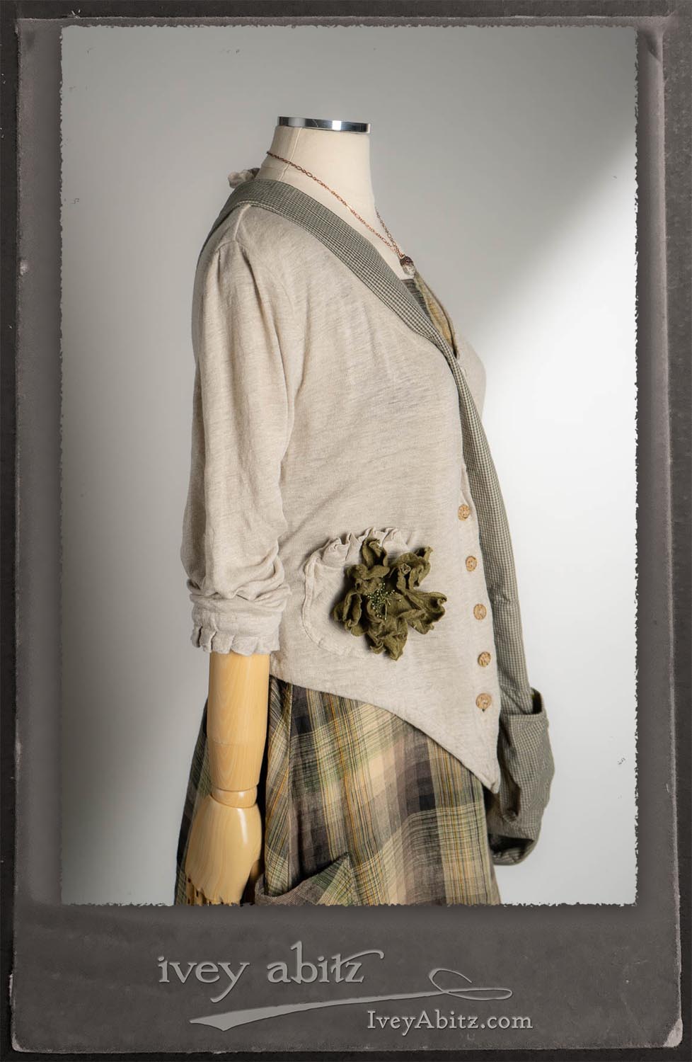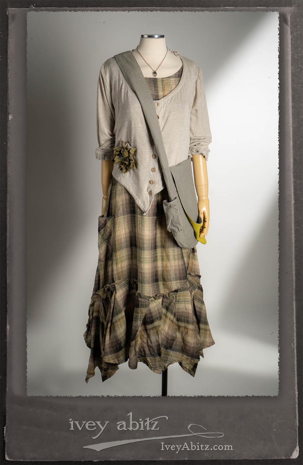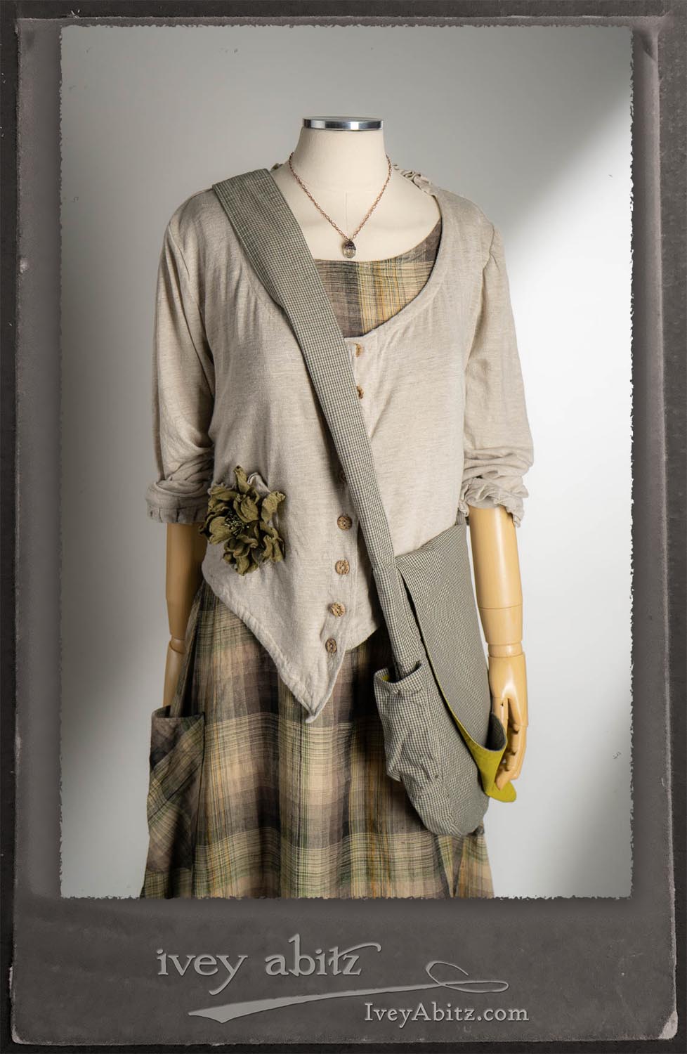 Canterbury Cardigan in Signature Sandy Lightweight Linen Knit; Bonheur Brooch in Olive Quartz Sculpted Felt; Fairholme Frock in Garden Plaid Linen; Nouvelle Necklace; Solomon Bag in Slate Petite Check Coating.