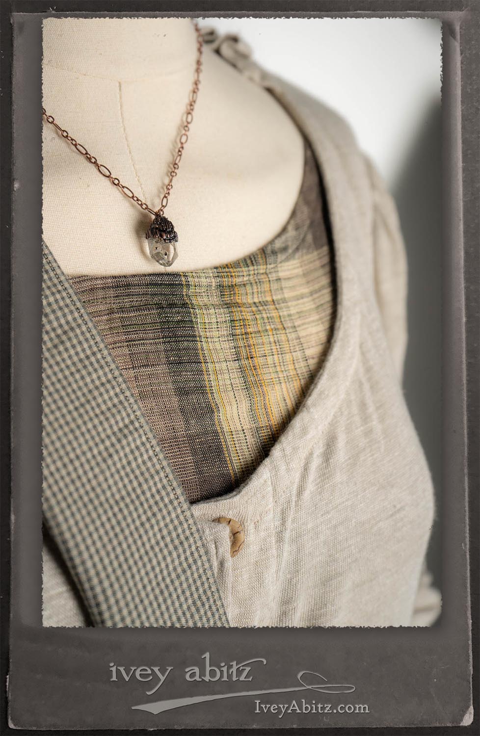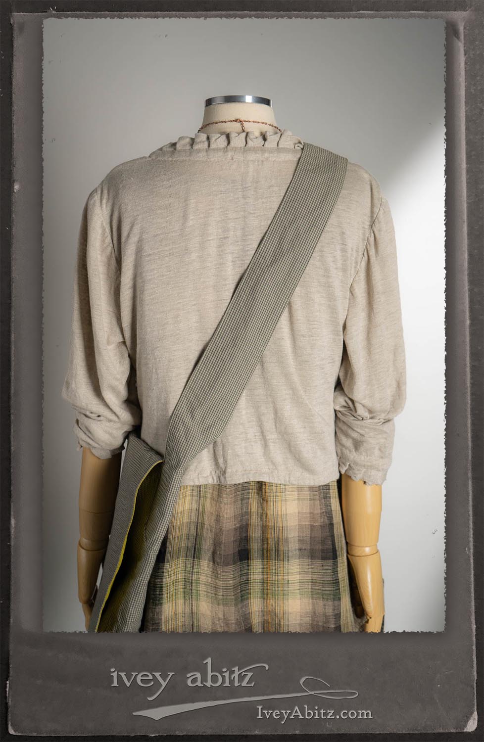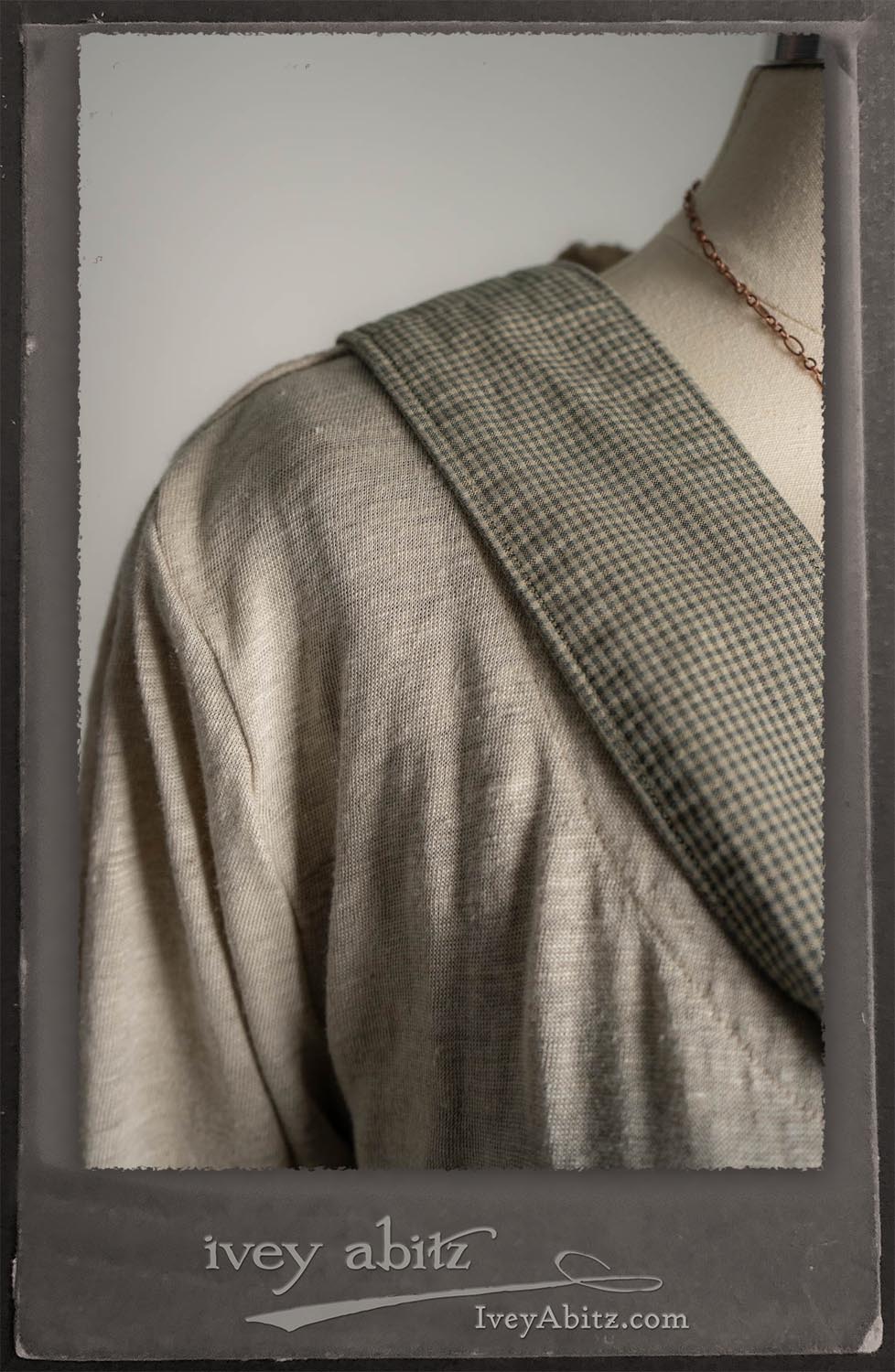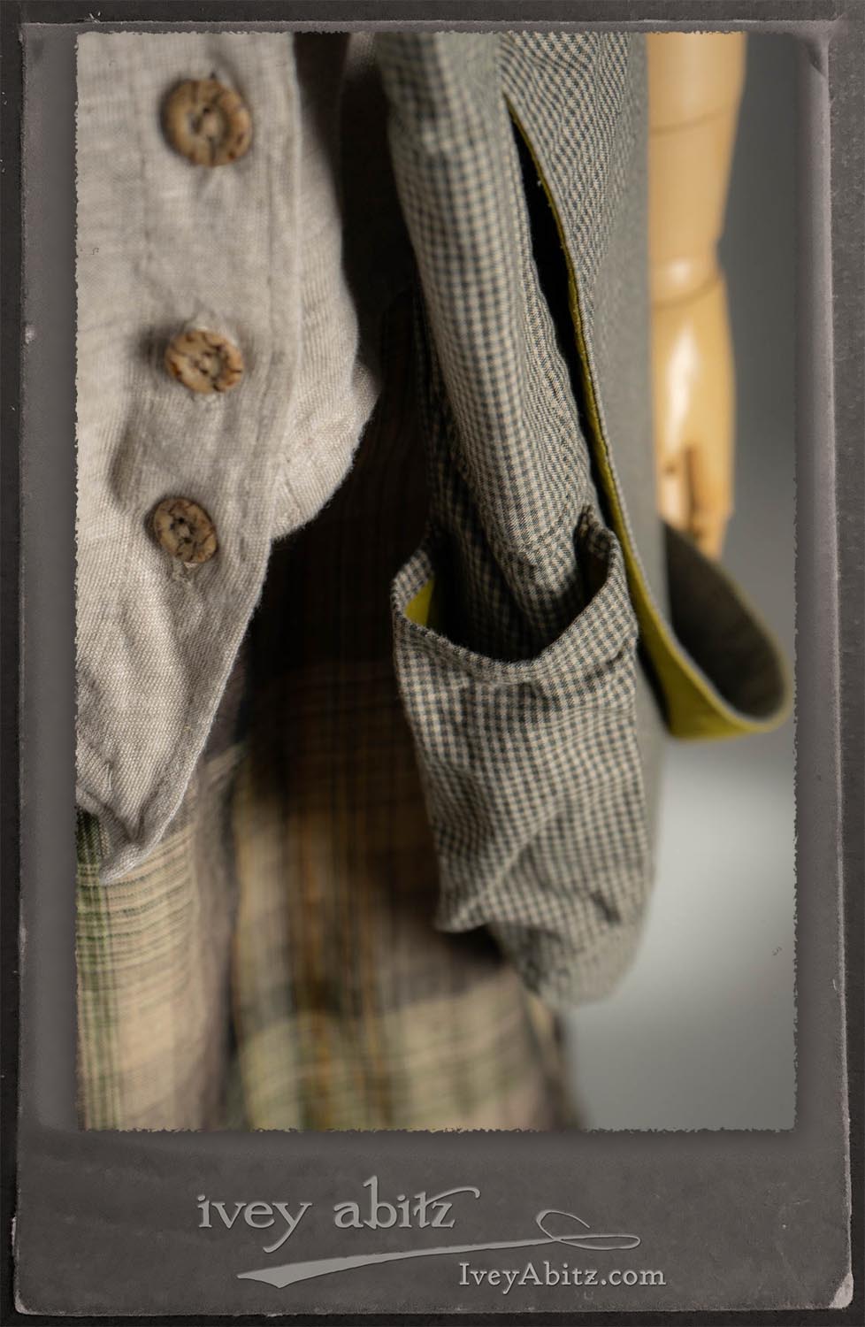 Canterbury Cardigan in Signature Sandy Lightweight Linen Knit; Bonheur Brooch in Olive Quartz Sculpted Felt; Fairholme Frock in Garden Plaid Linen; Nouvelle Necklace; Solomon Bag in Slate Petite Check Coating.
