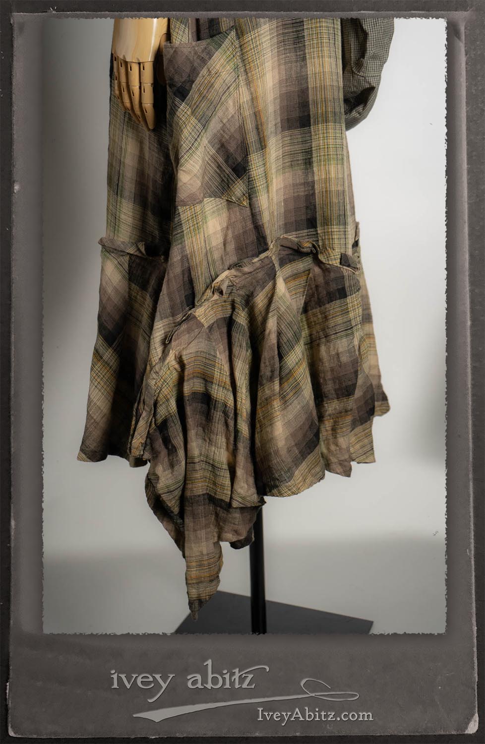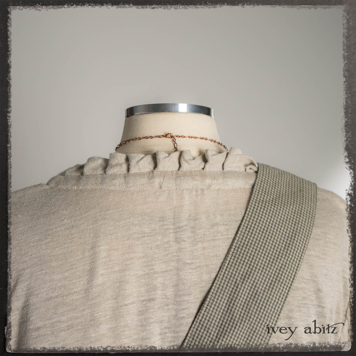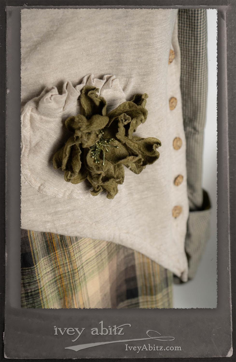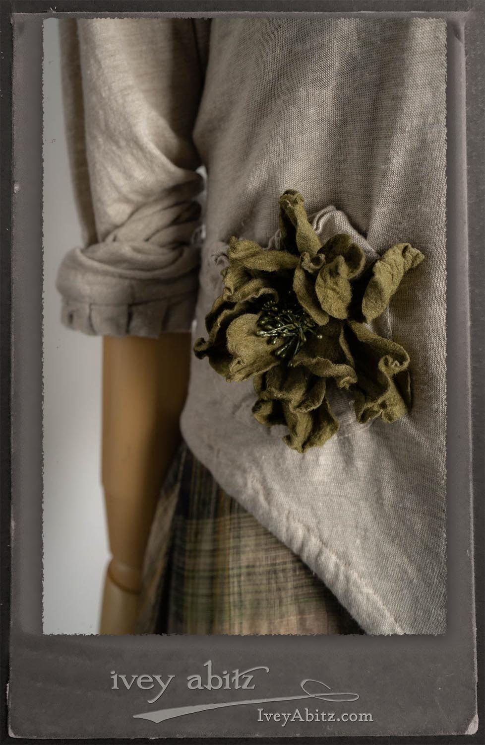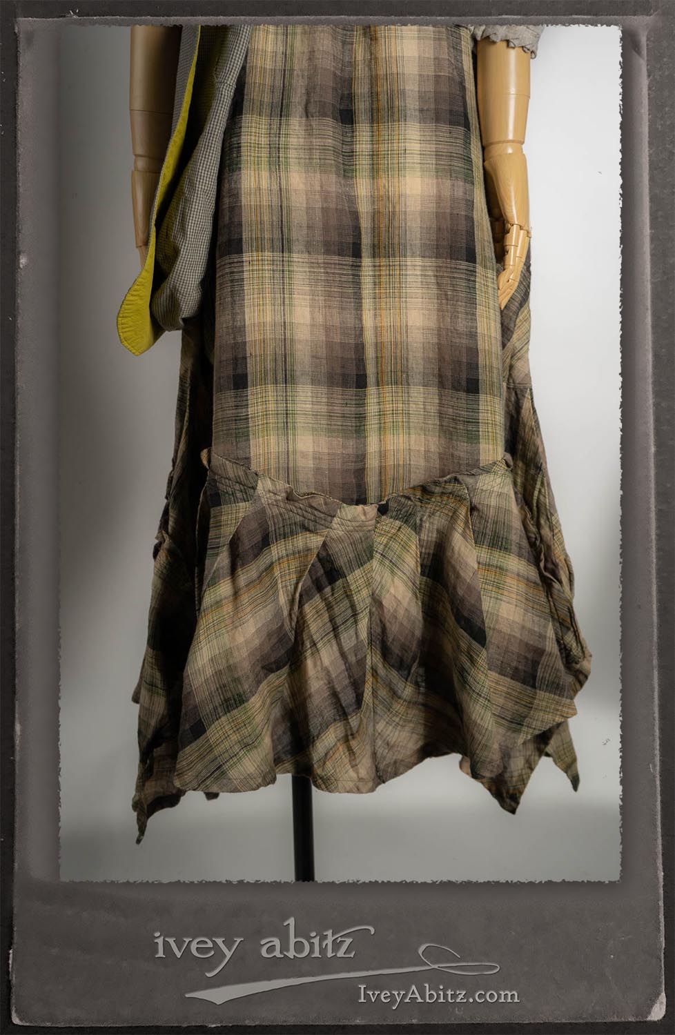 Canterbury Cardigan in Signature Sandy Lightweight Linen Knit; Bonheur Brooch in Olive Quartz Sculpted Felt; Fairholme Frock in Garden Plaid Linen; Nouvelle Necklace; Solomon Bag in Slate Petite Check Coating.