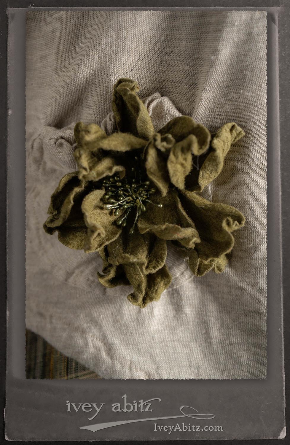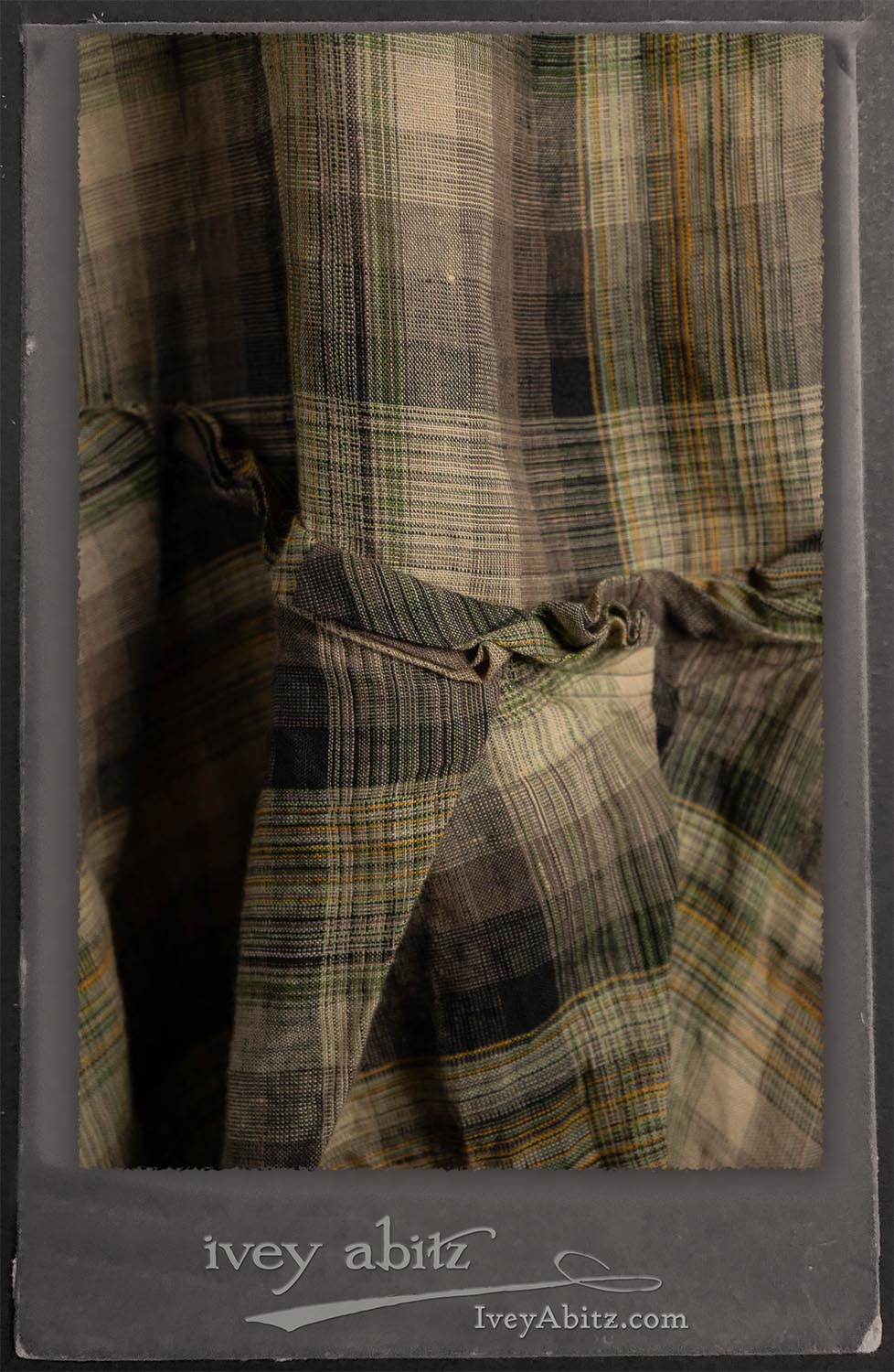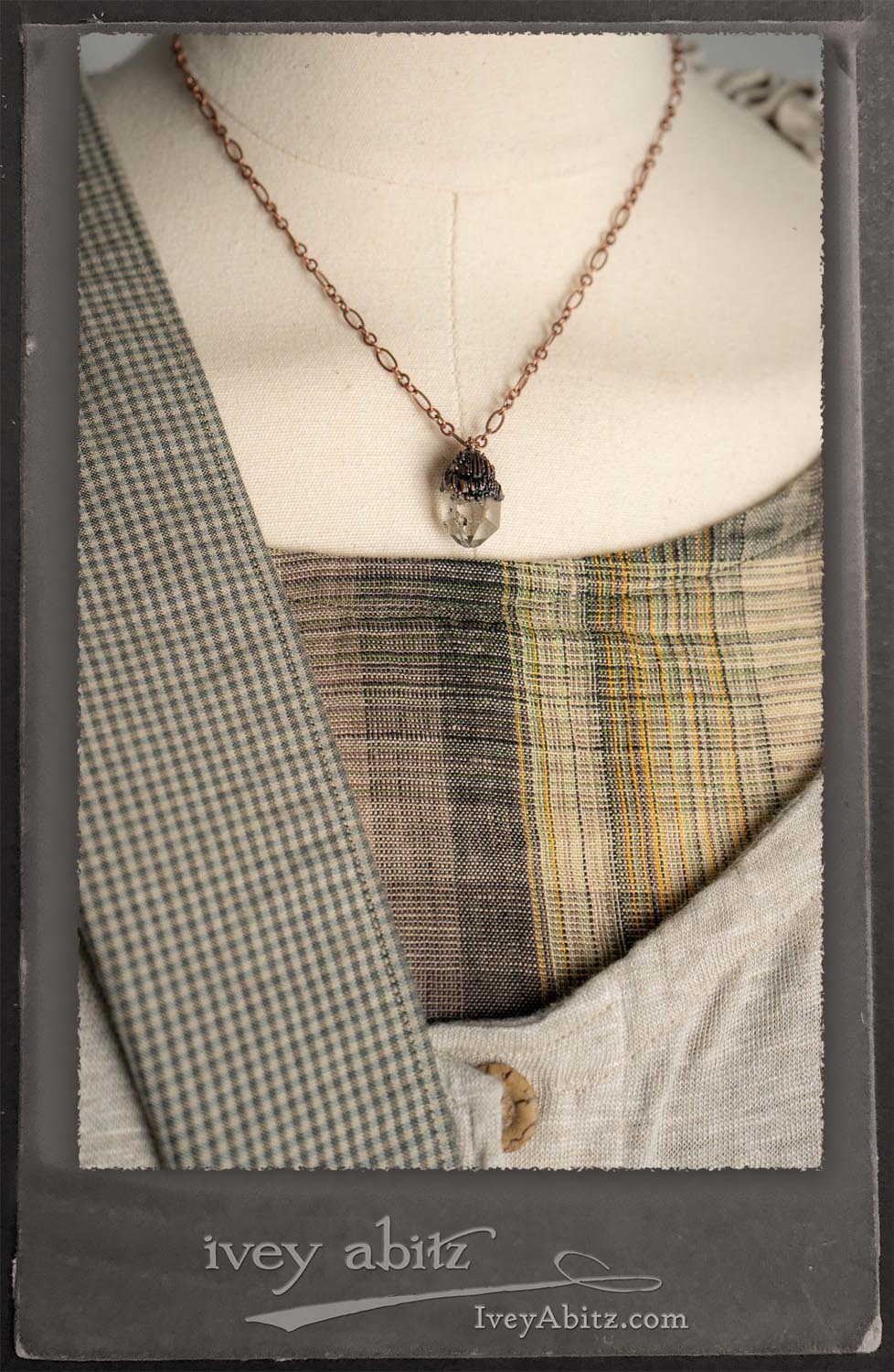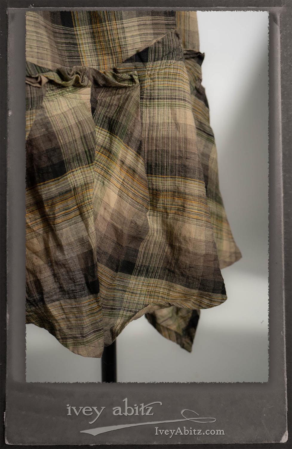 Canterbury Cardigan in Signature Sandy Lightweight Linen Knit; Bonheur Brooch in Olive Quartz Sculpted Felt; Fairholme Frock in Garden Plaid Linen; Nouvelle Necklace; Solomon Bag in Slate Petite Check Coating.
