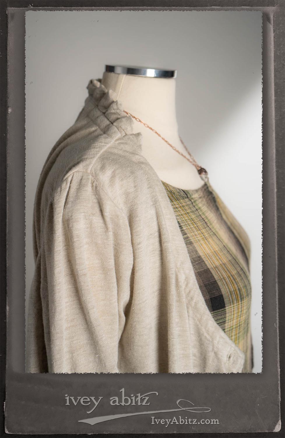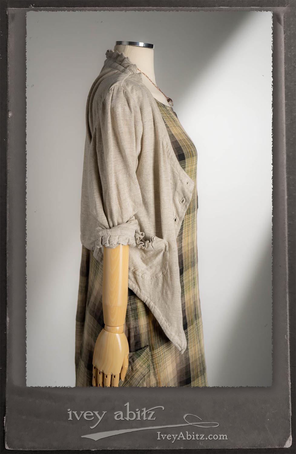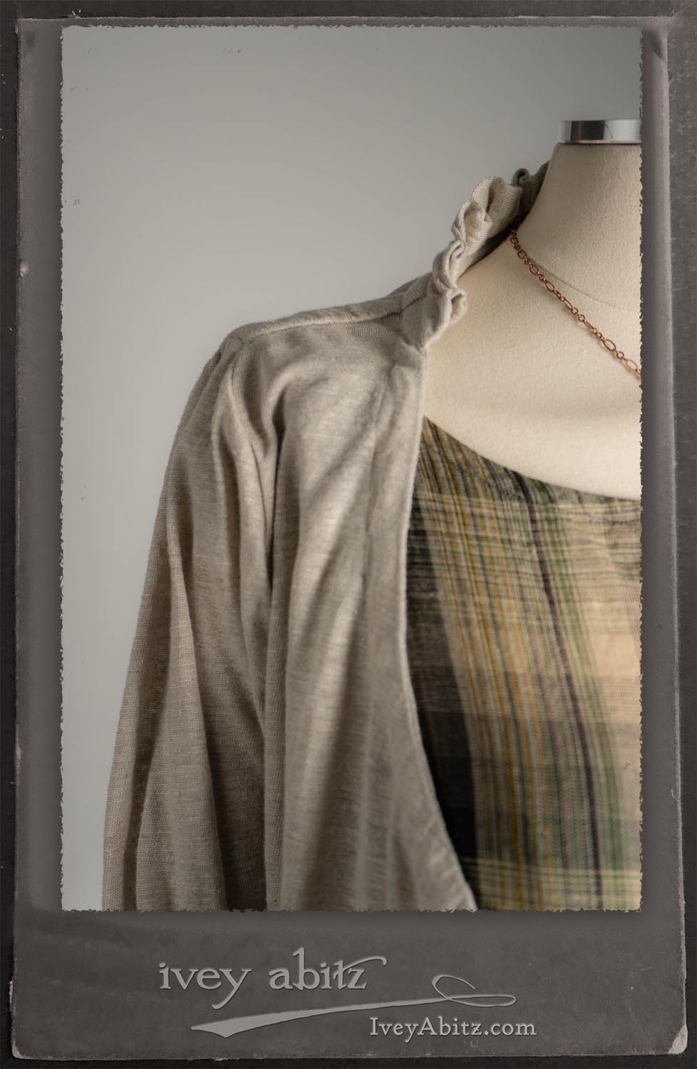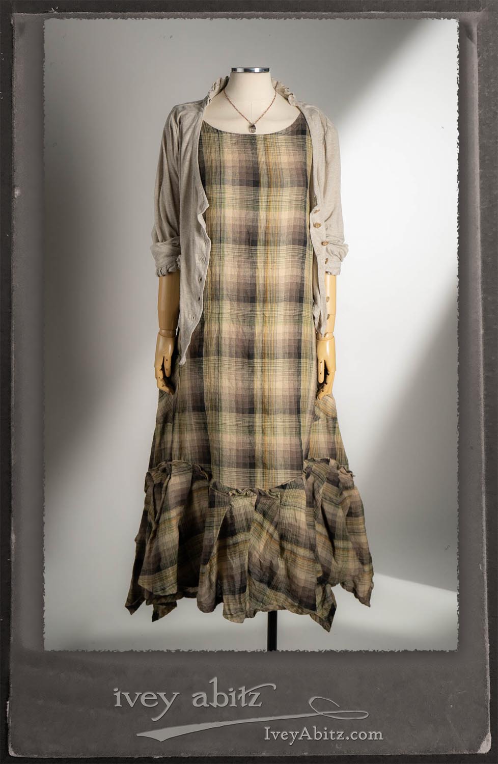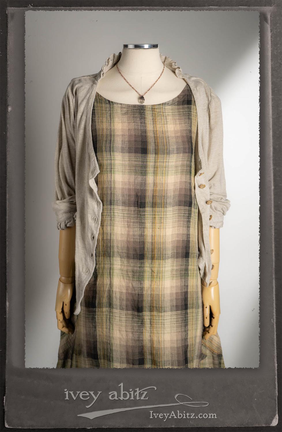 Canterbury Cardigan in Signature Sandy Lightweight Linen Knit; Nouvelle Necklace; Fairholme Frock in Garden Plaid Linen.