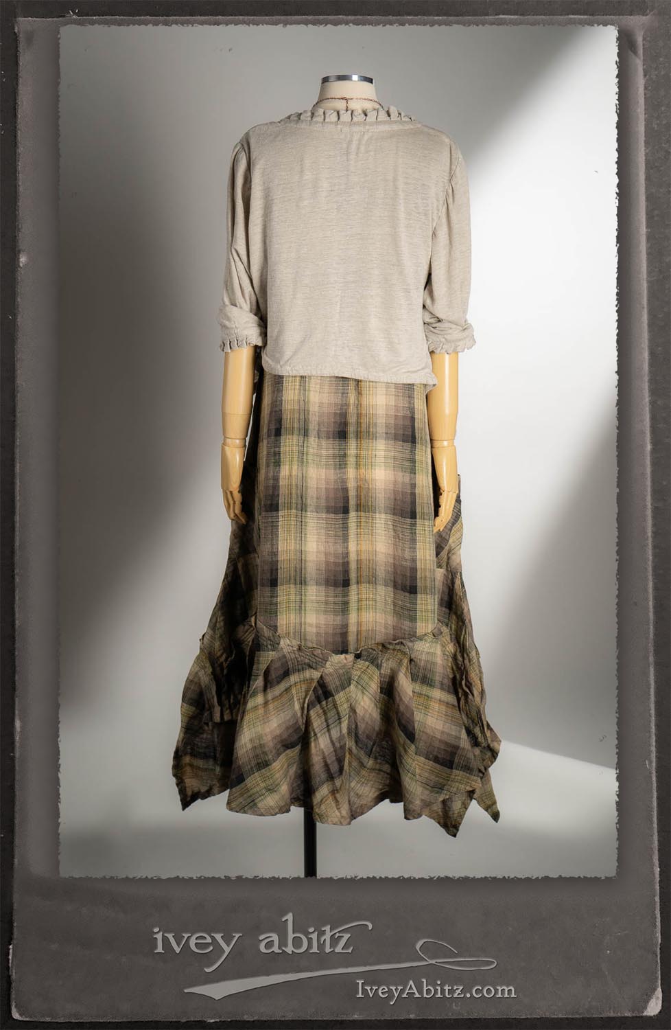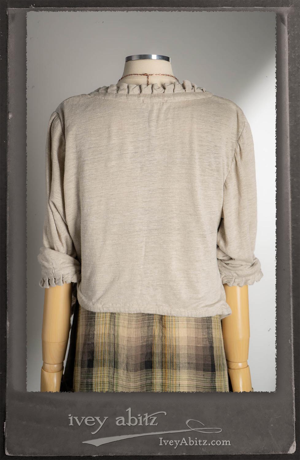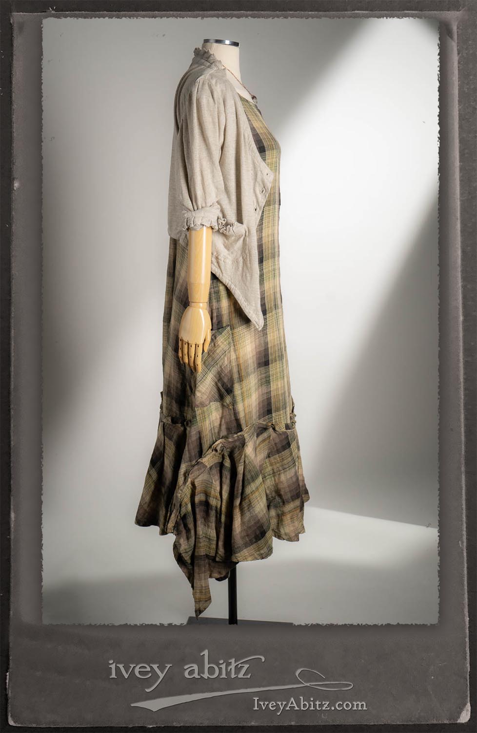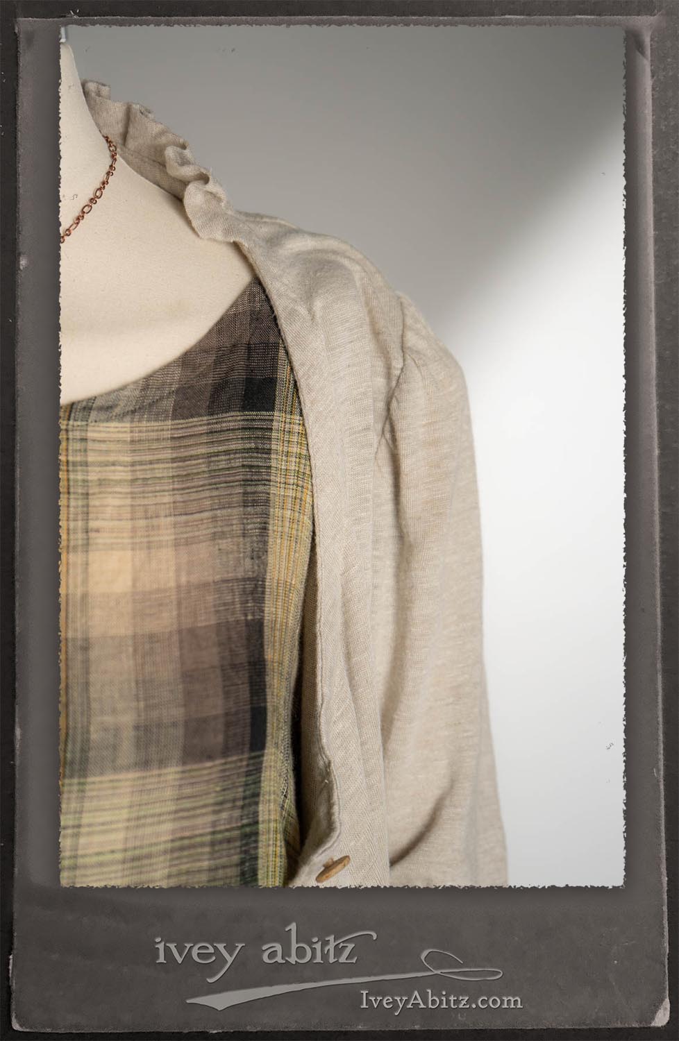 Canterbury Cardigan in Signature Sandy Lightweight Linen Knit; Nouvelle Necklace; Fairholme Frock in Garden Plaid Linen.