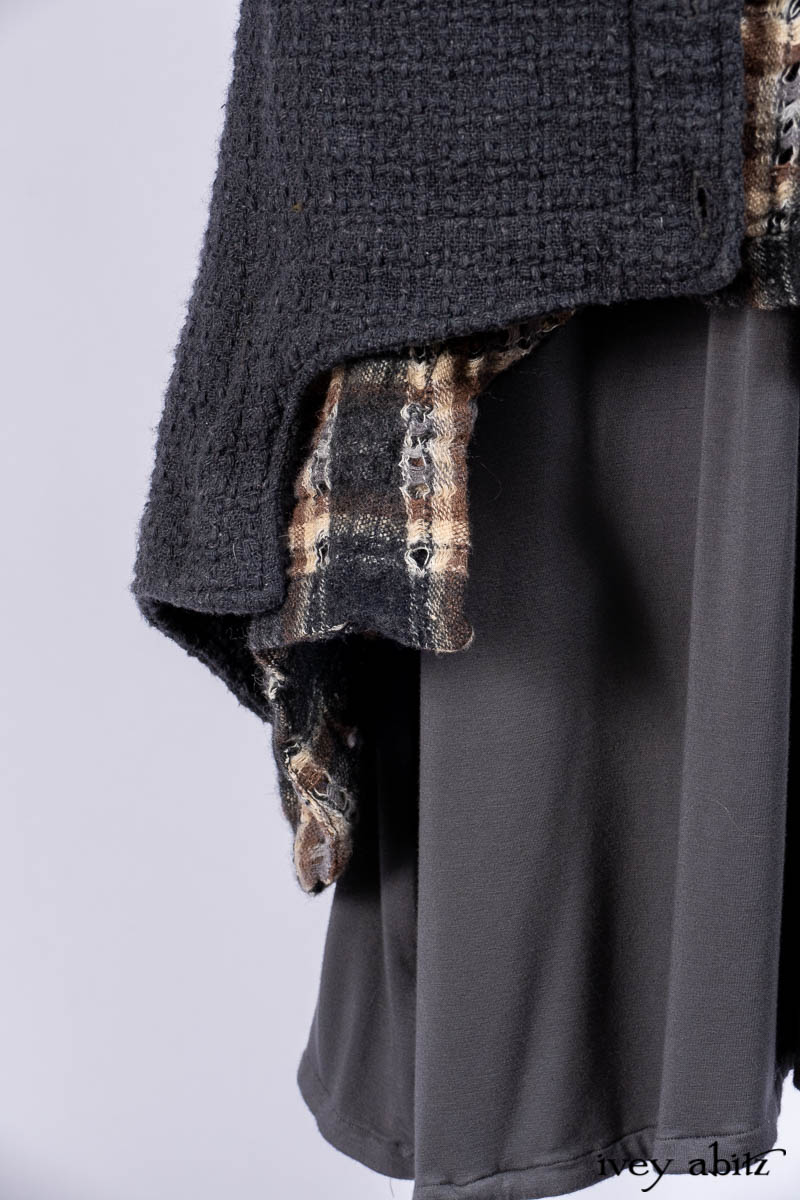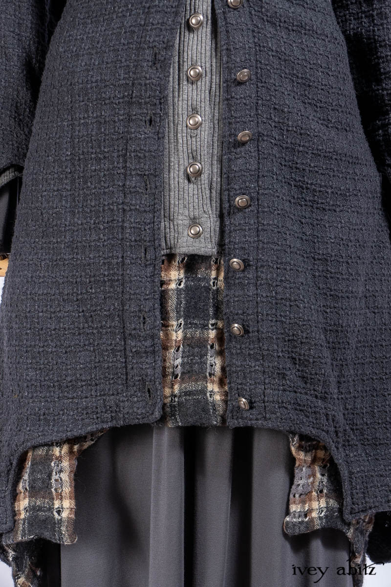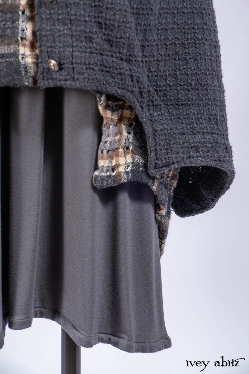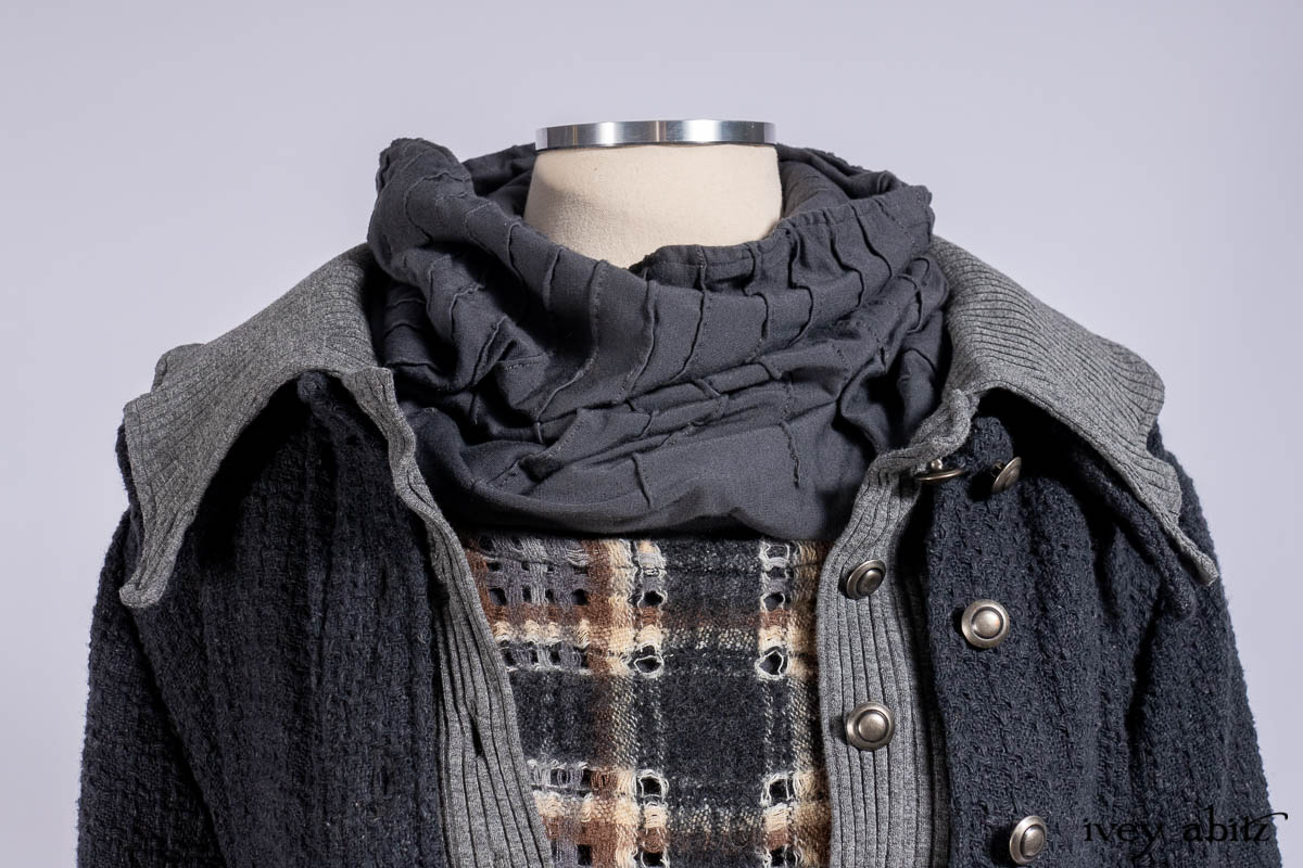 Chittister Duster Coat in Slate Embroidered Windowpane Weave; Chittister Shirt Jacket in Slate Ribbed Knit; Lydia Neck Wrap in Slate Washed Knit; Chittister Frock in Slate and Brownstone Plaid Wool; Elliot Dress in Slate Washed Knit.