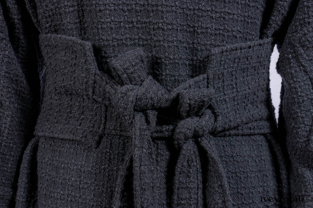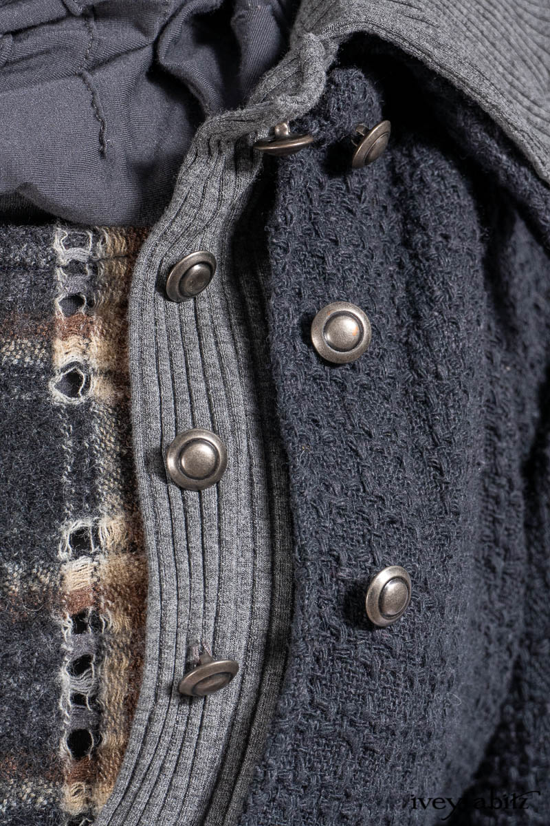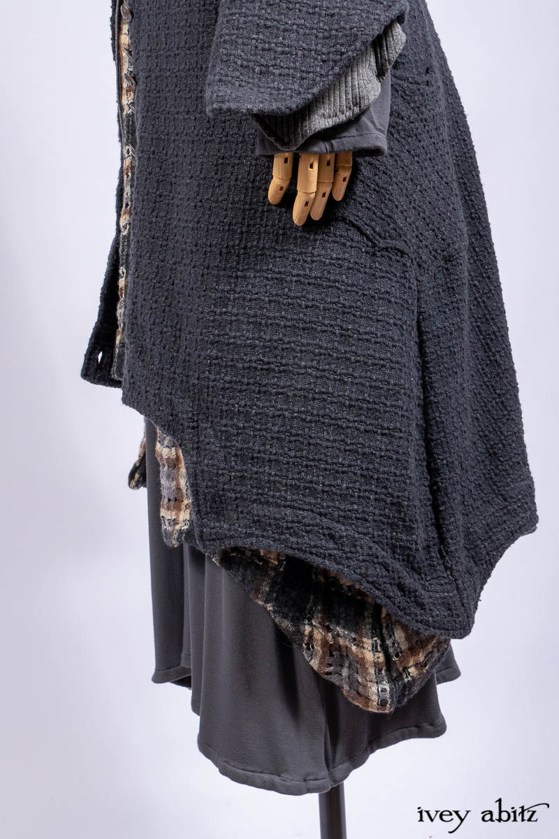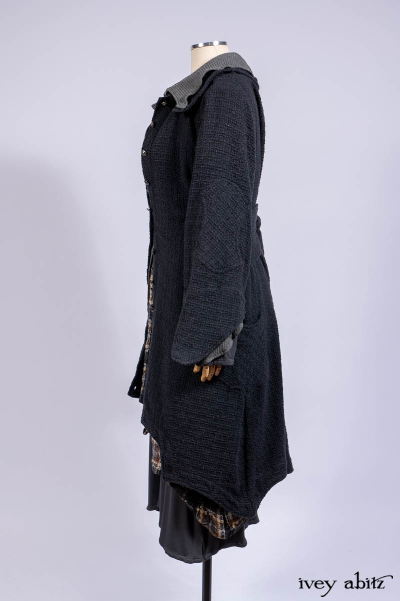 Chittister Duster Coat in Slate Embroidered Windowpane Weave; Chittister Shirt Jacket in Slate Ribbed Knit; Lydia Neck Wrap in Slate Washed Knit; Chittister Frock in Slate and Brownstone Plaid Wool; Elliot Dress in Slate Washed Knit.