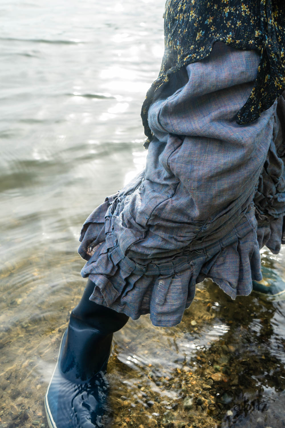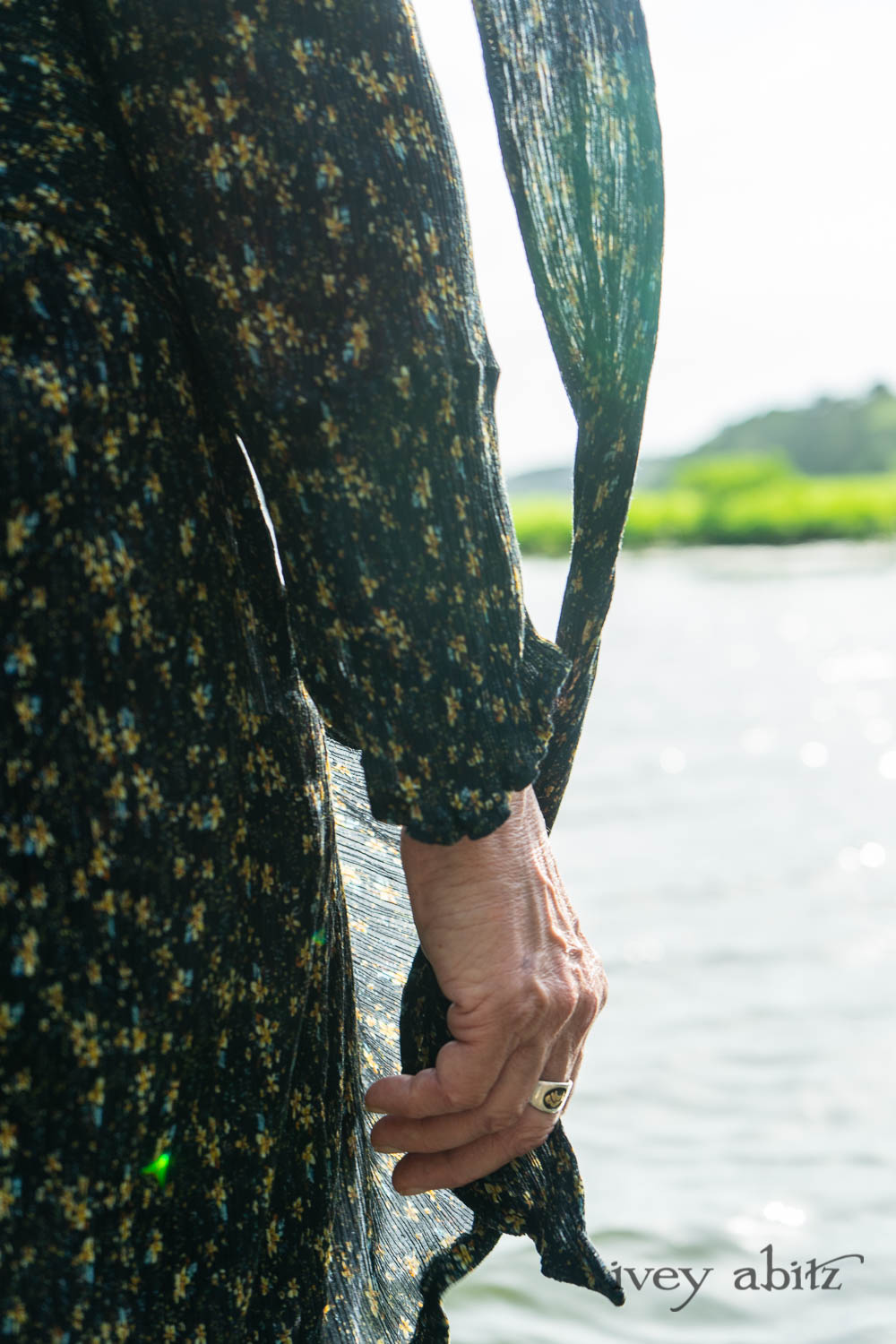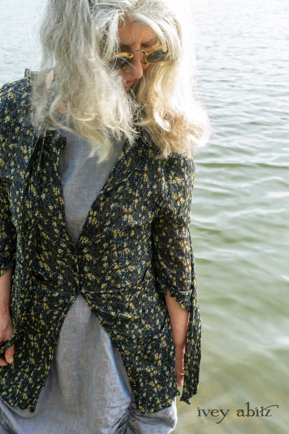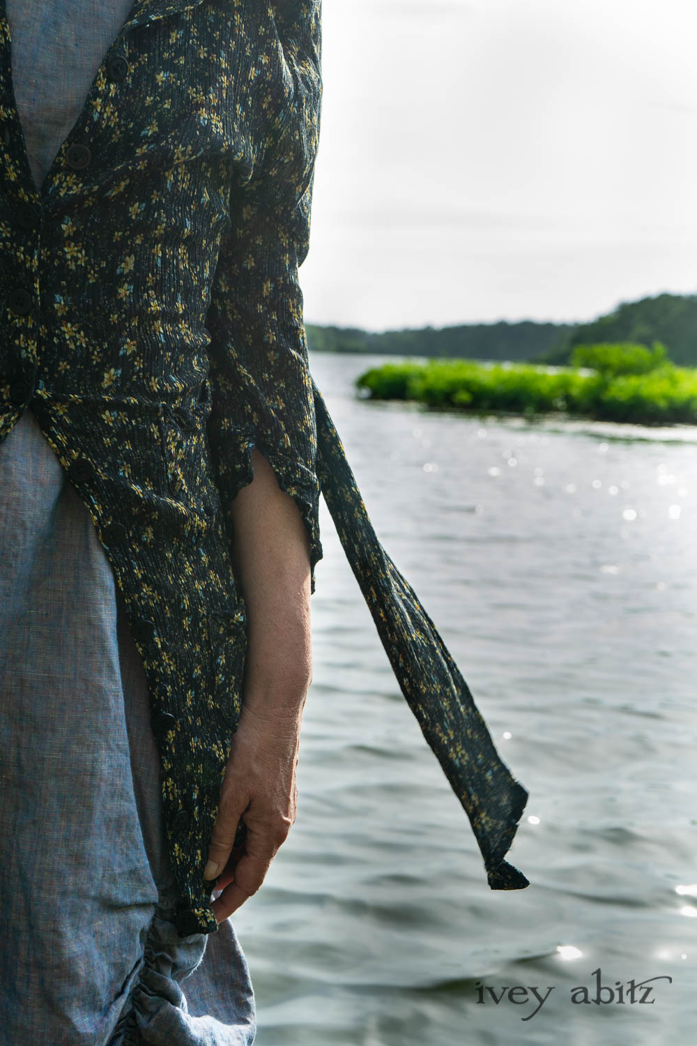 Milton Duster Coat in Summer Land Crinkled Silk Chiffon; Clemmie Frock in Cape Sunrise Washed Linen; Fairholme Sash in Summer Land Floral Silk Chiffon. Ivey Abitz Bespoke Clothing.