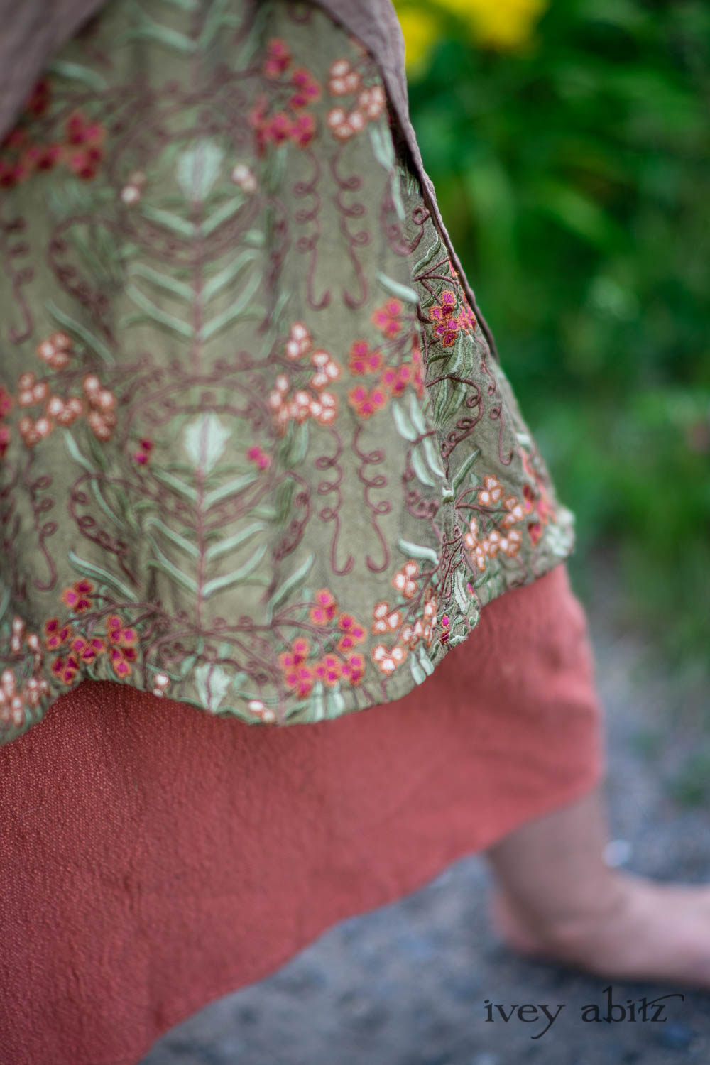 Lumiere Jacket in Coral Washed Voile; River Frock in Woodlawn Vine Embroidered Washed Silk; Ans Frock in Coral Silk Cotton Old World Weave. Ivey Abitz Bespoke Clothing.