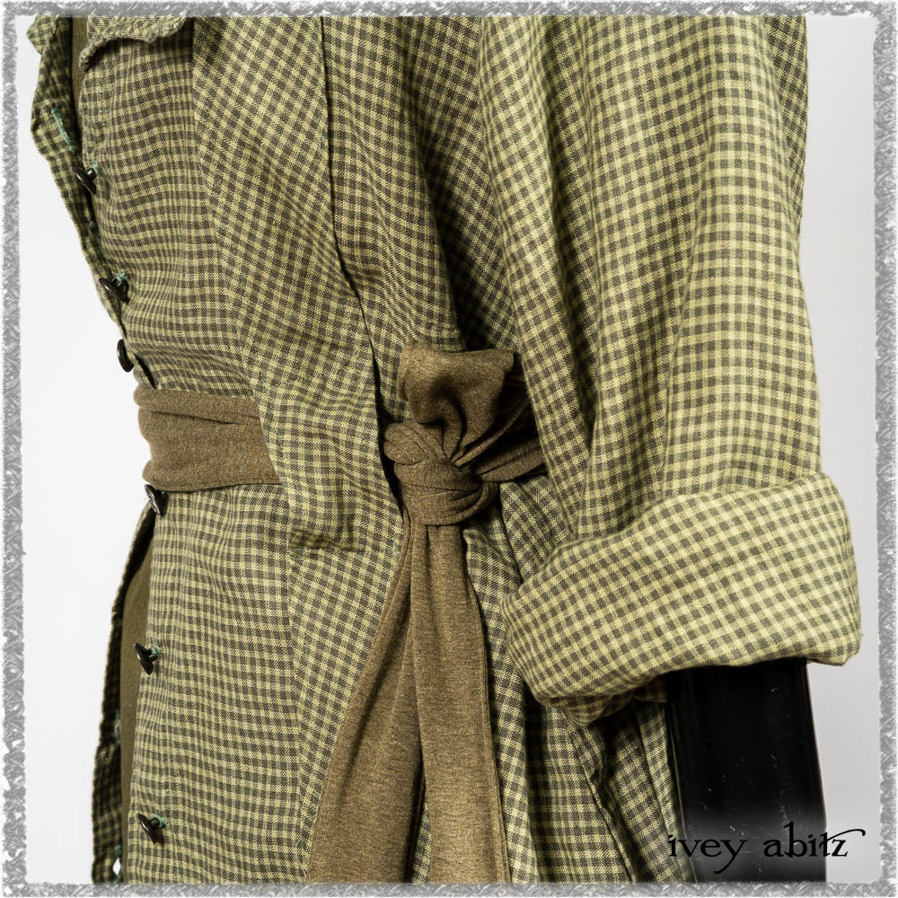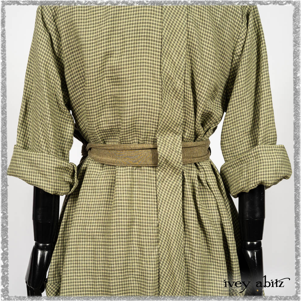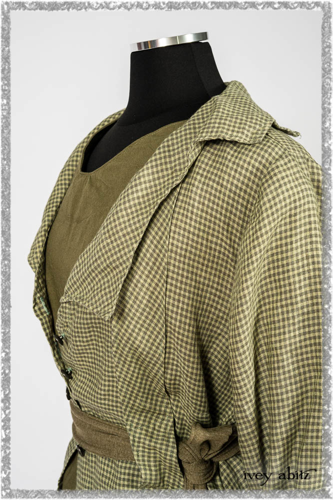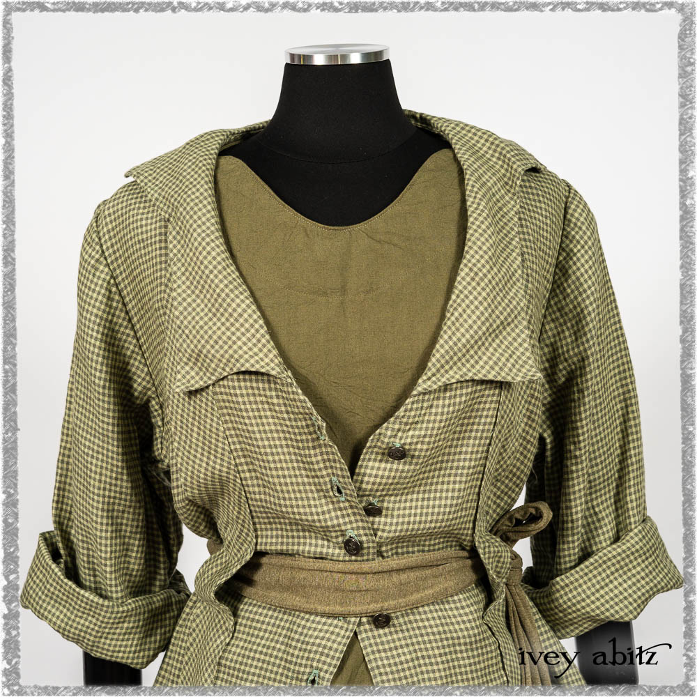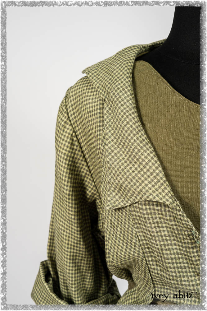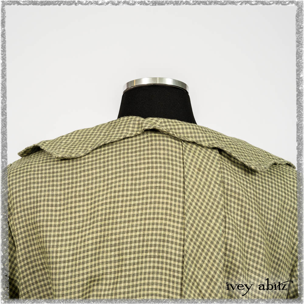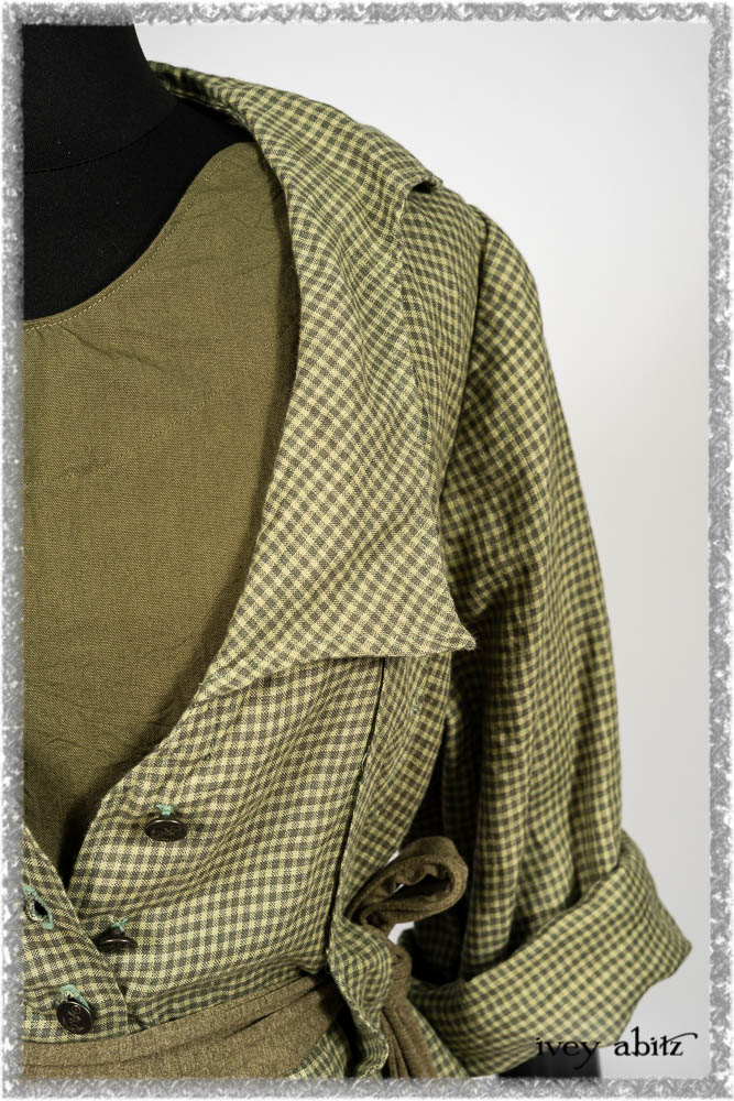 Vanetten Duster Coat in Seagrass Petite Check Linen; Saint Ans Sash in Woodlawn Melange Knit; Saint Ans Frock in Seagrass Crushed Cotton with mix of sculptural details created in rare weaves. Ivey Abitz bespoke clothing.