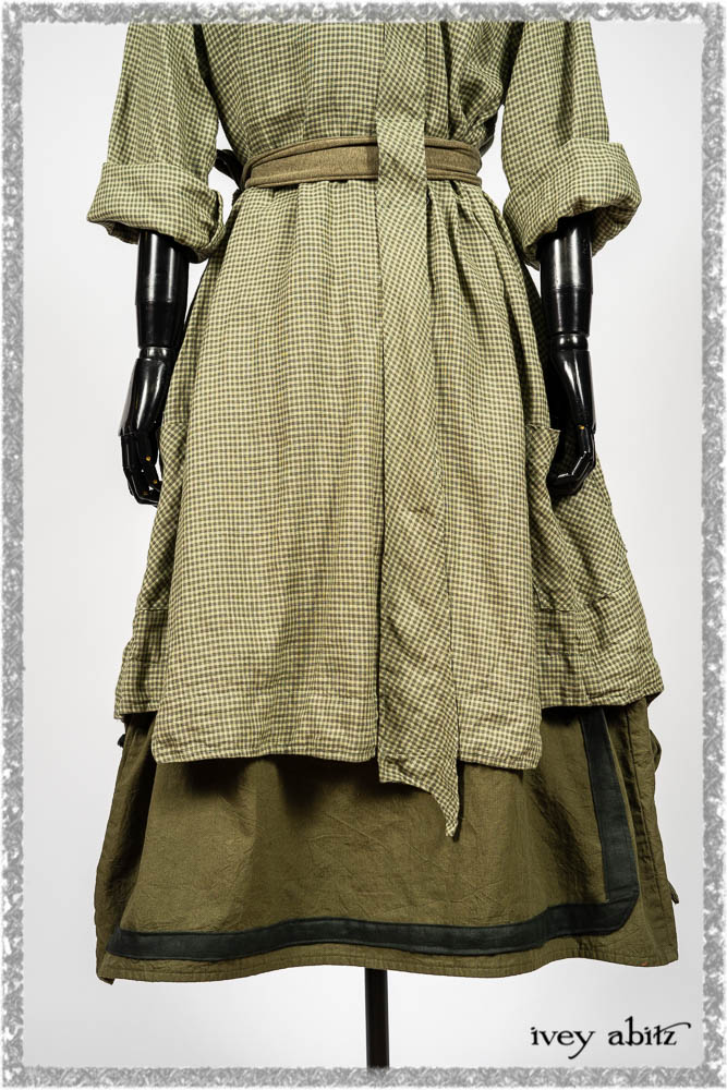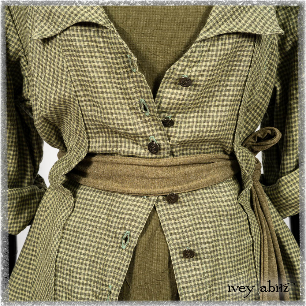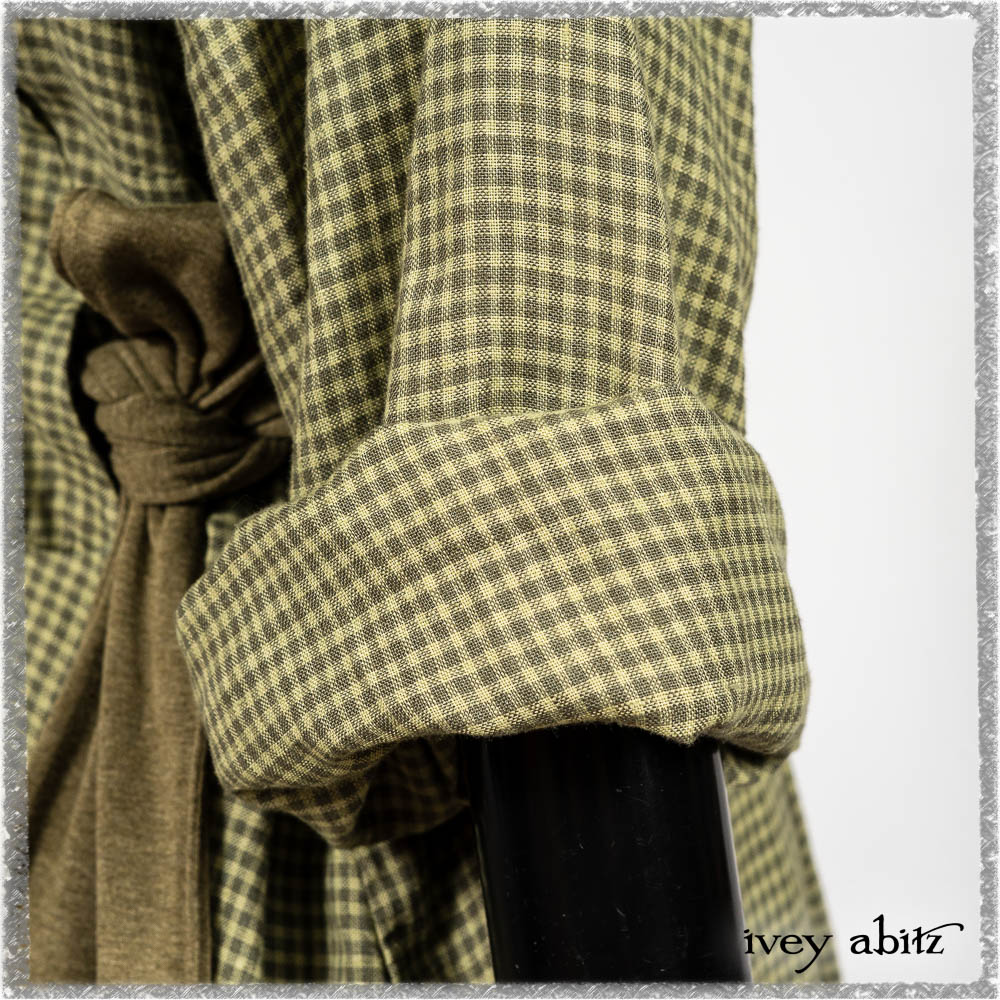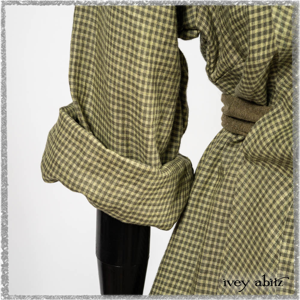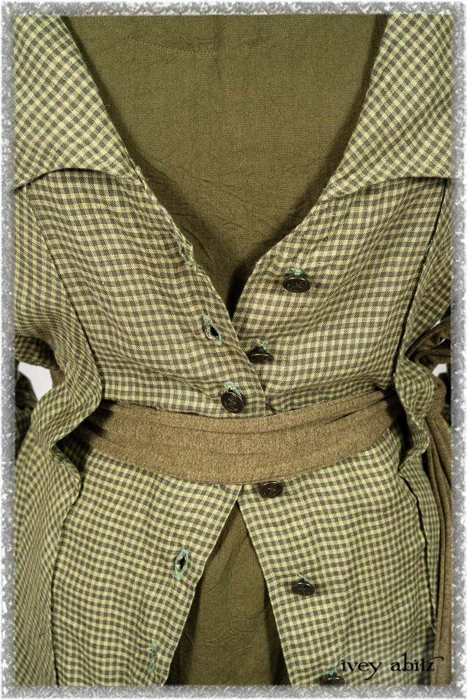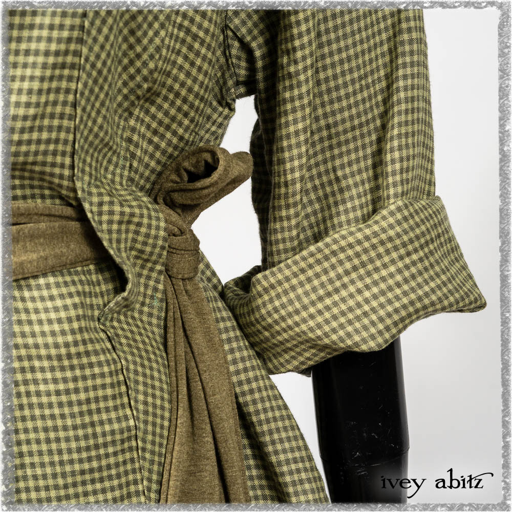 Vanetten Duster Coat in Seagrass Petite Check Linen; Saint Ans Sash in Woodlawn Melange Knit; Saint Ans Frock in Seagrass Crushed Cotton with mix of sculptural details created in rare weaves. Ivey Abitz bespoke clothing.