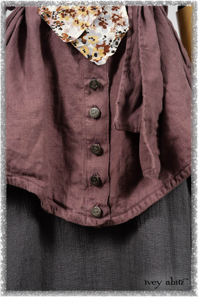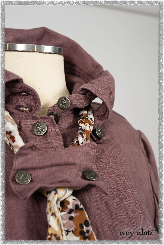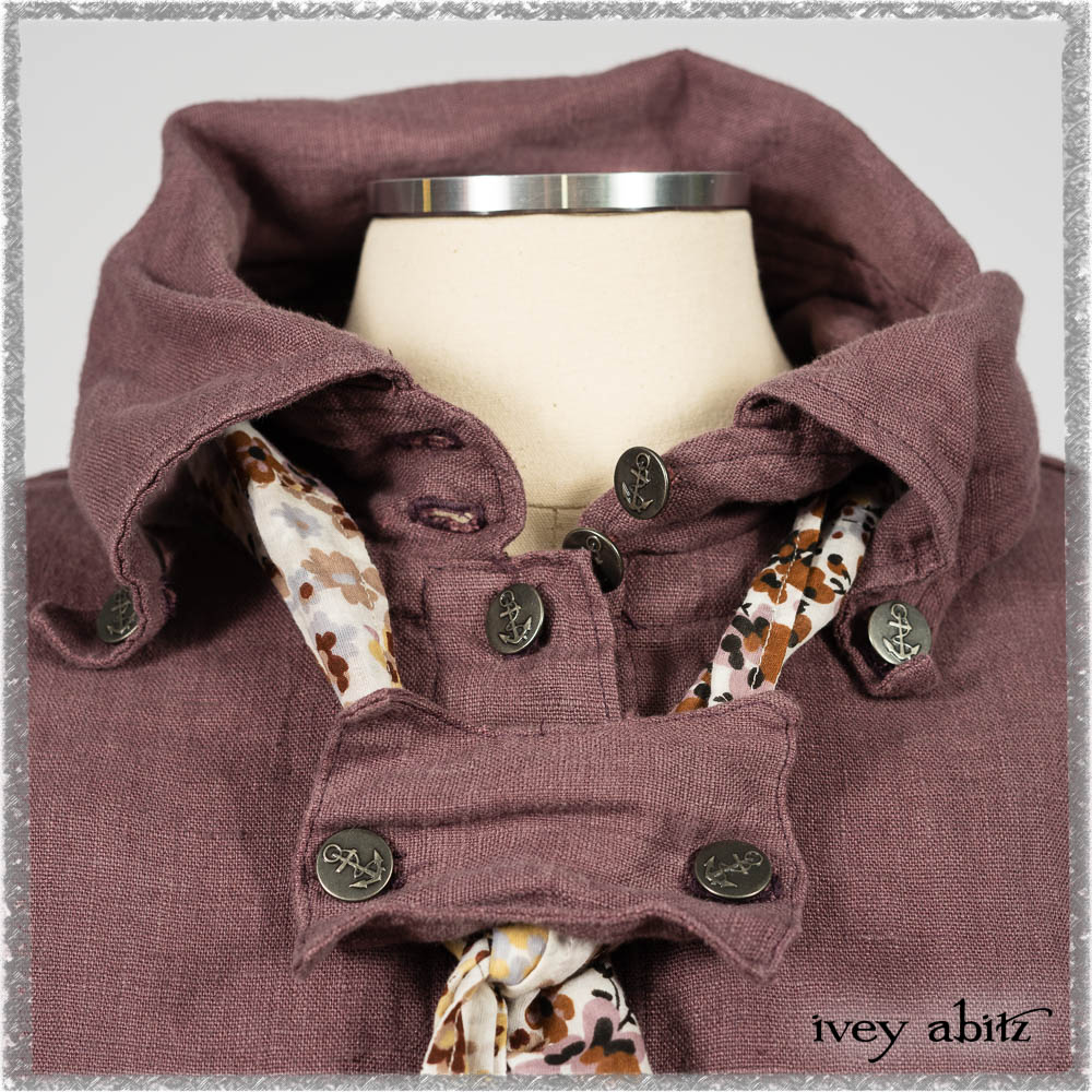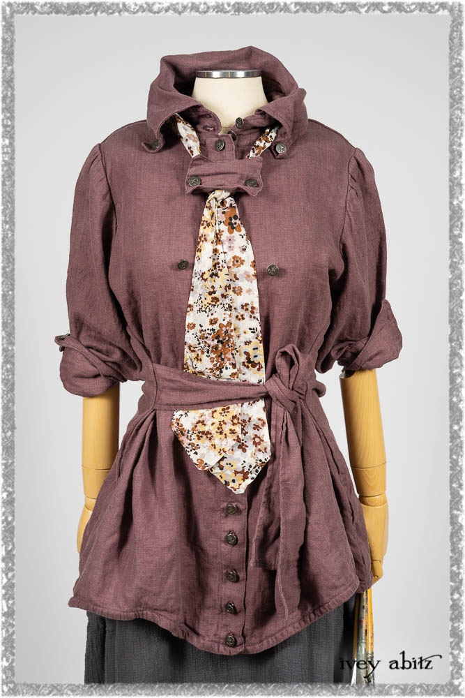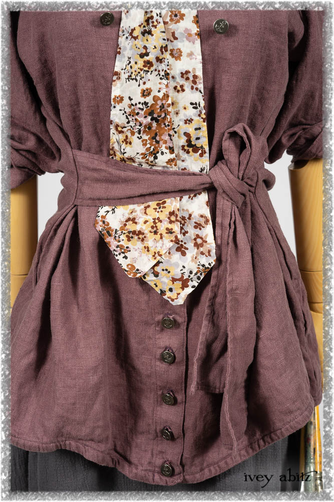 Fairholme Shirt in Plum Tree Washed Linen; Fairholme Necktie in Plum Tree Watercolour Floral Voile; Viv Frock in Anchor Grey and Plum Washed Check. Ivey Abitz bespoke clothing.