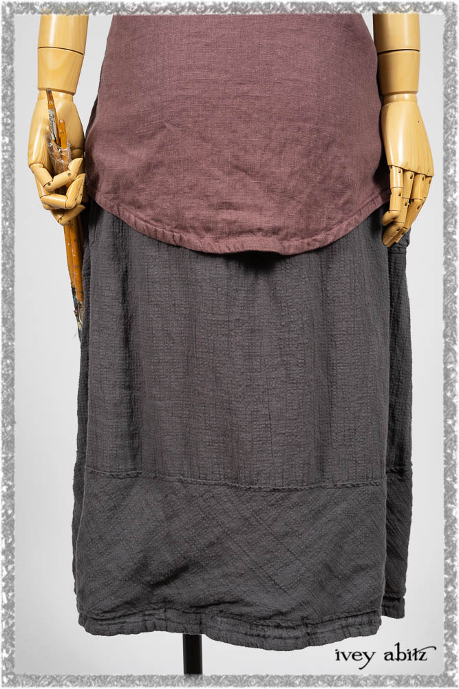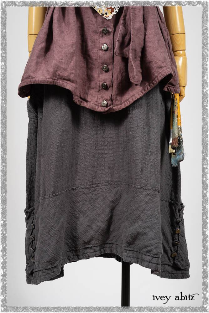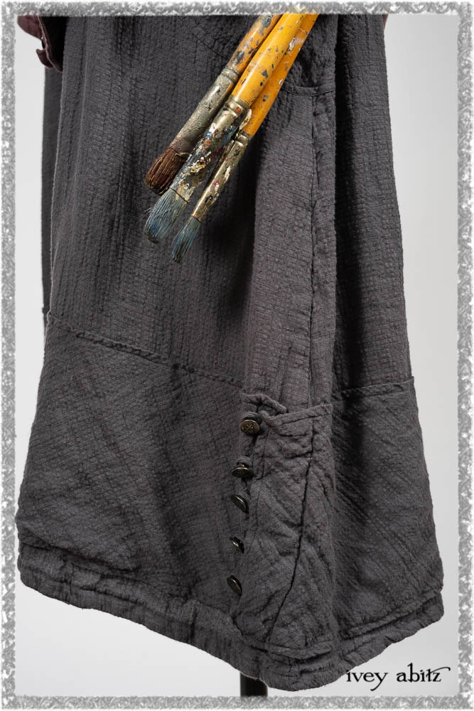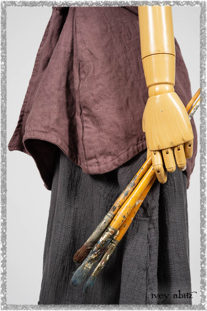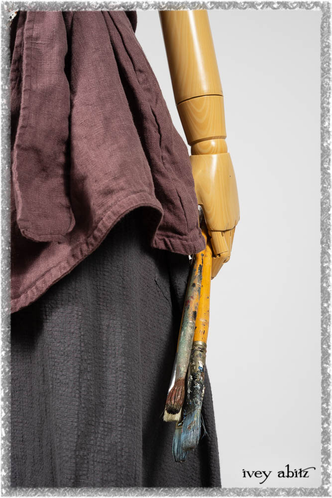 Fairholme Shirt in Plum Tree Washed Linen; Fairholme Necktie in Plum Tree Watercolour Floral Voile; Viv Frock in Anchor Grey and Plum Washed Check. Ivey Abitz bespoke clothing.