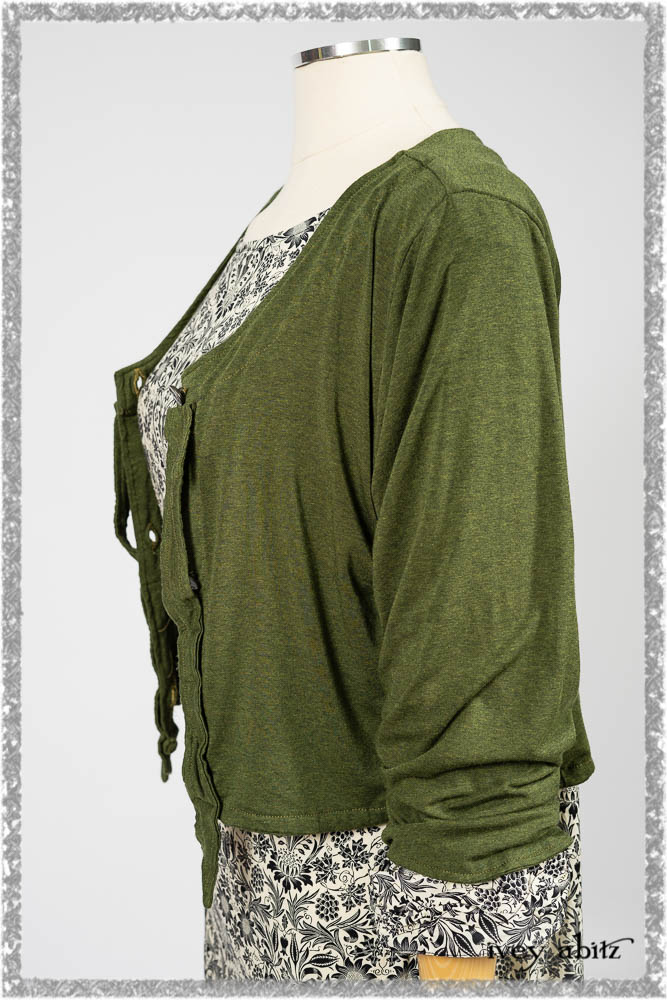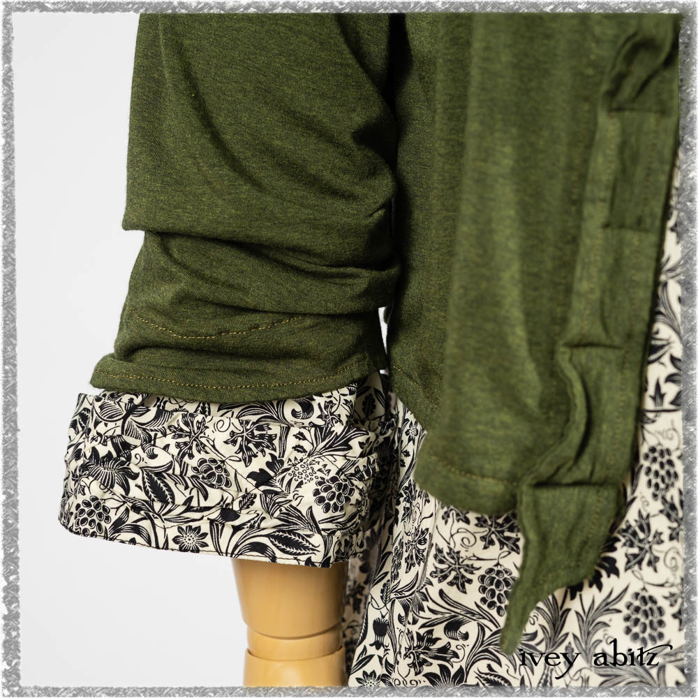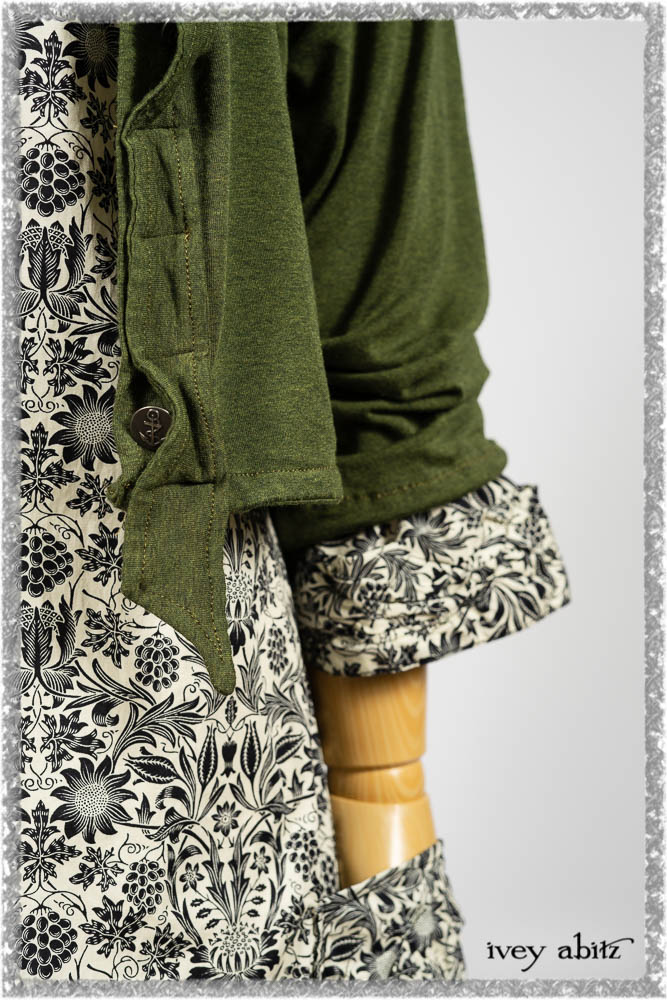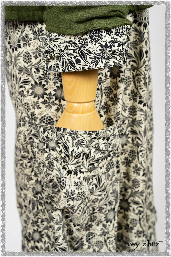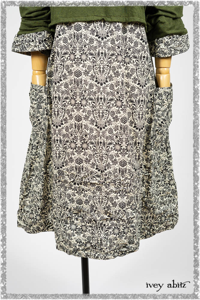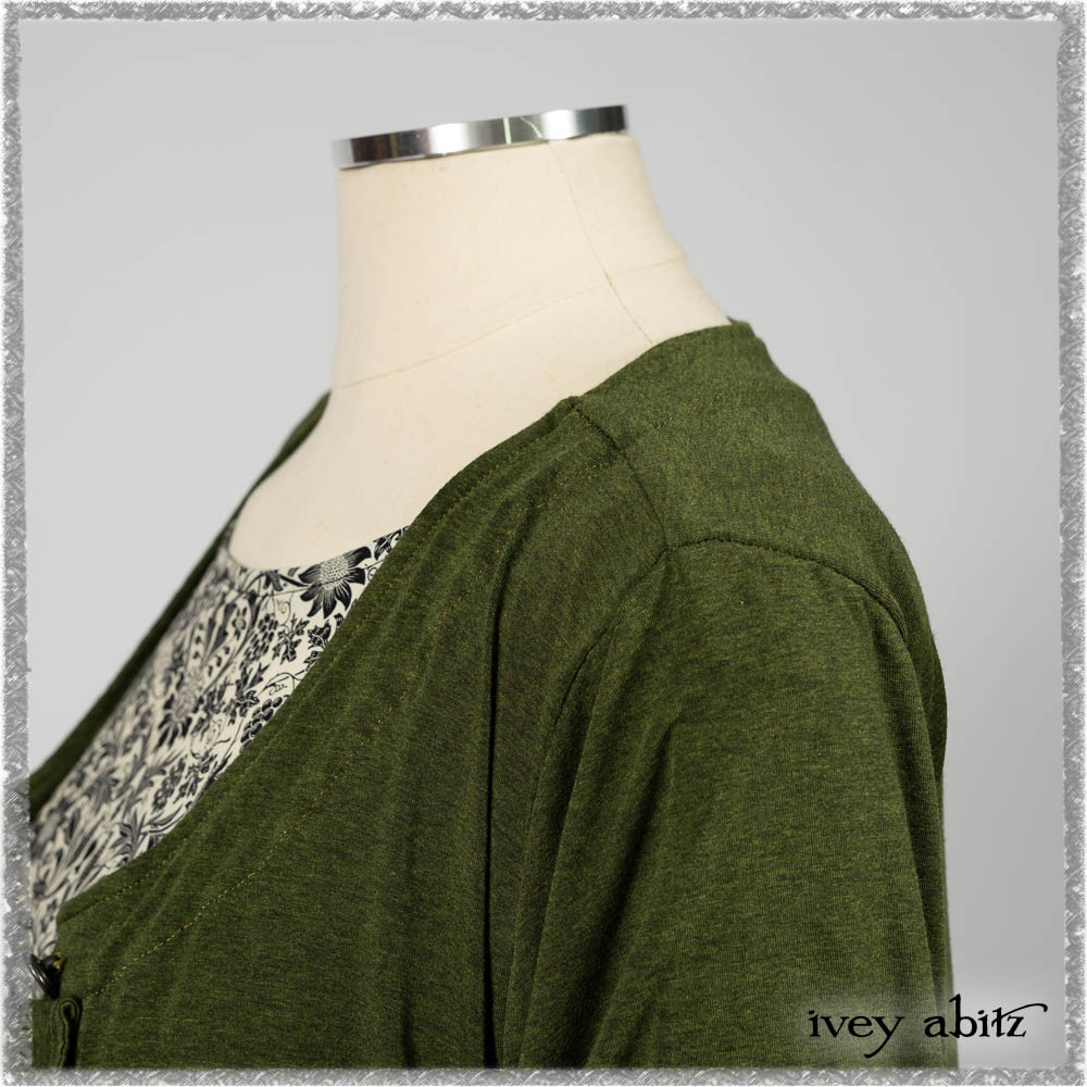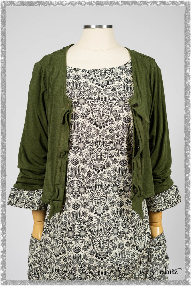 Tollie Dress in Ethereal Cream and Black Fleur Stretch Cotton; Chevallier Cardigan in Seagrass Melange Knit. Ivey Abitz bespoke clothing.