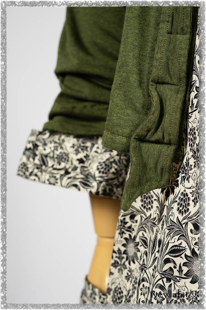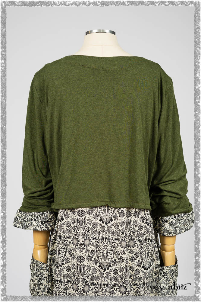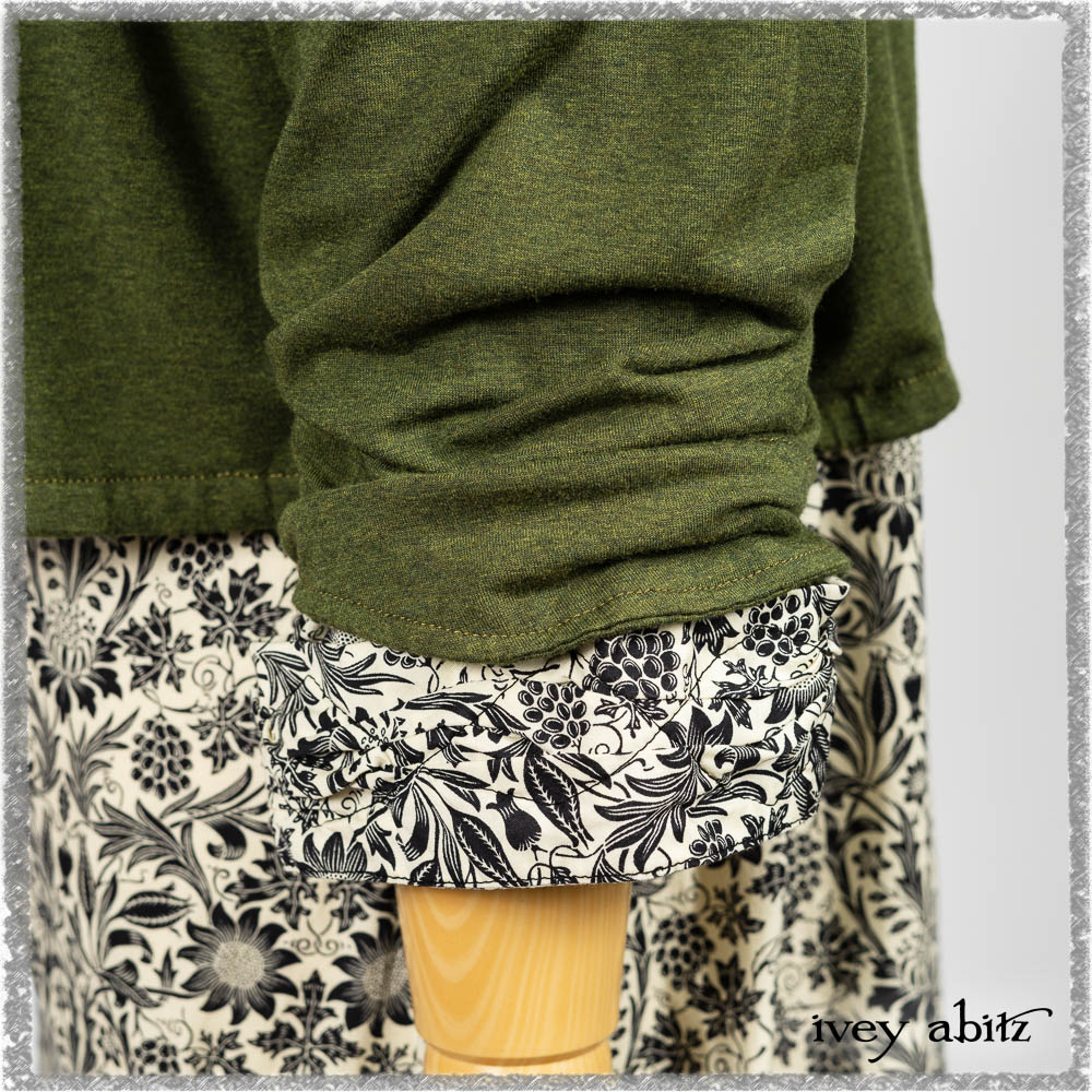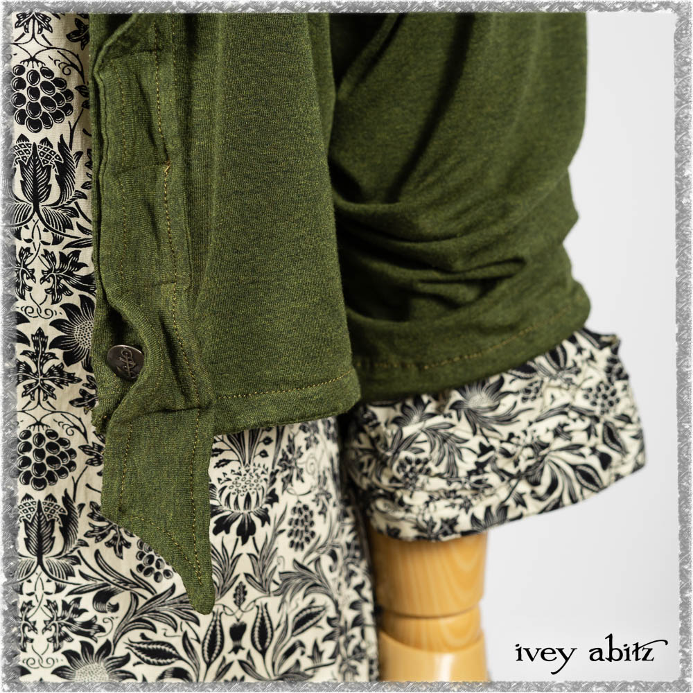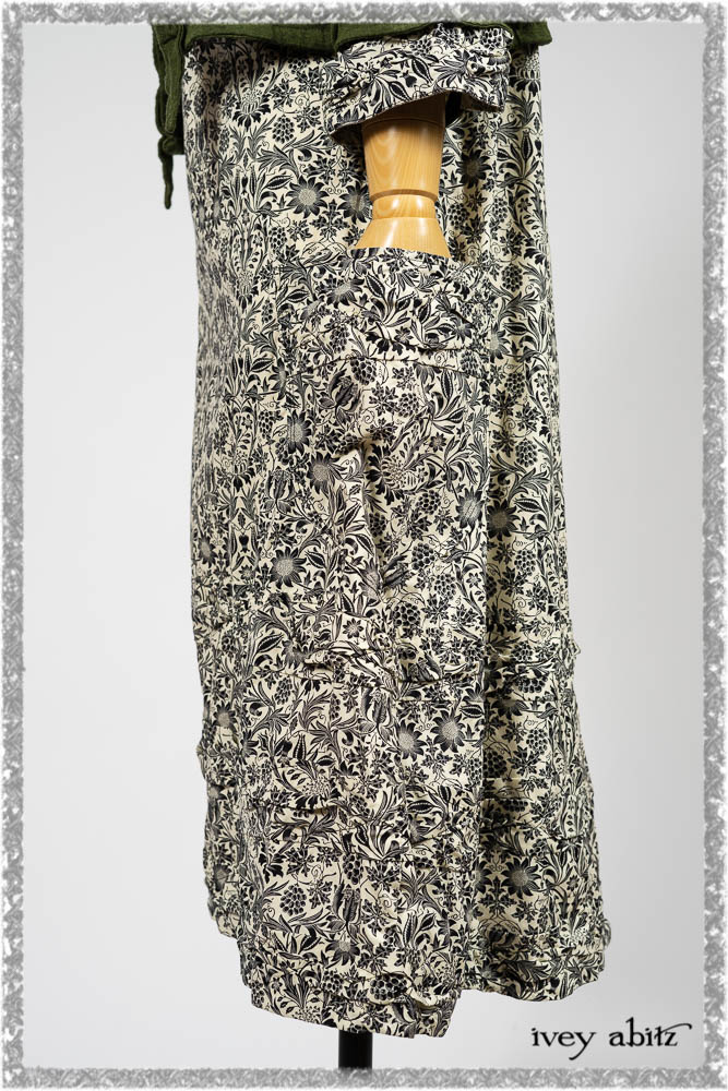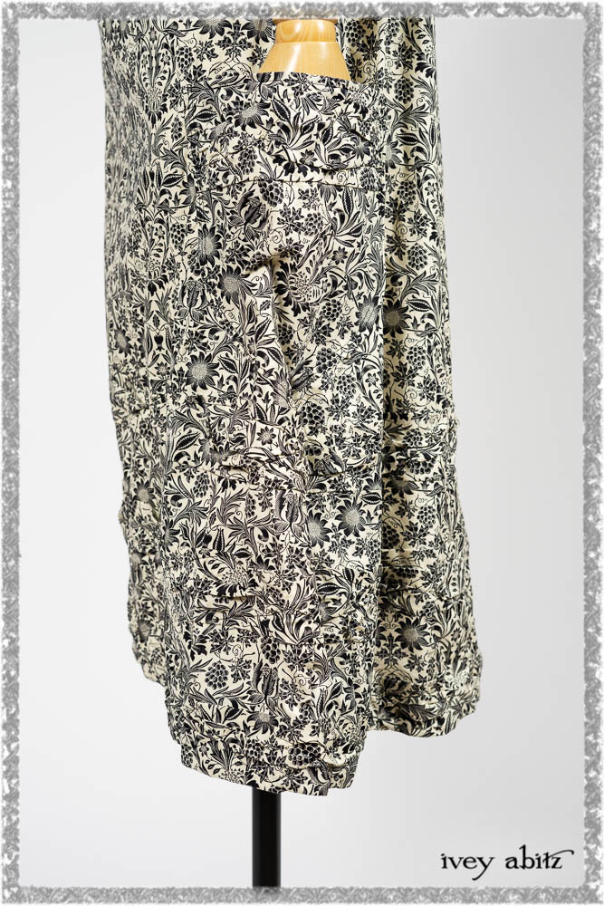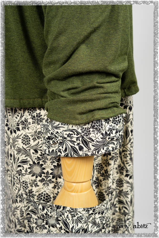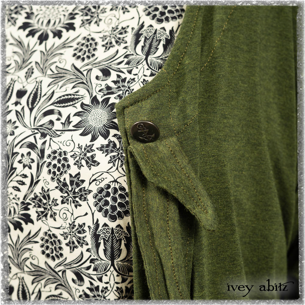 Tollie Dress in Ethereal Cream and Black Fleur Stretch Cotton; Chevallier Cardigan in Seagrass Melange Knit. Ivey Abitz bespoke clothing.