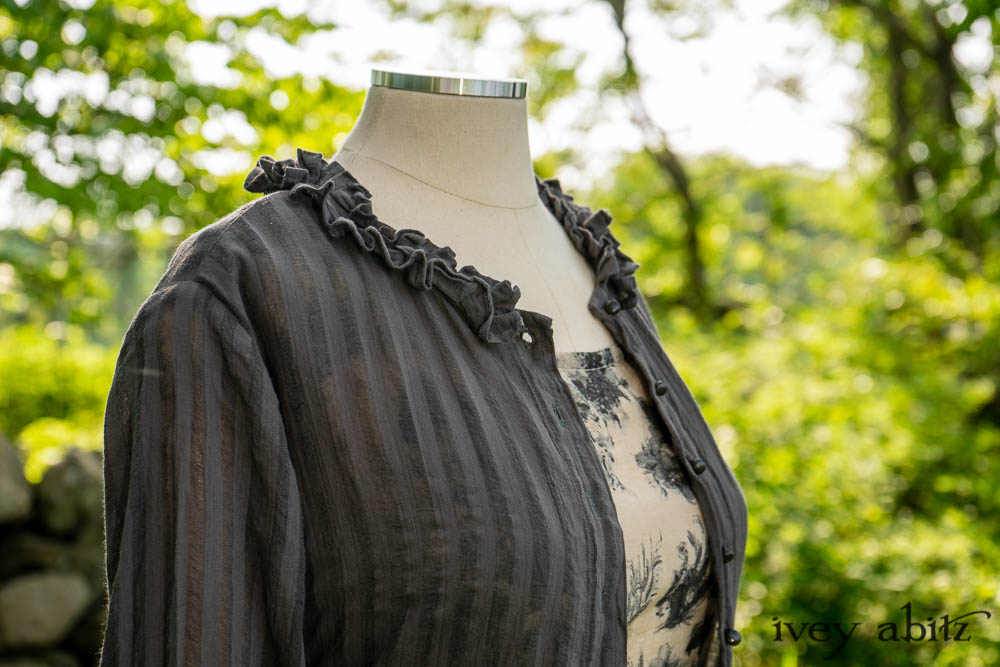 • Tilbrook Duster Coat in Grey Garden Stripe Gauze • Blanchefleur Sash in Grey Garden Floral Silk Voile • Tilbrook Frock in Grey Garden Floral Silk Voile• Cilla Slip Frock in Cream Silk Knit. Bespoke clothing designed by Cynthia Ivey Abitz.