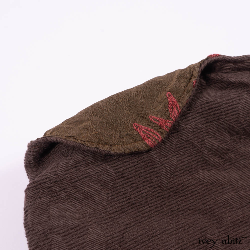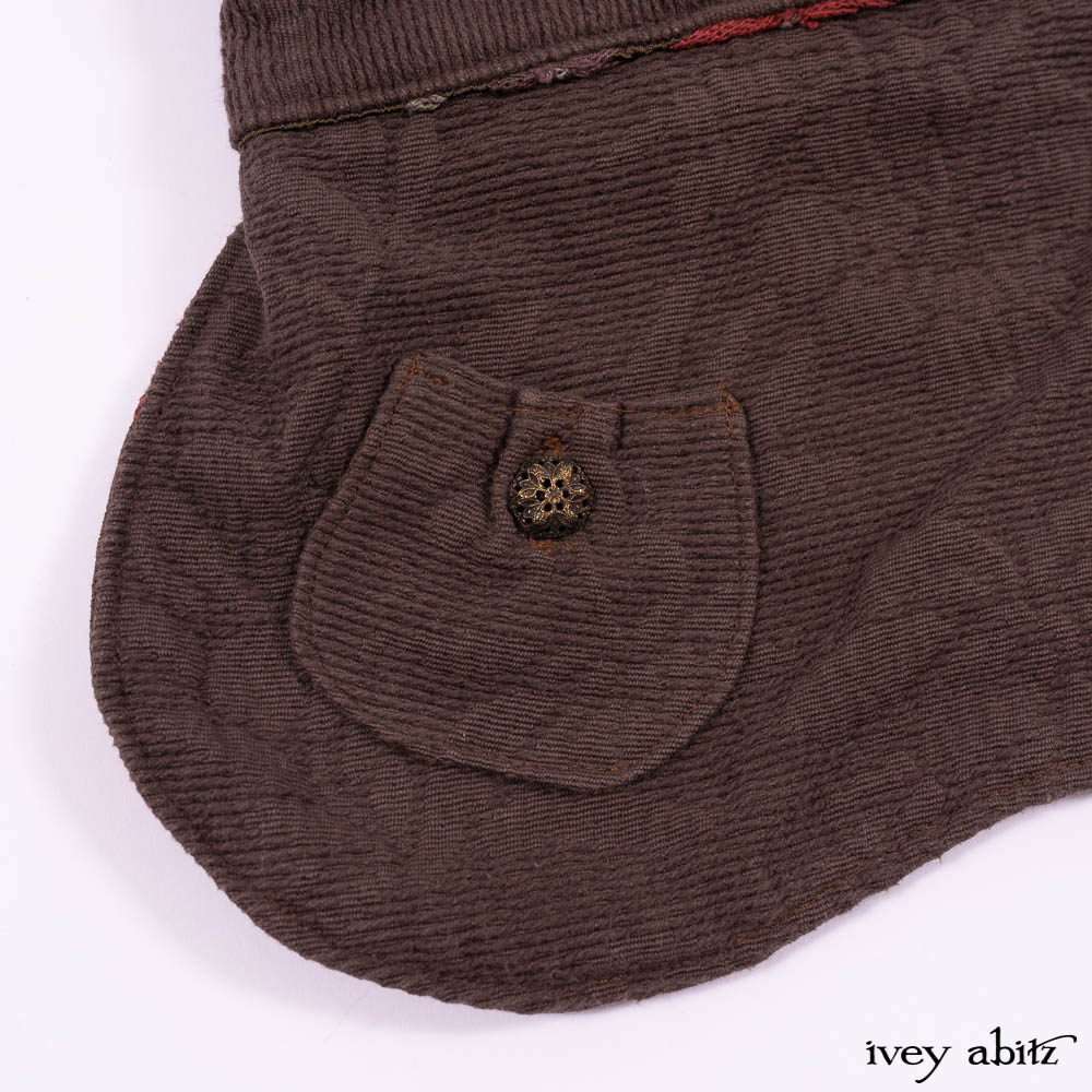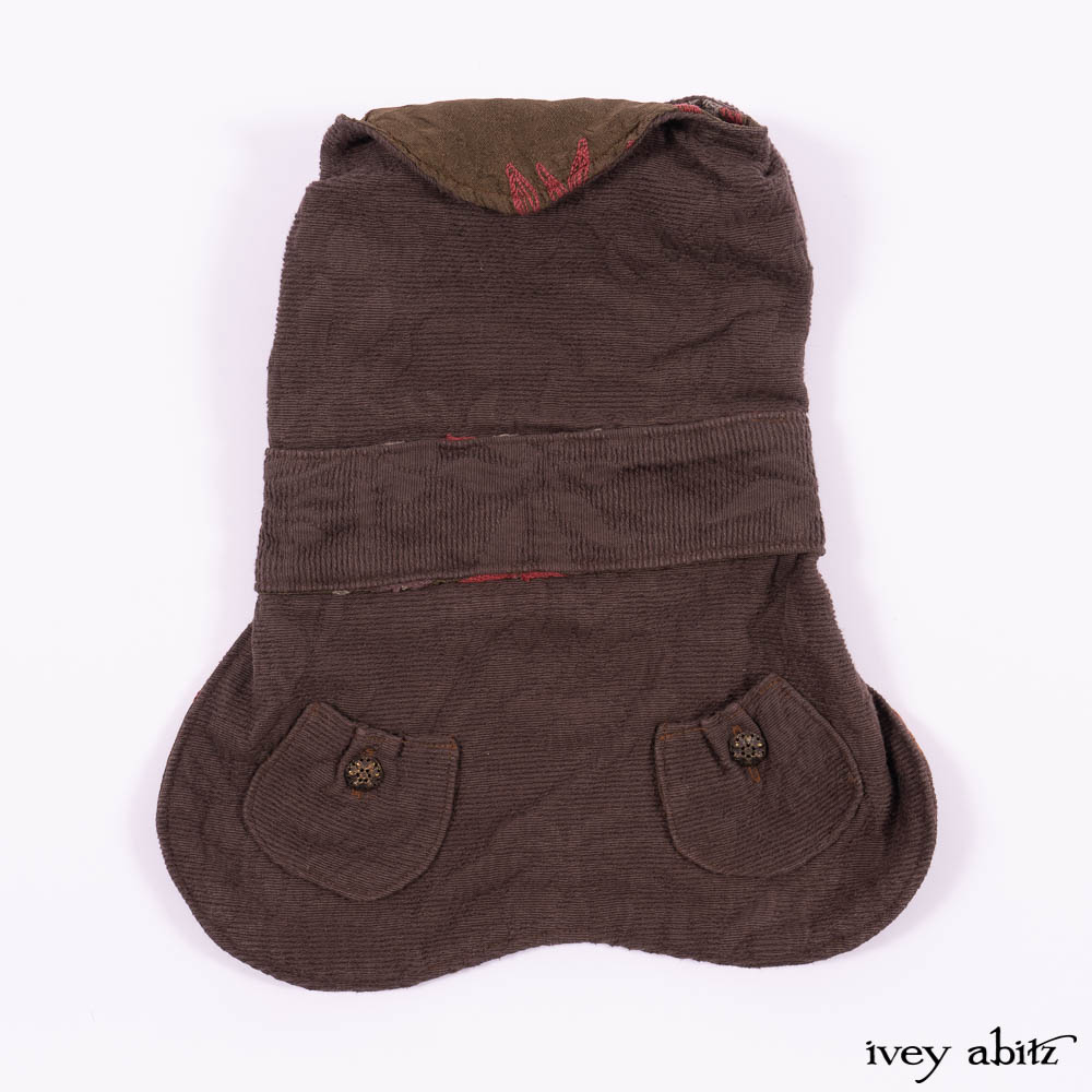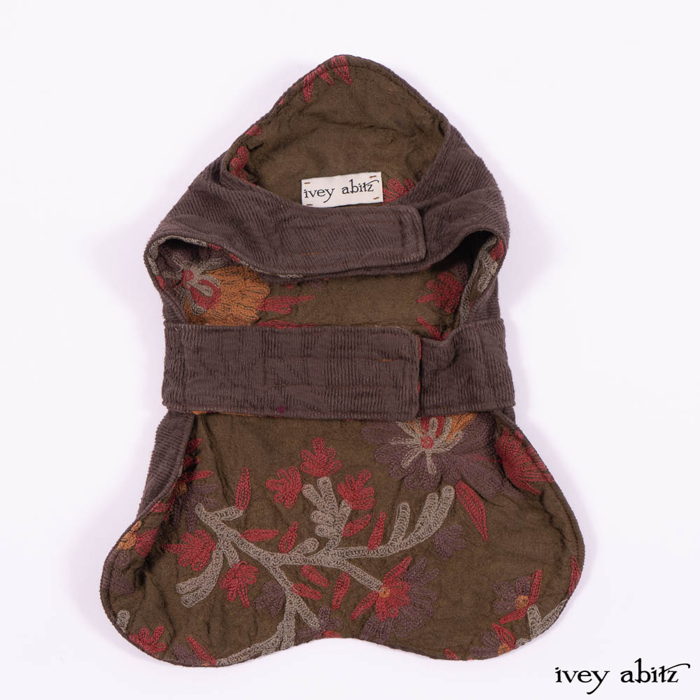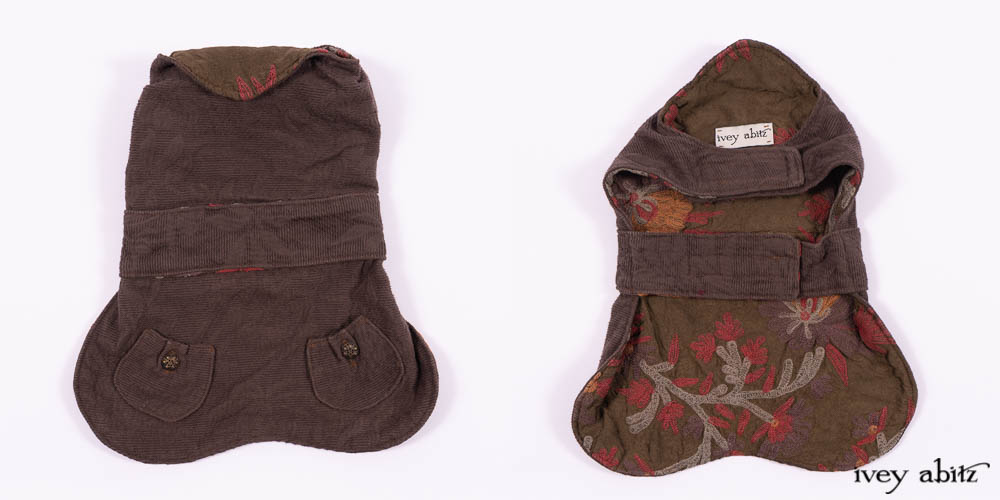 Our Lilibet Coat for canines is created with soft brown cotton jacquard from France. It is fully lined the most extraordinary embroidered crewel work silk. Functional pockets allow you to keep “poo bags” inside of them for easy access during a walk. The pockets are adorned with vintage buttons.