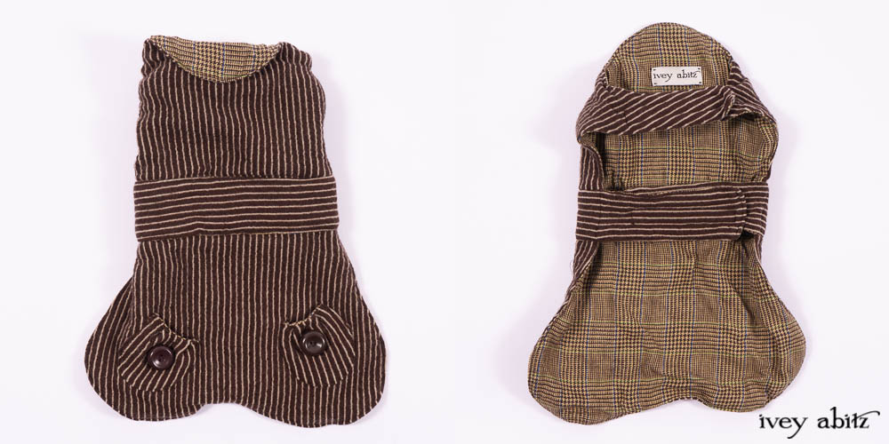 Our Hyde Park Coat for canines is created with a stunning embroidered stripe wool on the exterior. It is fully lined with a smart and smooth plaid linen. Two functional pockets allow you to keep “poo bags” inside of them for easy access during a walk. The pockets are adorned with rare antique wooden buttons from England with their original antique patina.