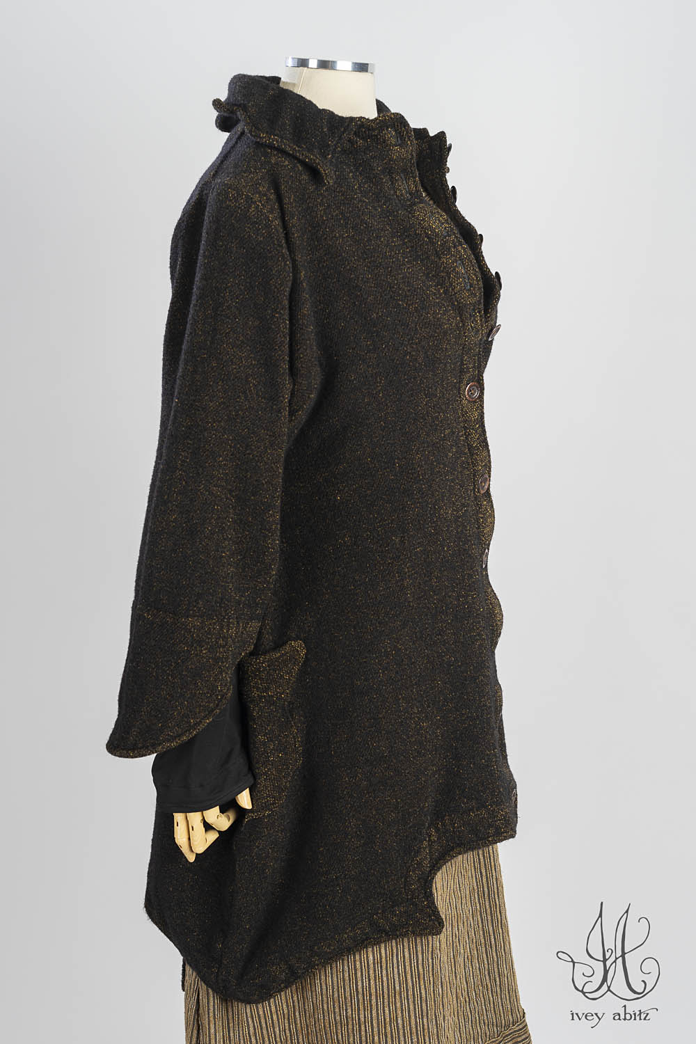 - Pockets, sleeve edges, and bottom hem follow suit, curving and coming to points with confident ease.