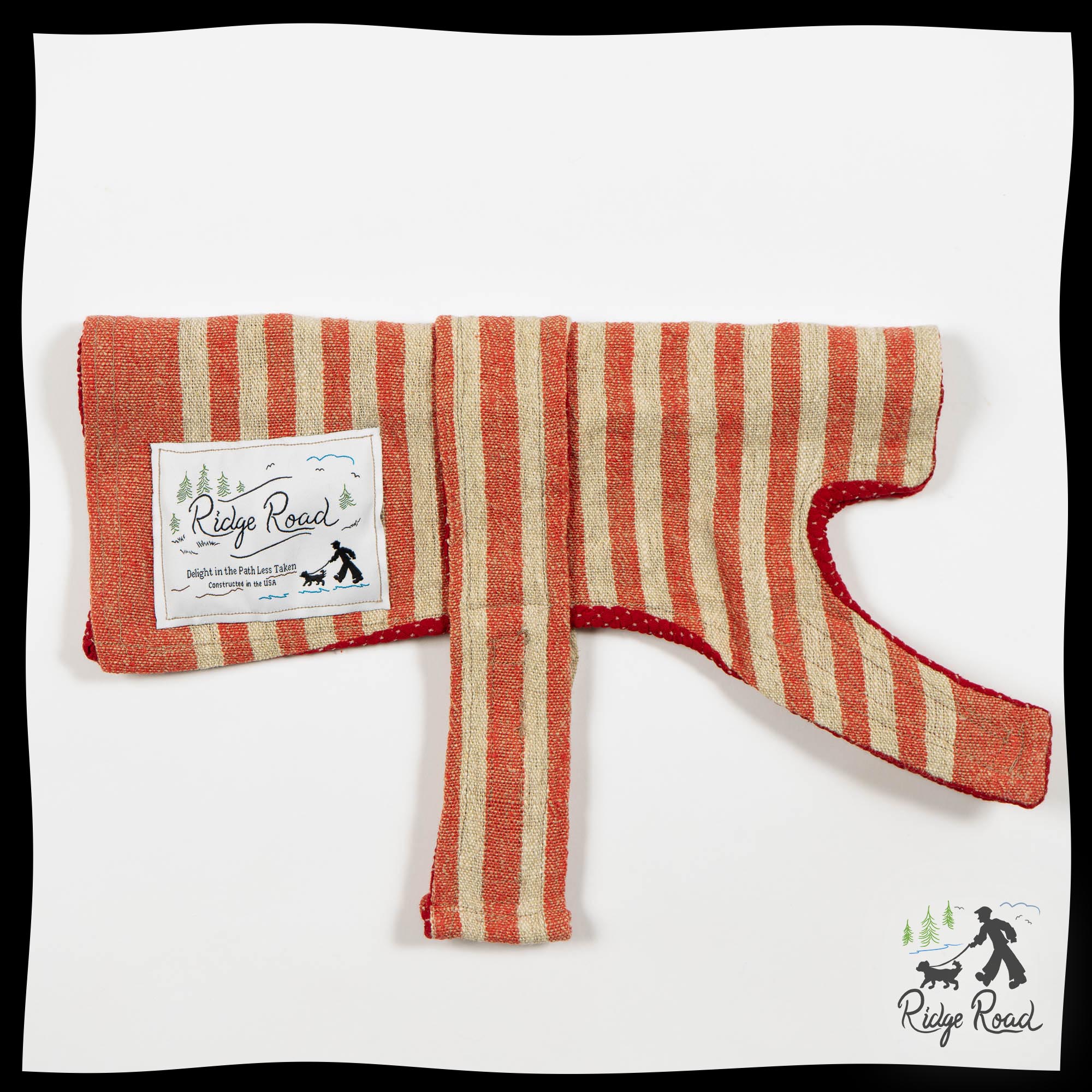 Red and natural hues in our rugged and refined stripe weave are the main part of the coat. It is lined with our strawberry cottage red puckered knit.