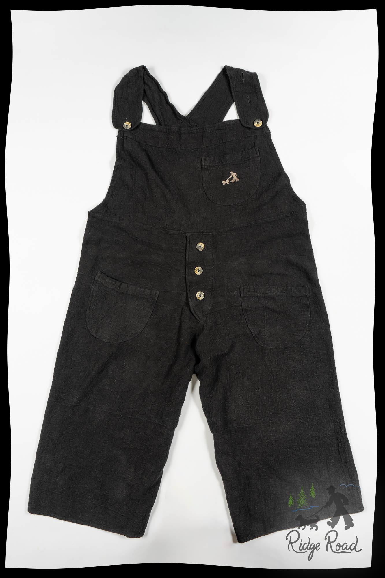 2.) Flat front and back at the waist. A hidden working button fly is there, if needed. Waist is intentionally loose for easy movement. Wear a sash around the waist to dress up these workaday overalls. Or let the overall straps do the work keeping things up. Straps are adjustable to give you various lengths, all in one pair.