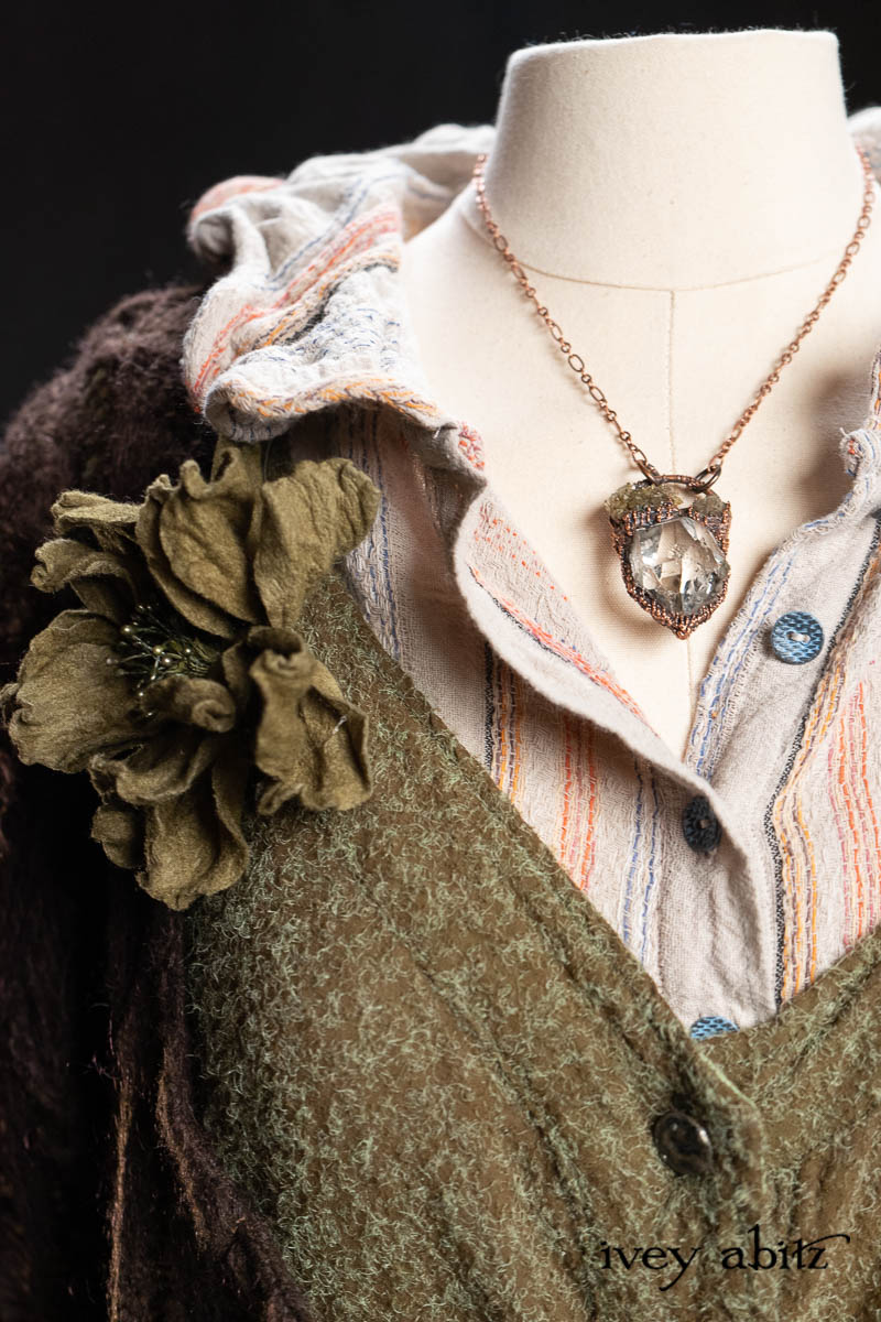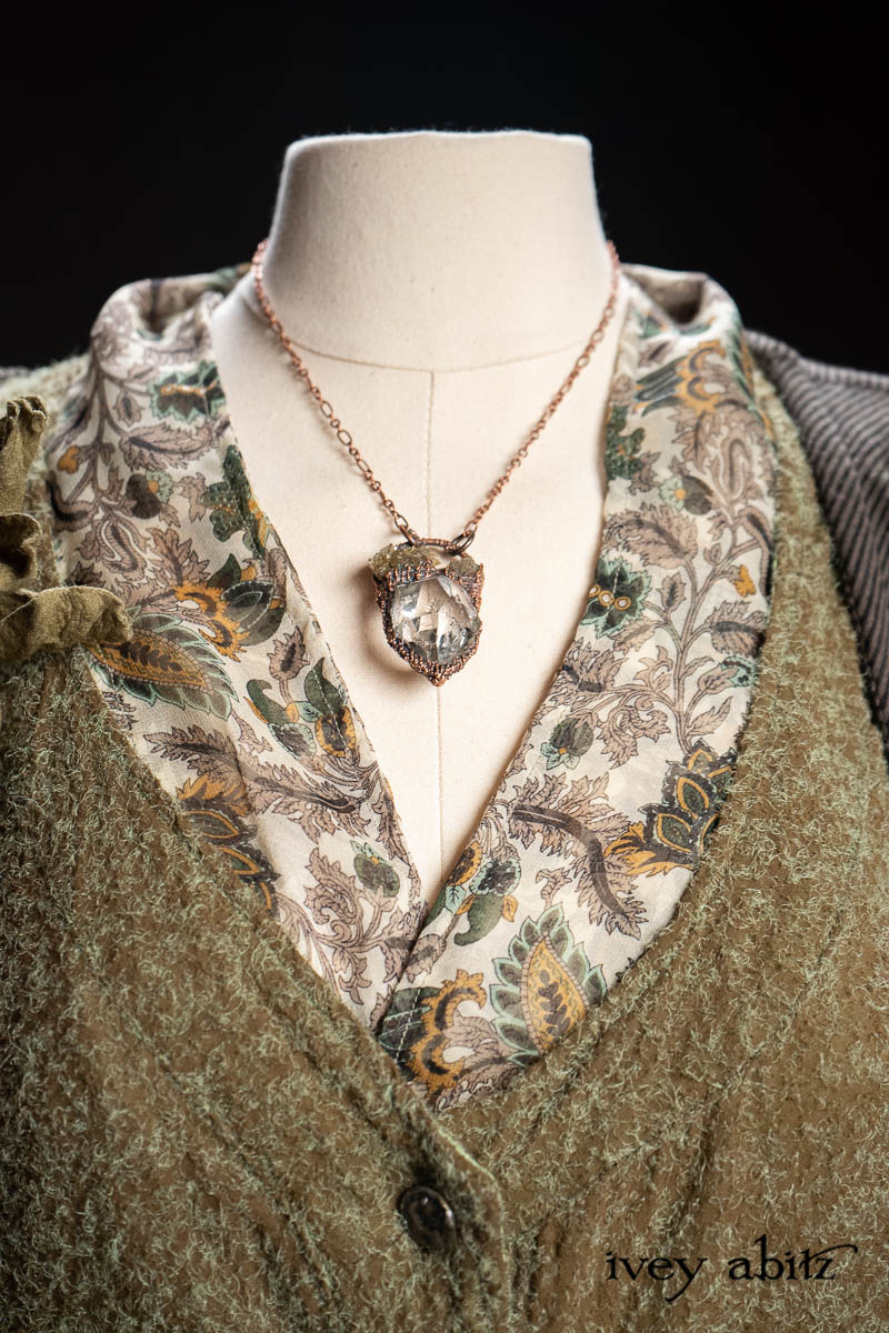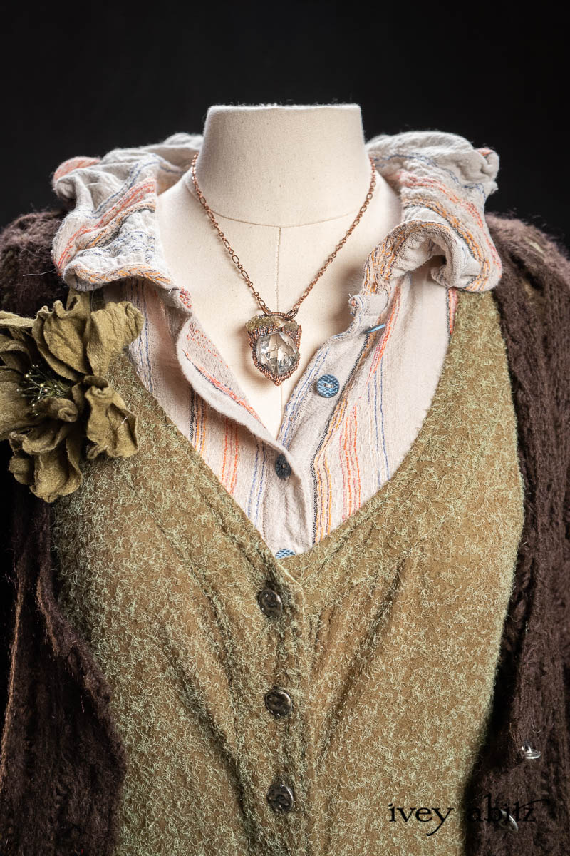 Wear the Heirloom with ALL Ivey Abitz ensembles for a bold accoutrement! The length of the chain is adjustable, so it can be worn with any of our necklines. Just take extra care when wearing it with our silk chiffons as some of the facets can catch on the finely spun weaves.