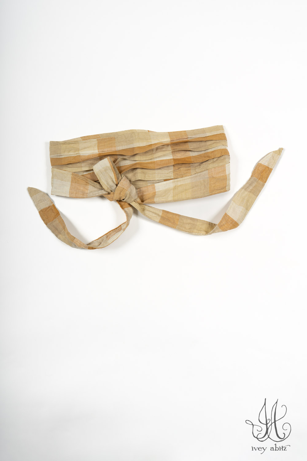Tie around the waist as a waistband or cummerbund. Wrap around a hat for a band of colour and texture.
