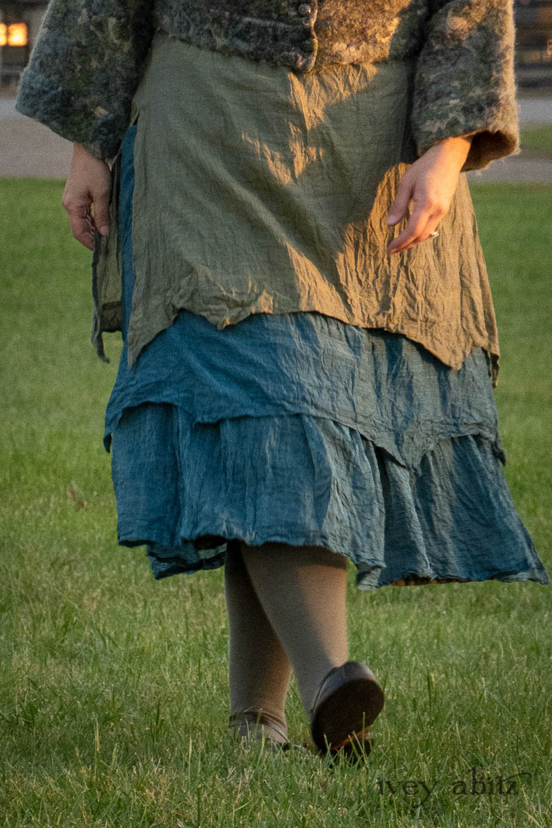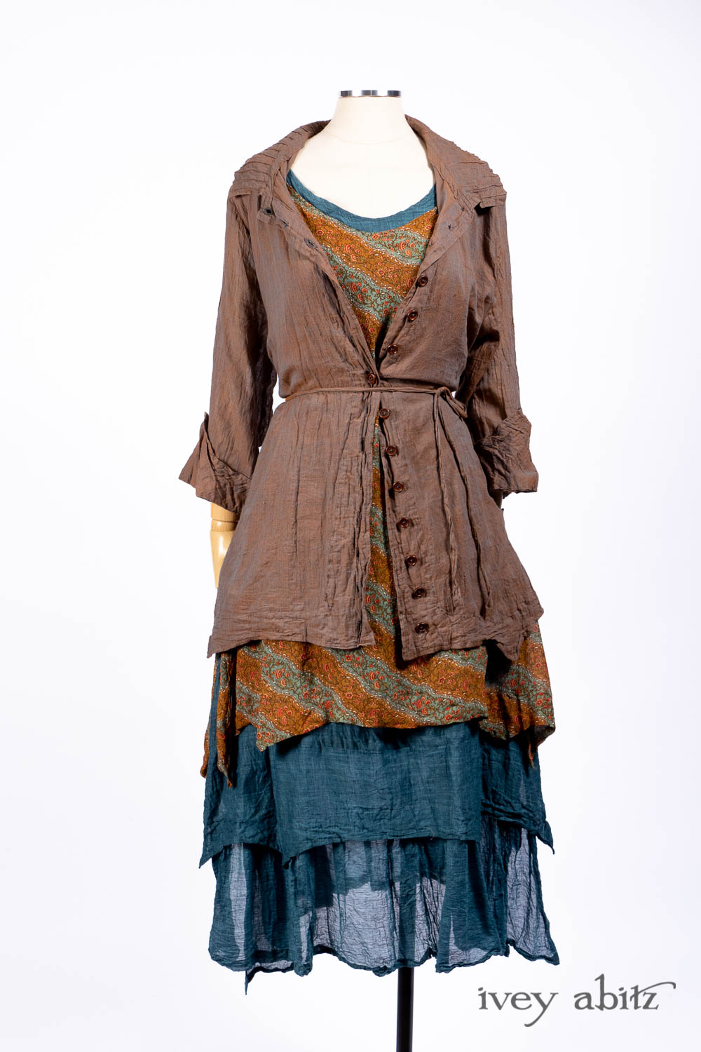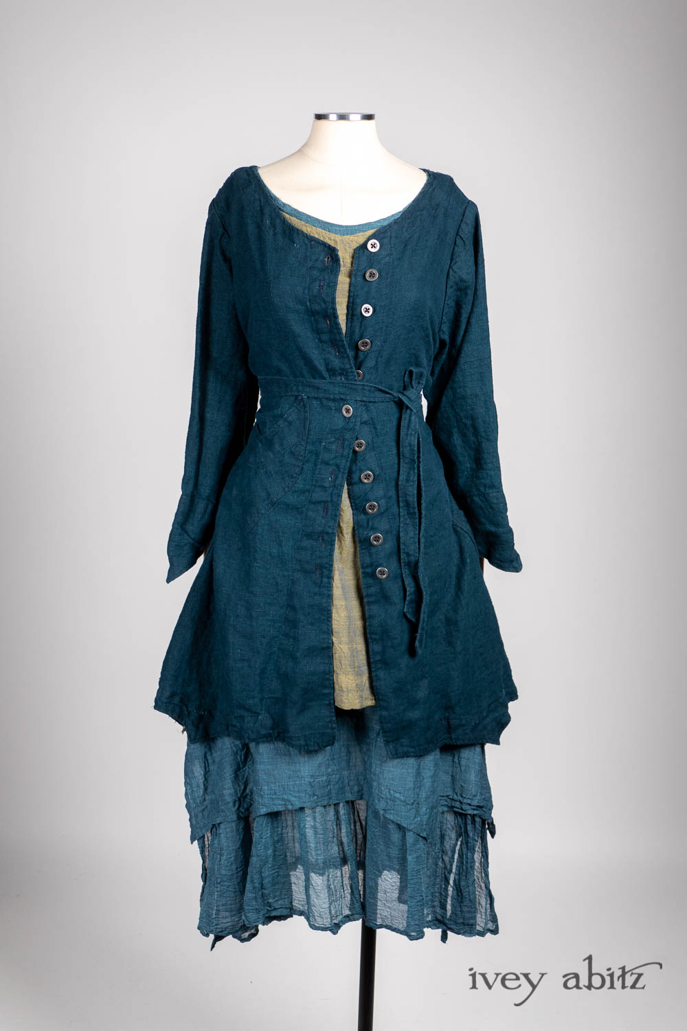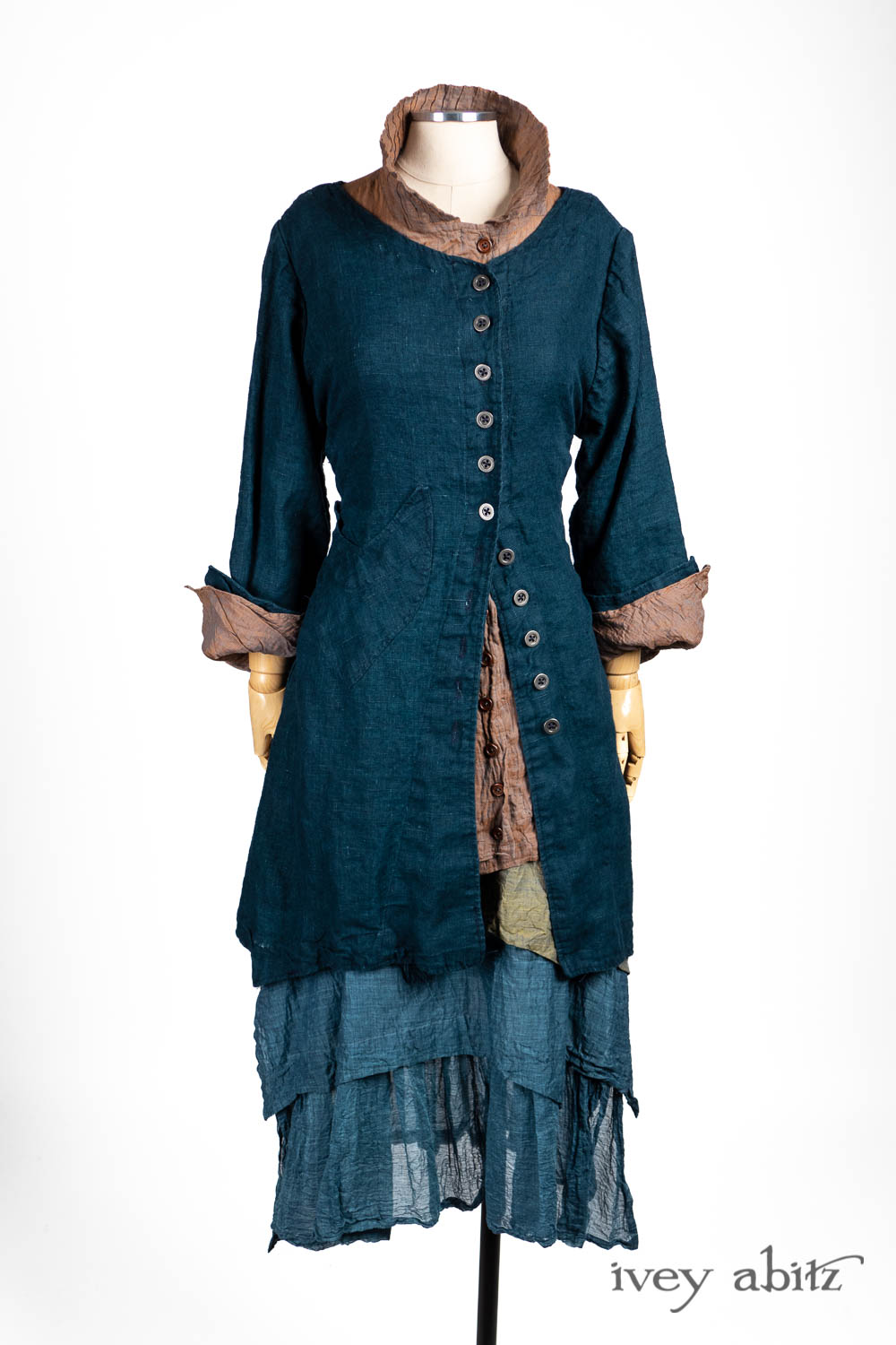 The Liberté Frock is meant to be worn with the other designs in the Liberté, Ellis, and Bartholdi collections. The Bedloe Frock is its companion layering piece. Because it has such relevant design details that echo many other design collections here at Ivey Abitz, it can be mixed and matched with so many things. The Camille Frock, for example. The Chittister designs. All of our shorter jackets like the Eugenia. The list goes on and on…